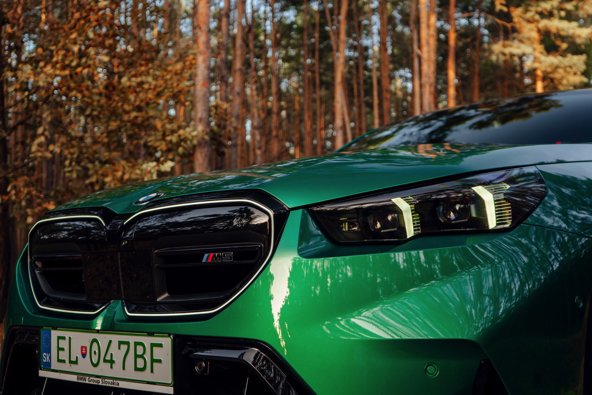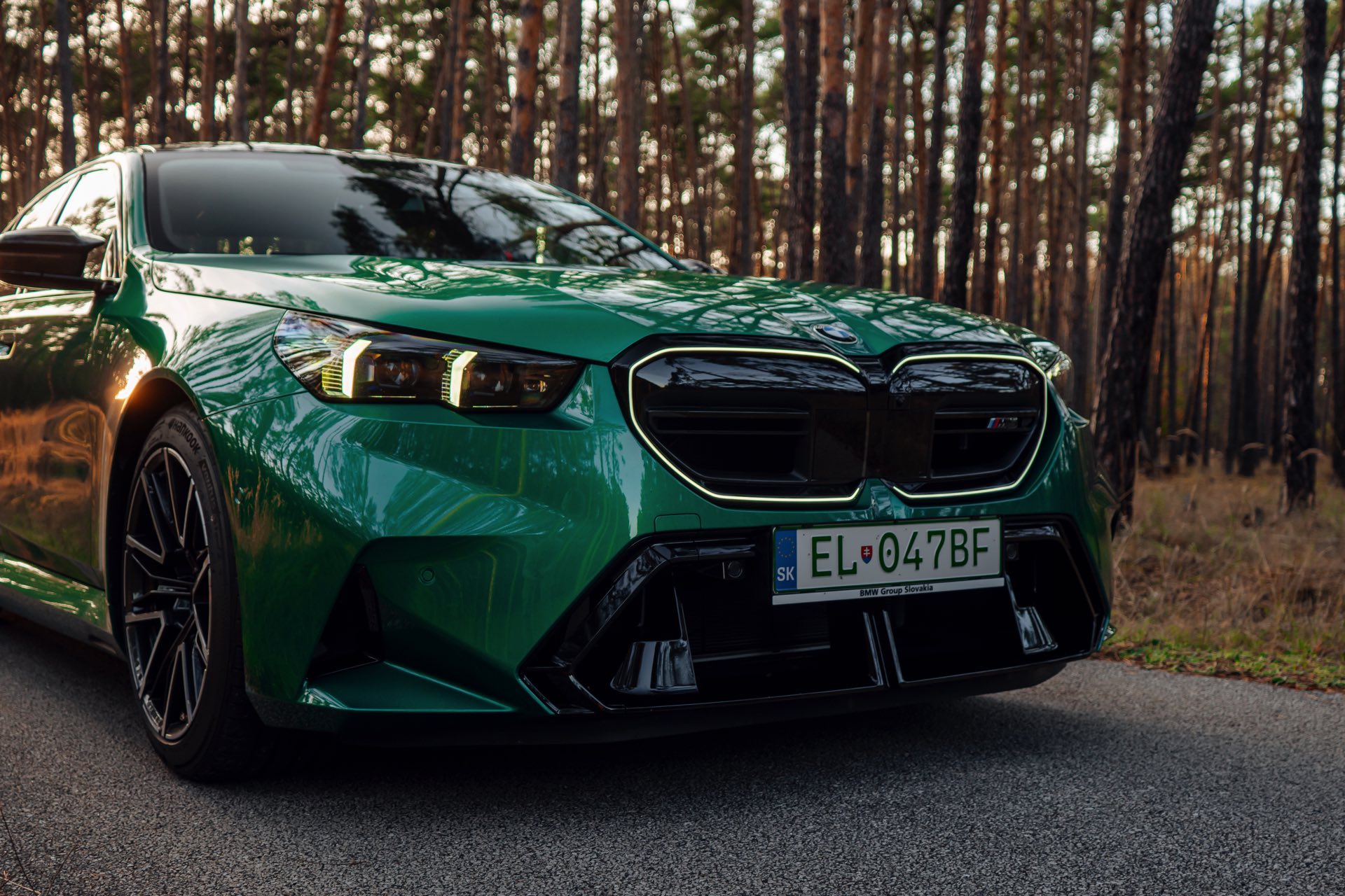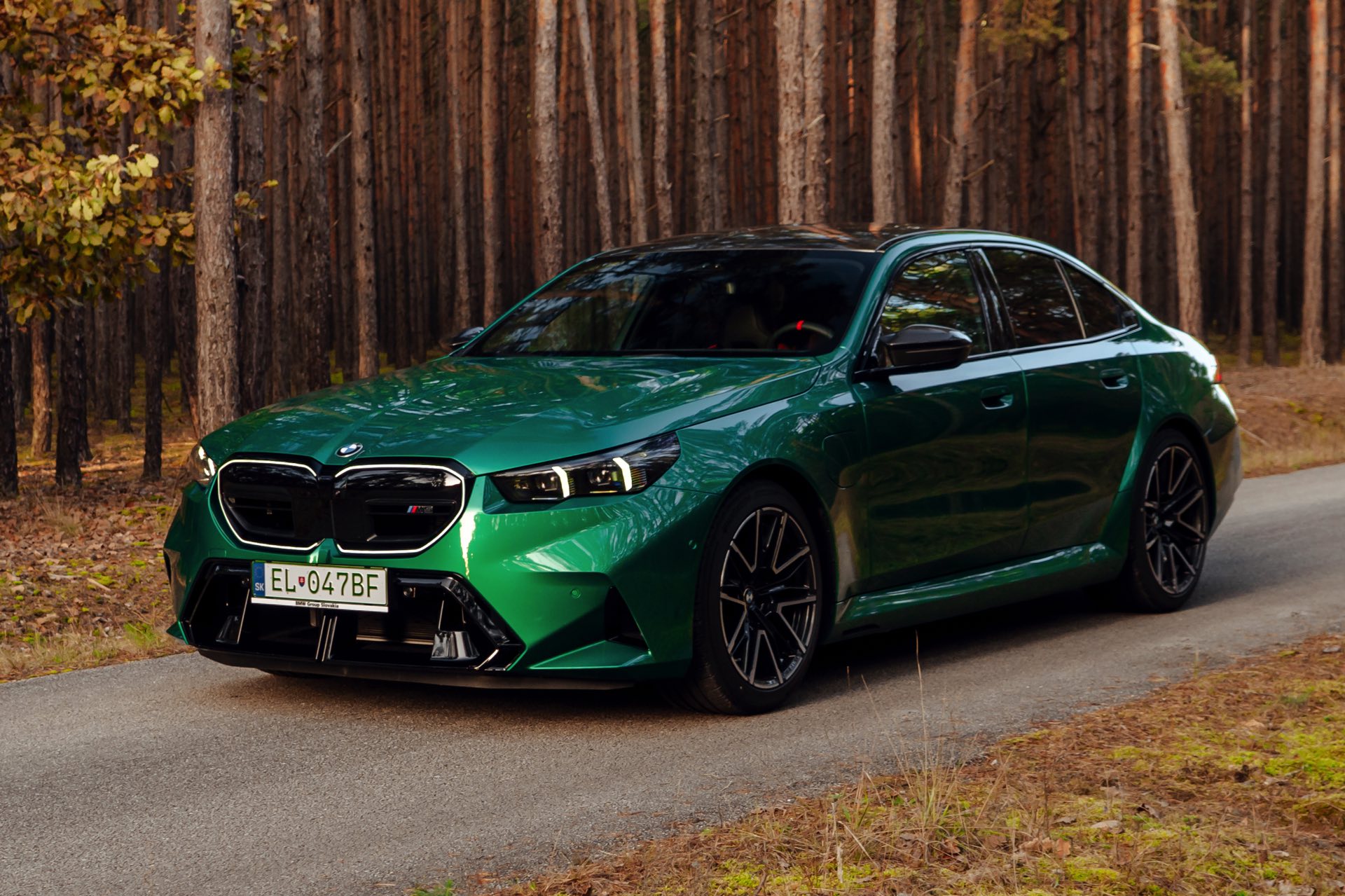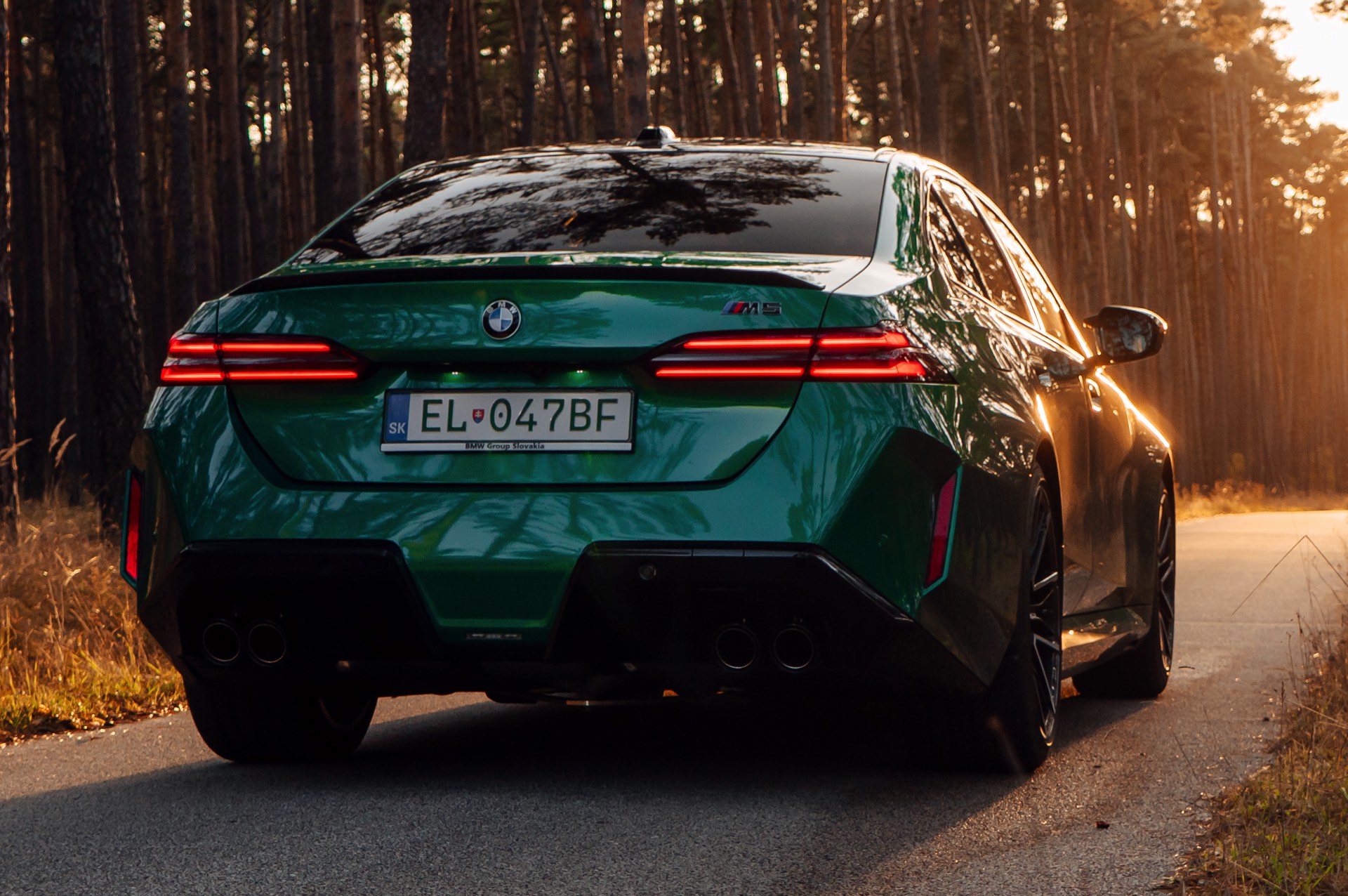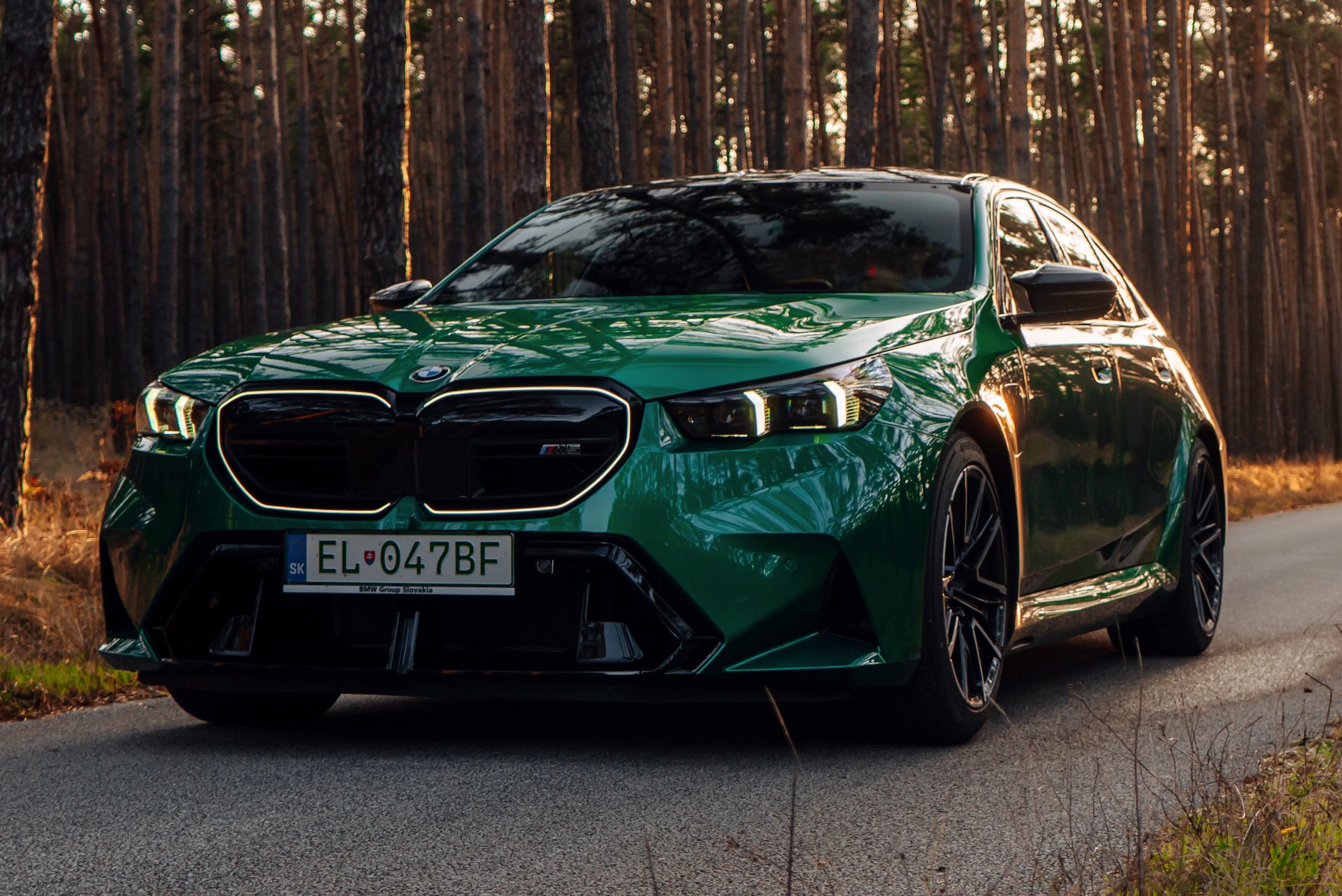 Noch leichter wird die Erkennung des neuen BMW M5, wenn sich der Kunde für eine etwas auffälligere Farbe entschieden hat: Aktuelle Fotos aus der Slowakei zeigen uns den G90 in Isle of Man Green – und auch wenn das intensive Grün zum regulären Farbprogramm für den M5 zählt, ist die Lackierung ohne Frage ein echter Hingucker. Beim gezeigten M5 sehen wir außerdem das optionale Carbon-Dach, das in der Mitte über eine leichte Vertiefung verfügt und sich auch damit vom Look des serienmäßig verbauten Panorama-Glasdachs mit schwarzer Einfassung abgrenzt.