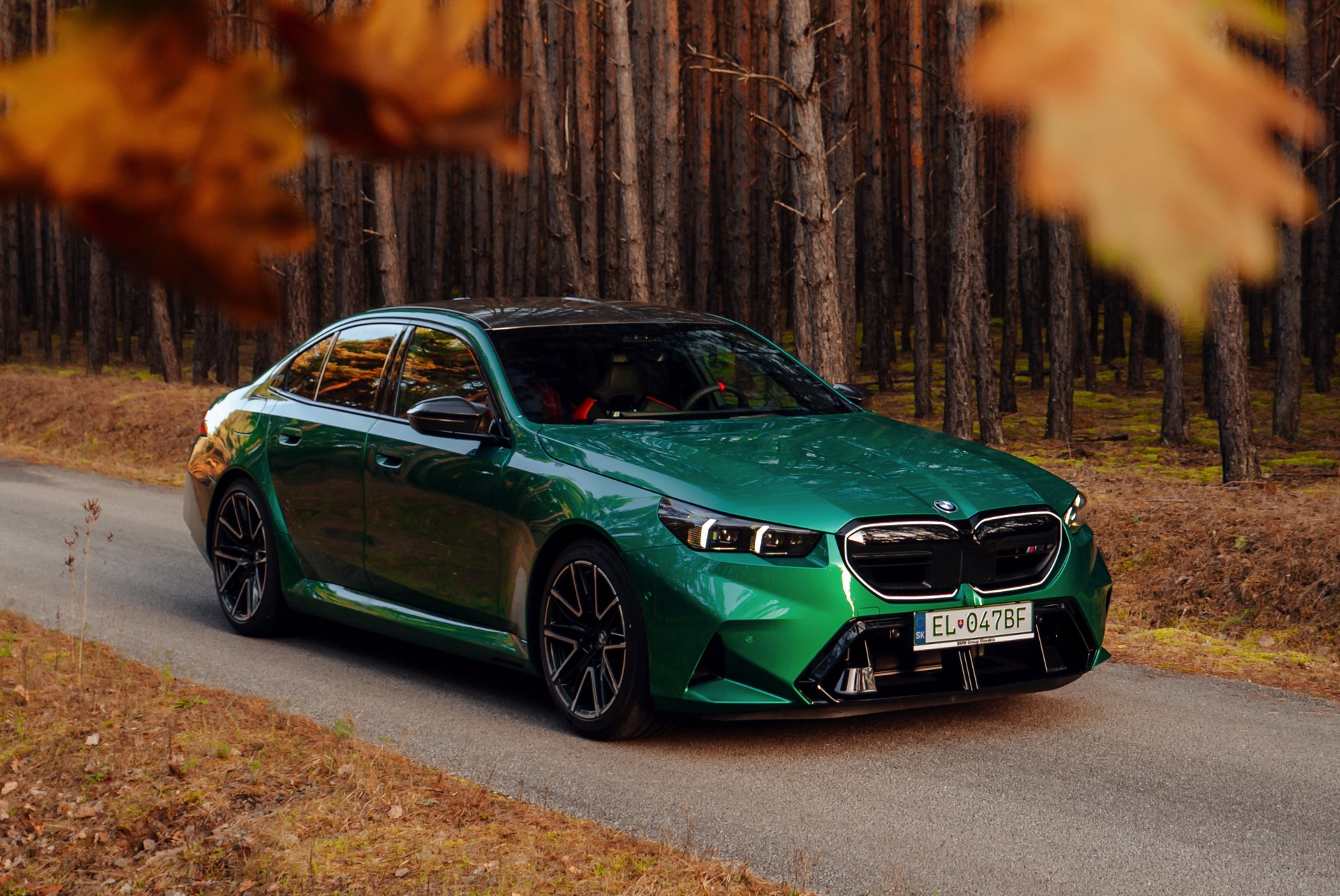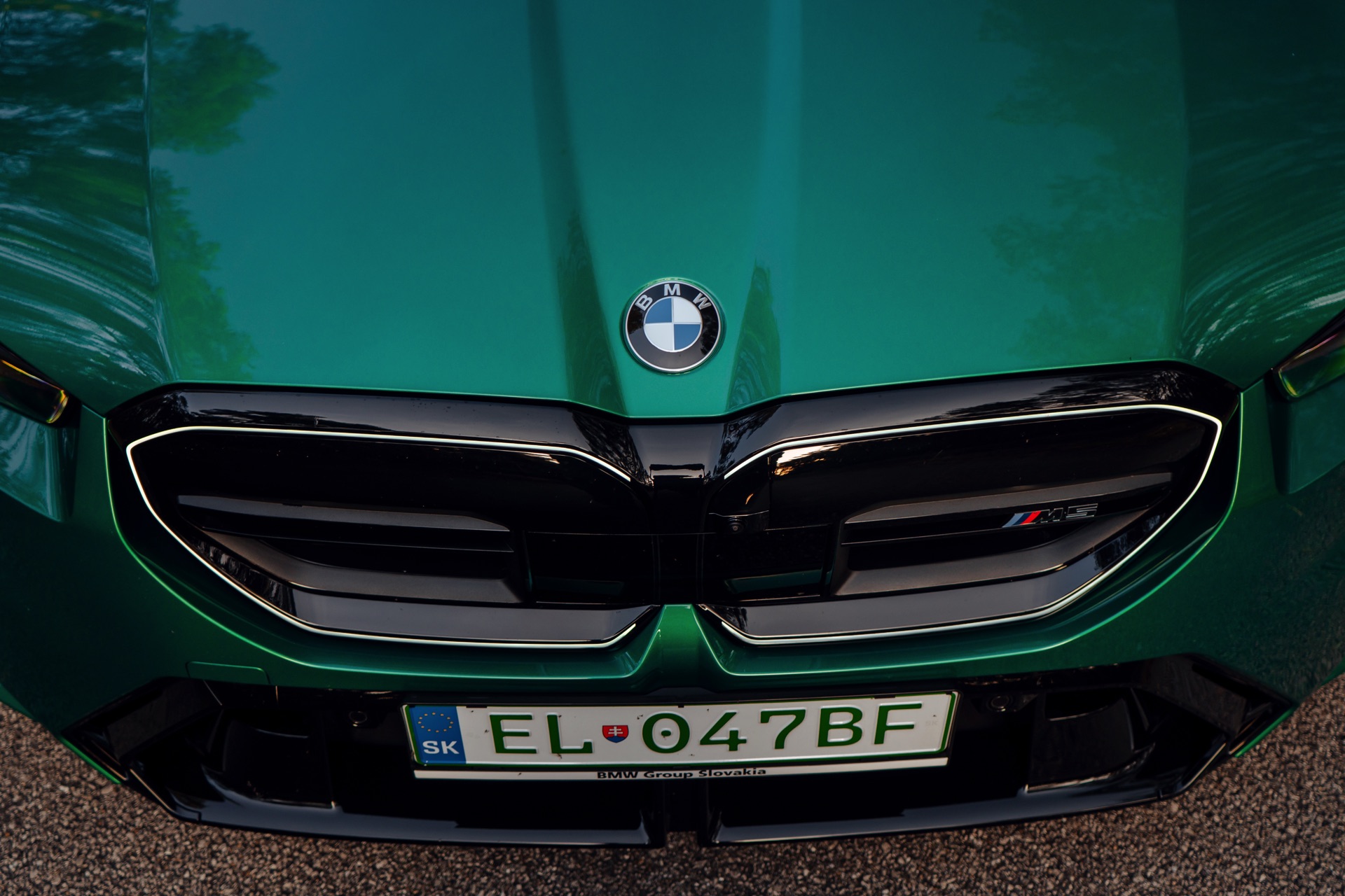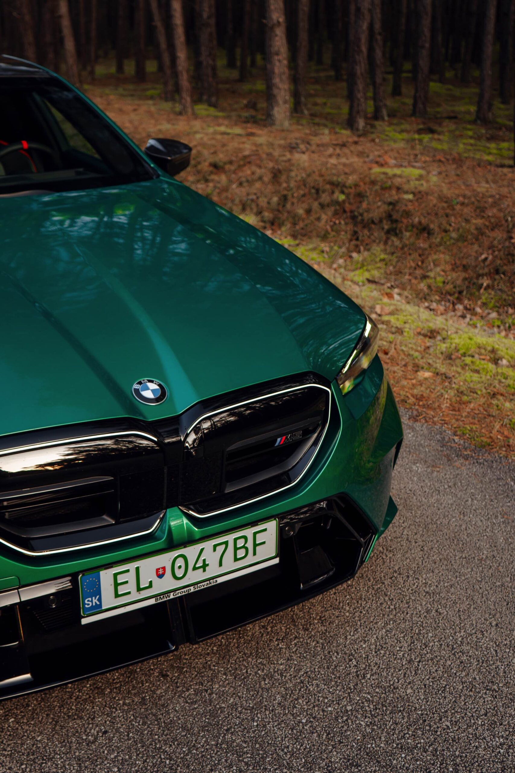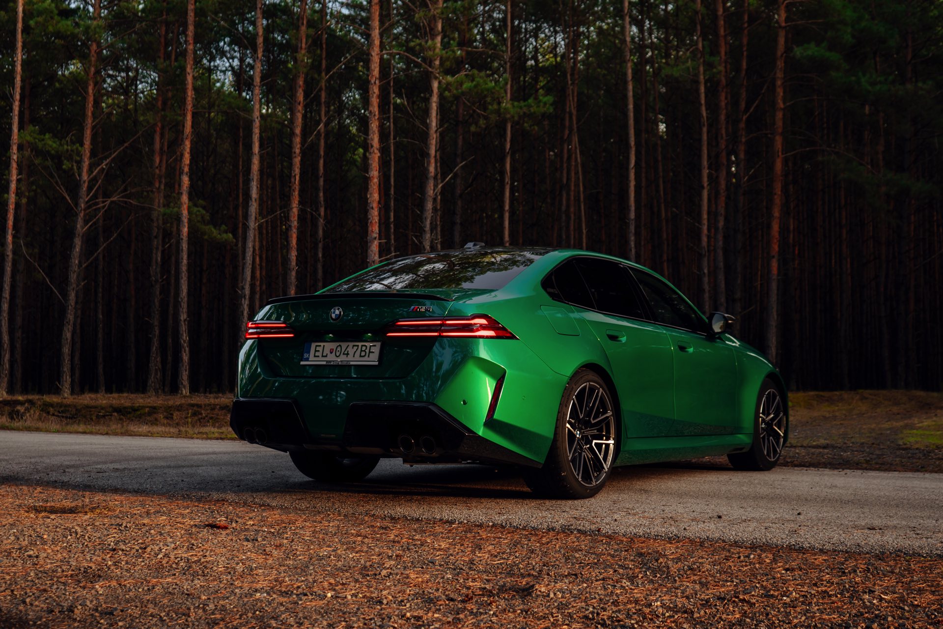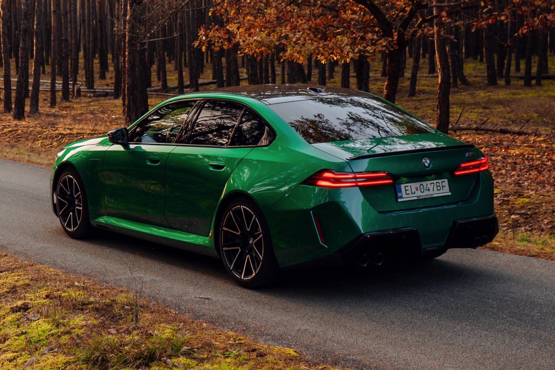 Noch leichter wird die Erkennung des neuen BMW M5, wenn sich der Kunde für eine etwas auffälligere Farbe entschieden hat: Aktuelle Fotos aus der Slowakei zeigen uns den G90 in Isle of Man Green – und auch wenn das intensive Grün zum regulären Farbprogramm für den M5 zählt, ist die Lackierung ohne Frage ein echter Hingucker. Beim gezeigten M5 sehen wir außerdem das optionale Carbon-Dach, das in der Mitte über eine leichte Vertiefung verfügt und sich auch damit vom Look des serienmäßig verbauten Panorama-Glasdachs mit schwarzer Einfassung abgrenzt.