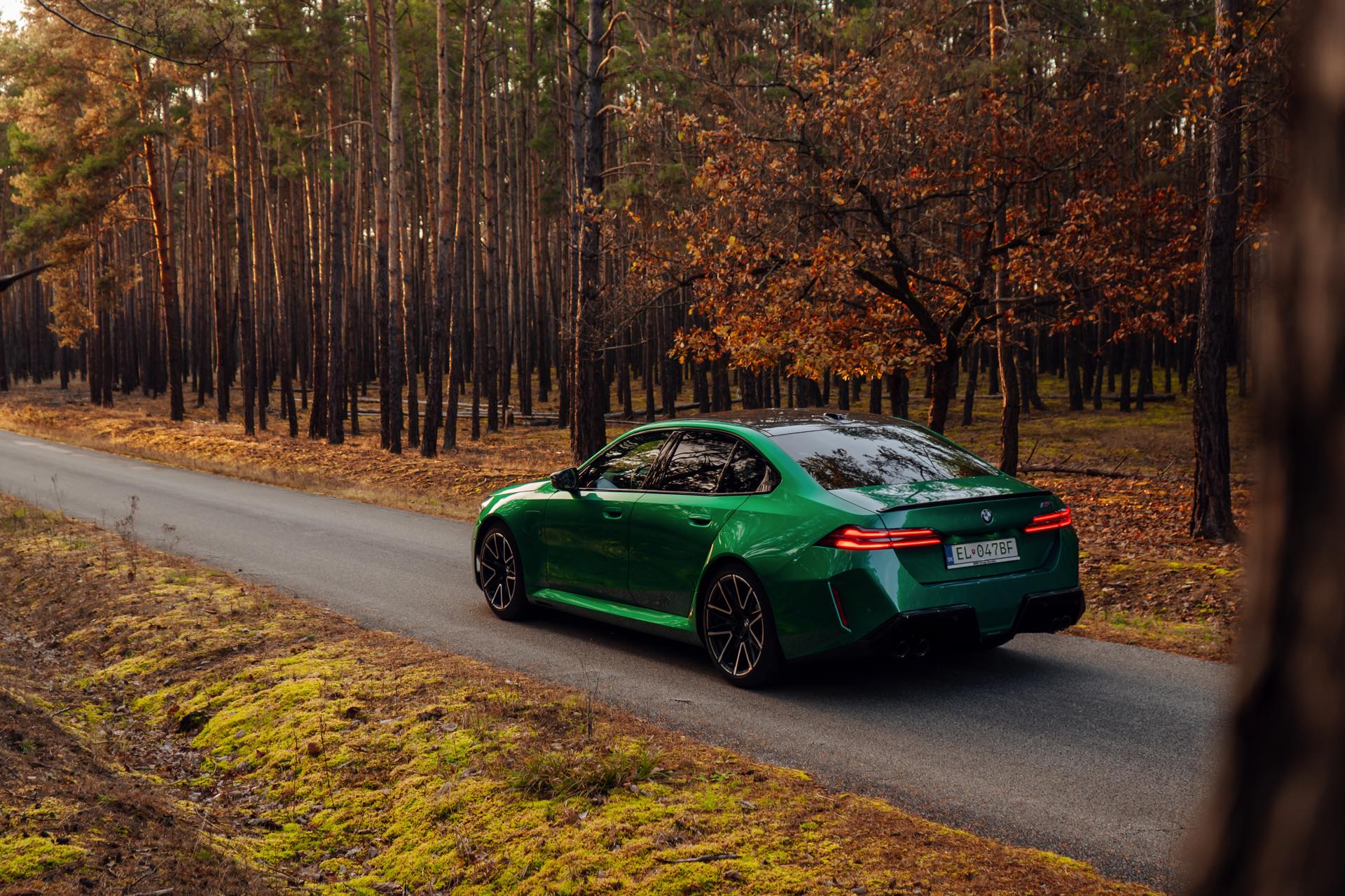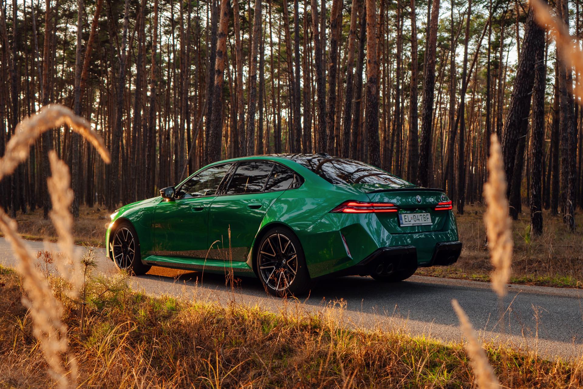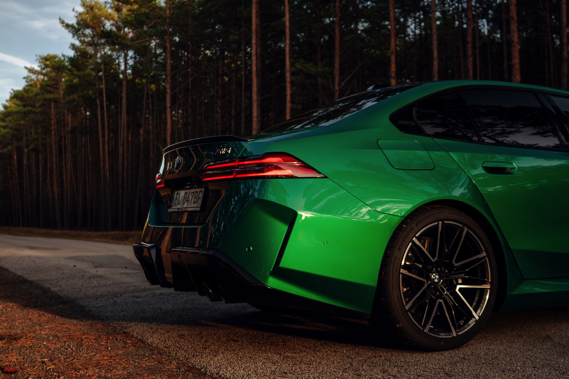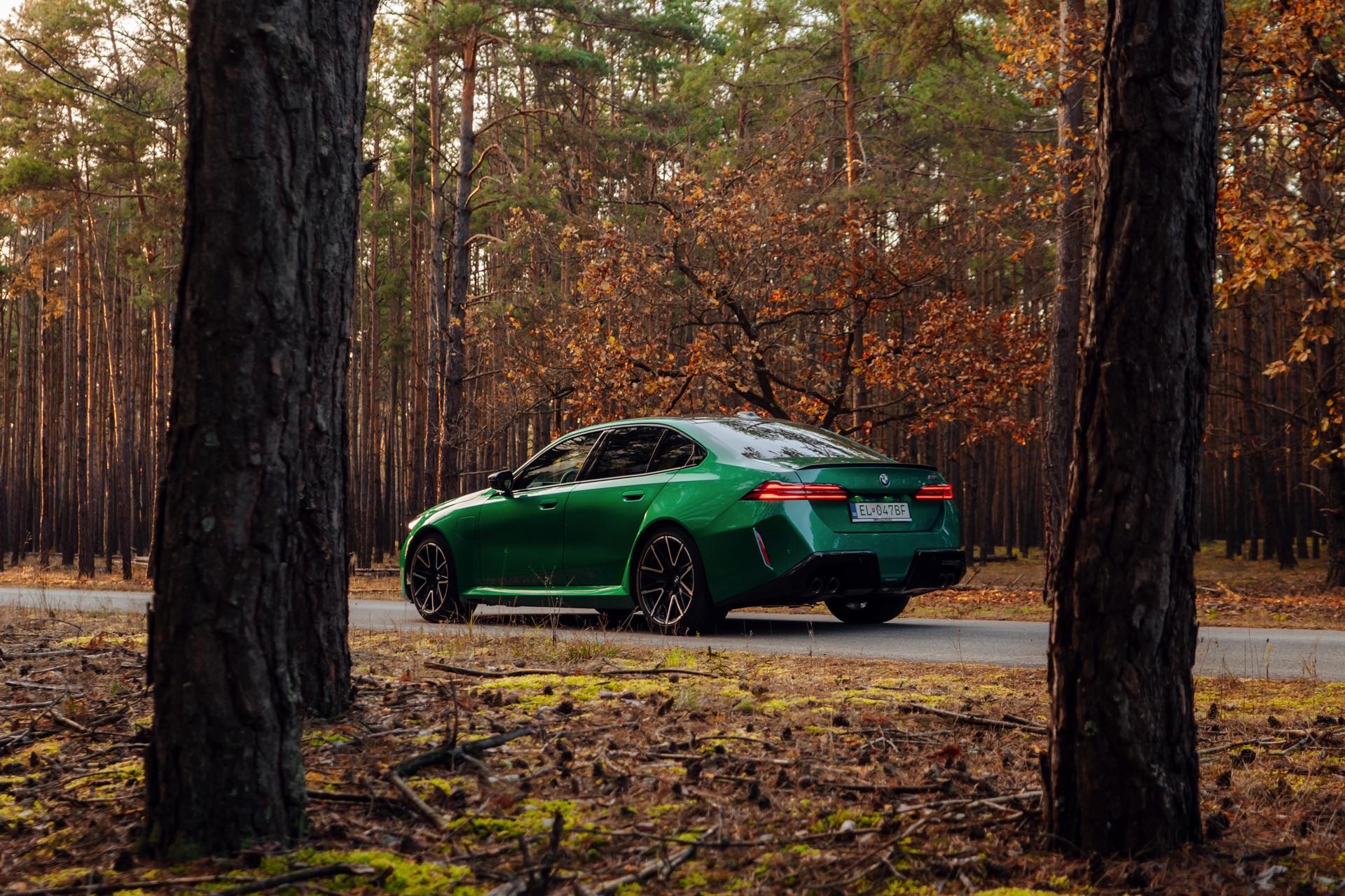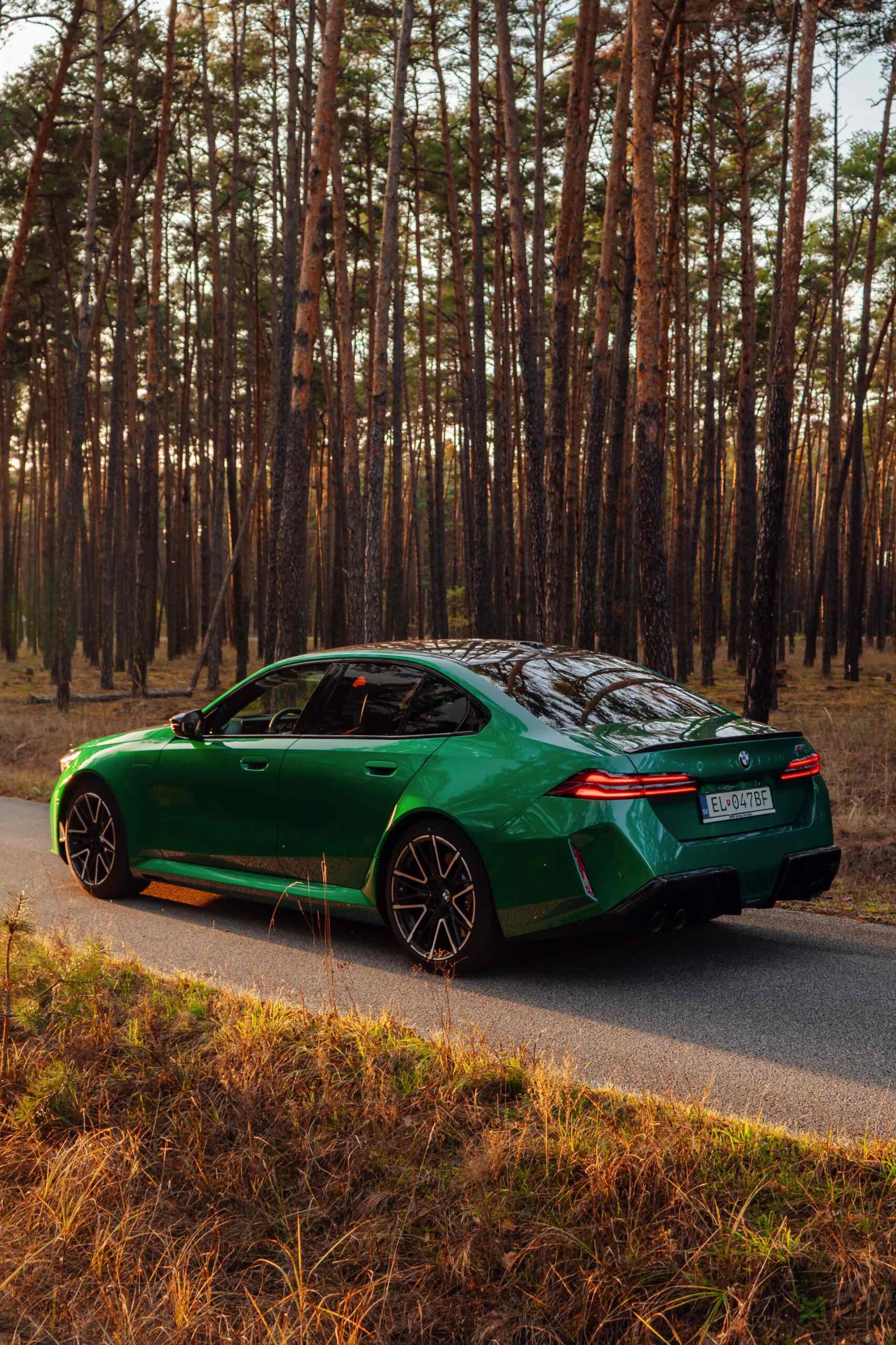 Noch leichter wird die Erkennung des neuen BMW M5, wenn sich der Kunde für eine etwas auffälligere Farbe entschieden hat: Aktuelle Fotos aus der Slowakei zeigen uns den G90 in Isle of Man Green – und auch wenn das intensive Grün zum regulären Farbprogramm für den M5 zählt, ist die Lackierung ohne Frage ein echter Hingucker. Beim gezeigten M5 sehen wir außerdem das optionale Carbon-Dach, das in der Mitte über eine leichte Vertiefung verfügt und sich auch damit vom Look des serienmäßig verbauten Panorama-Glasdachs mit schwarzer Einfassung abgrenzt.