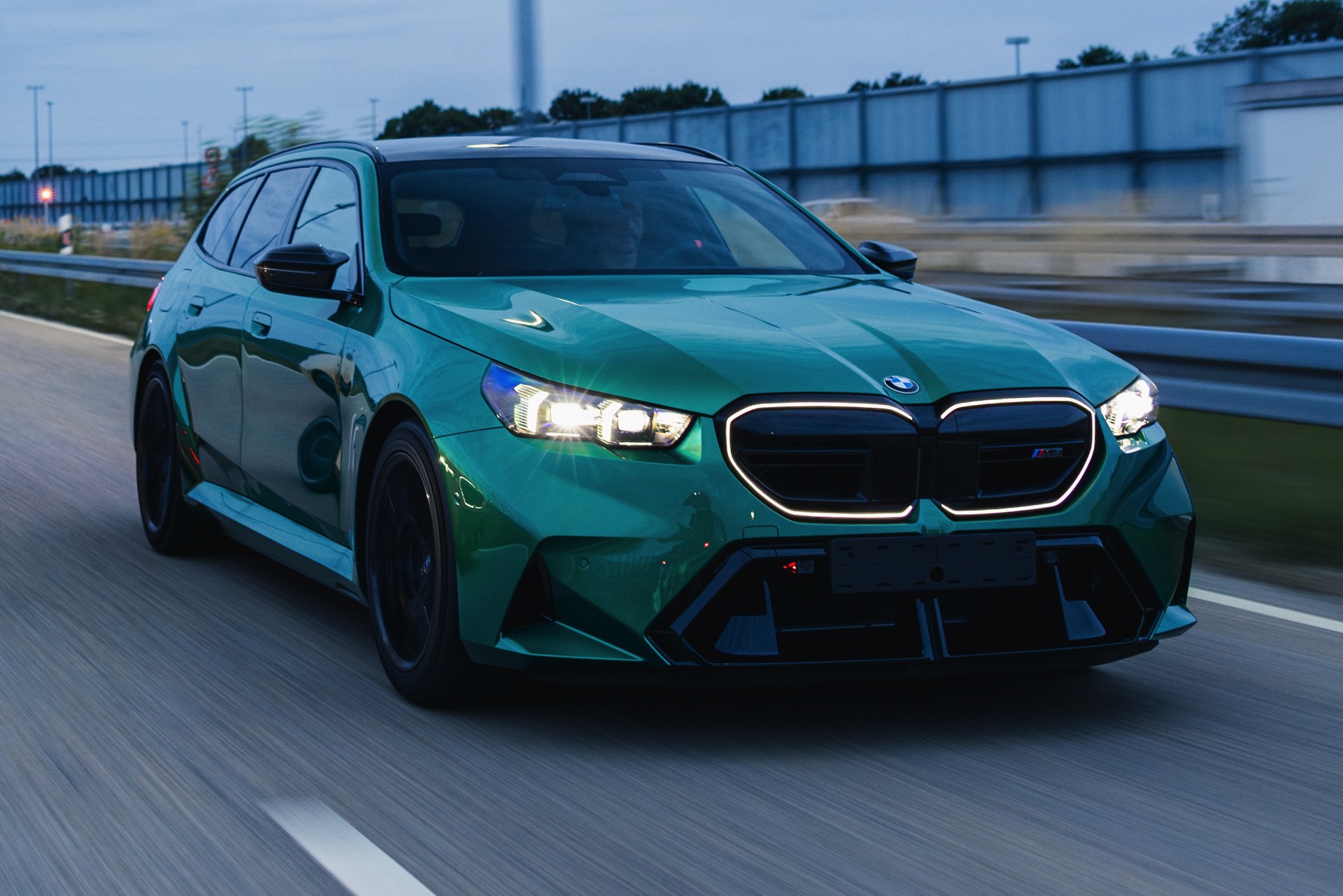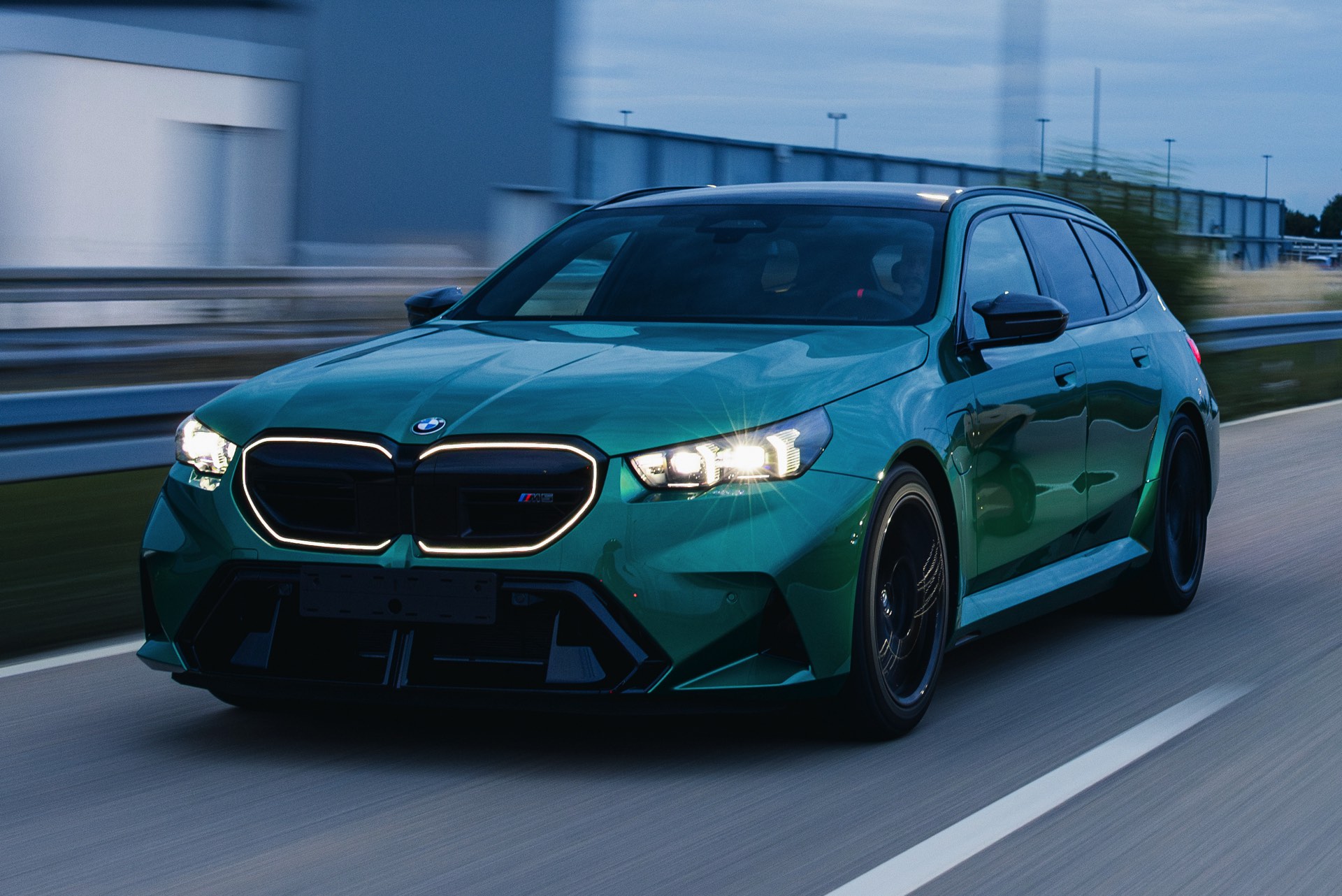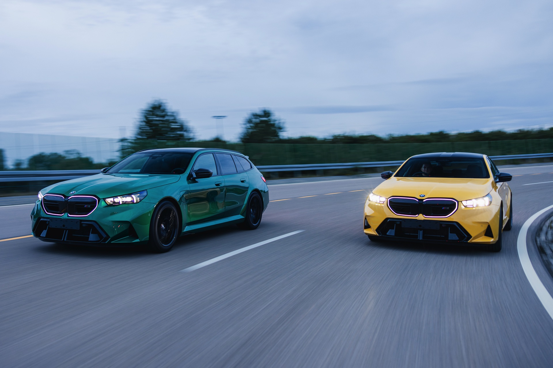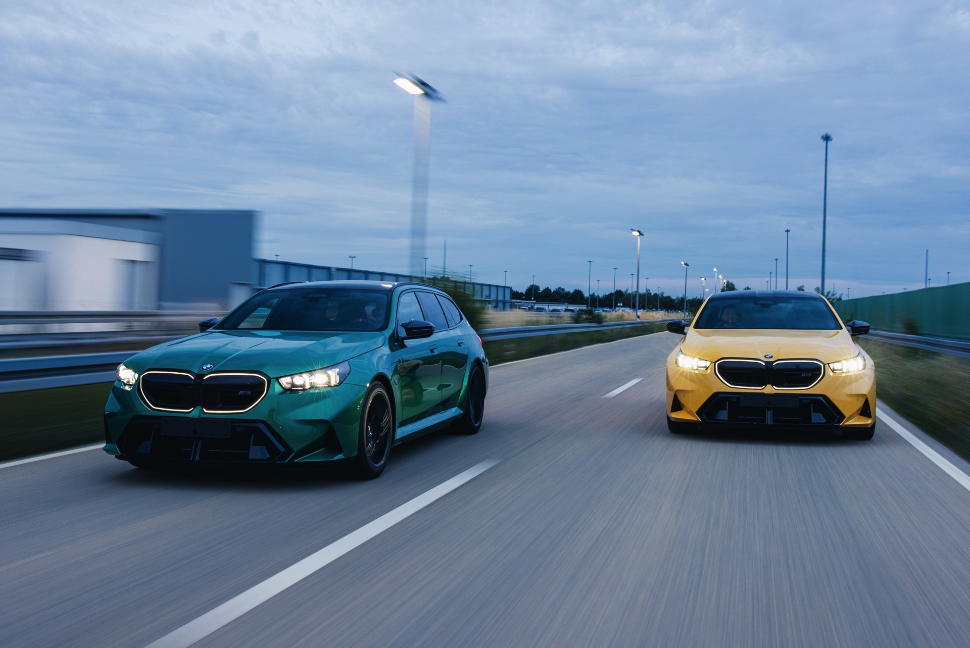 Auf den (wenigen) Fotos vom Produktions-Auftakt sehen wir den neuen BMW M5 Touring in Isle of Man Green – und das nicht nur im Werk selbst, sondern auch auf der angeschlossenen Teststrecke. Die bei Dämmerung gemachten Fotos liefern deshalb auch weitere Eindrücke vom Nacht-Design des M5 mit seiner Iconic Glow-Niere. Begleitet wird der Kombi hier von einer M5 Limousine (G90) in Speed Gelb.