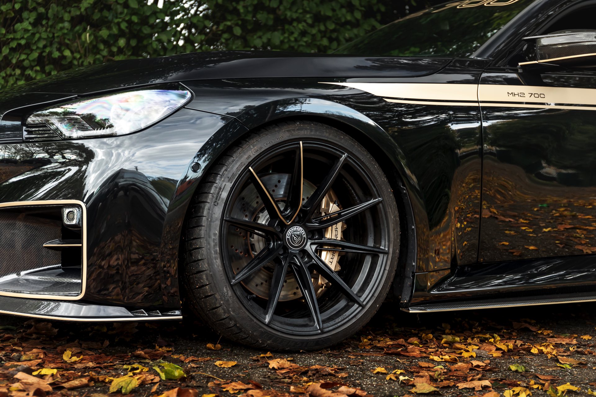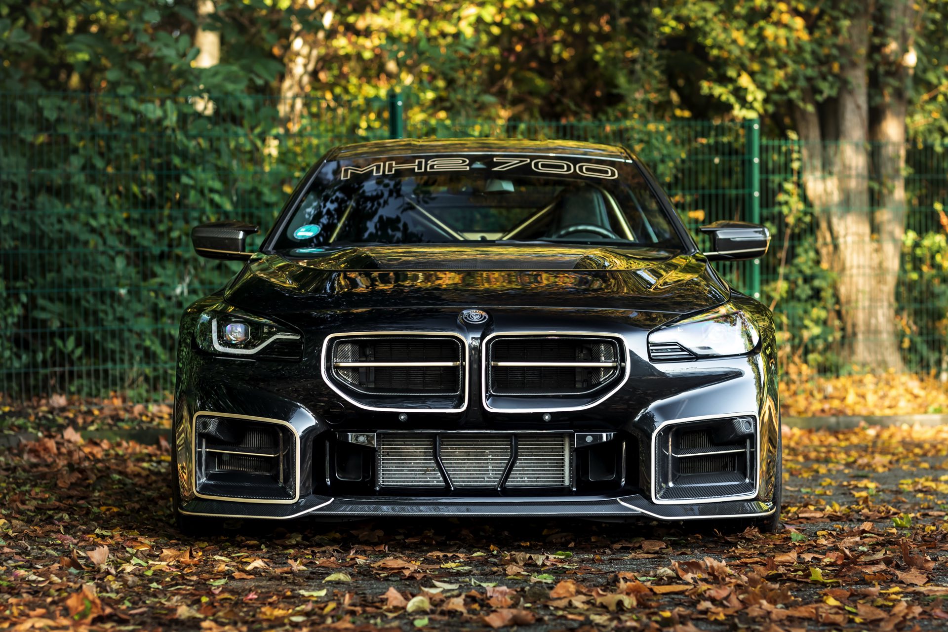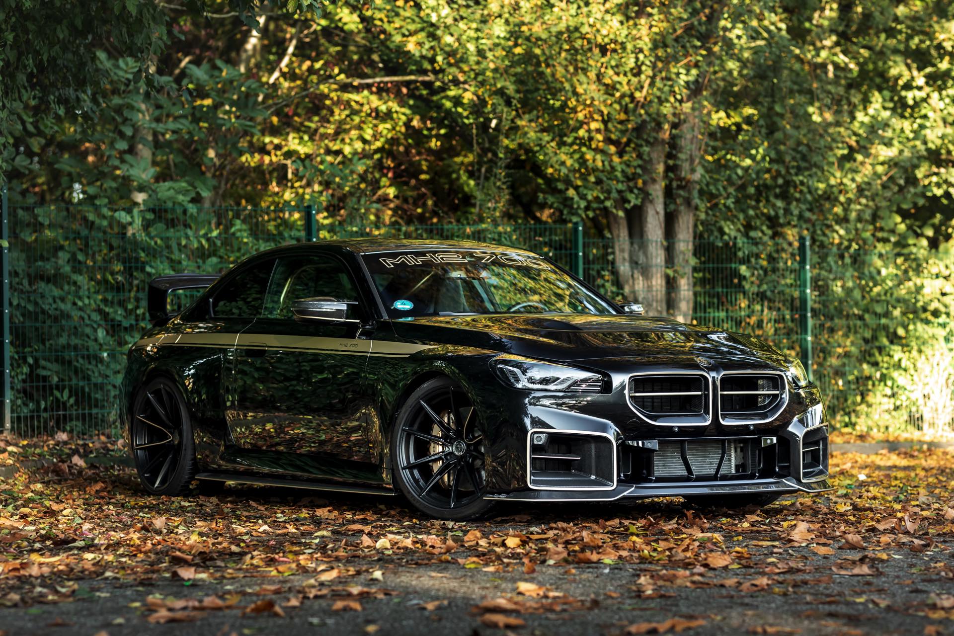 Neben dem Power-Tuning bietet der Manhart MH2 700 II auch eine deutlich verschärfte Optik, die wir auf aktuellen Fotos in herbstlicher Umgebung zu sehen bekommen: Der schwarze M2 trägt neben einer Champagner-farbenen Dekor-Folierung ein KW Variante 4 Gewindefahrwerk und Yido-Felgen, die vorne 20 und hinten sogar 21 Zoll groß sind. Dazu kommen eine Carbon-Motorhaube sowie ebenfalls aus dem Hightech-Werkstoff gefertigte Nieren, Frontsplitter, Heckflügel, Diffusor und sogar eine Unterboden-Verkleidung.