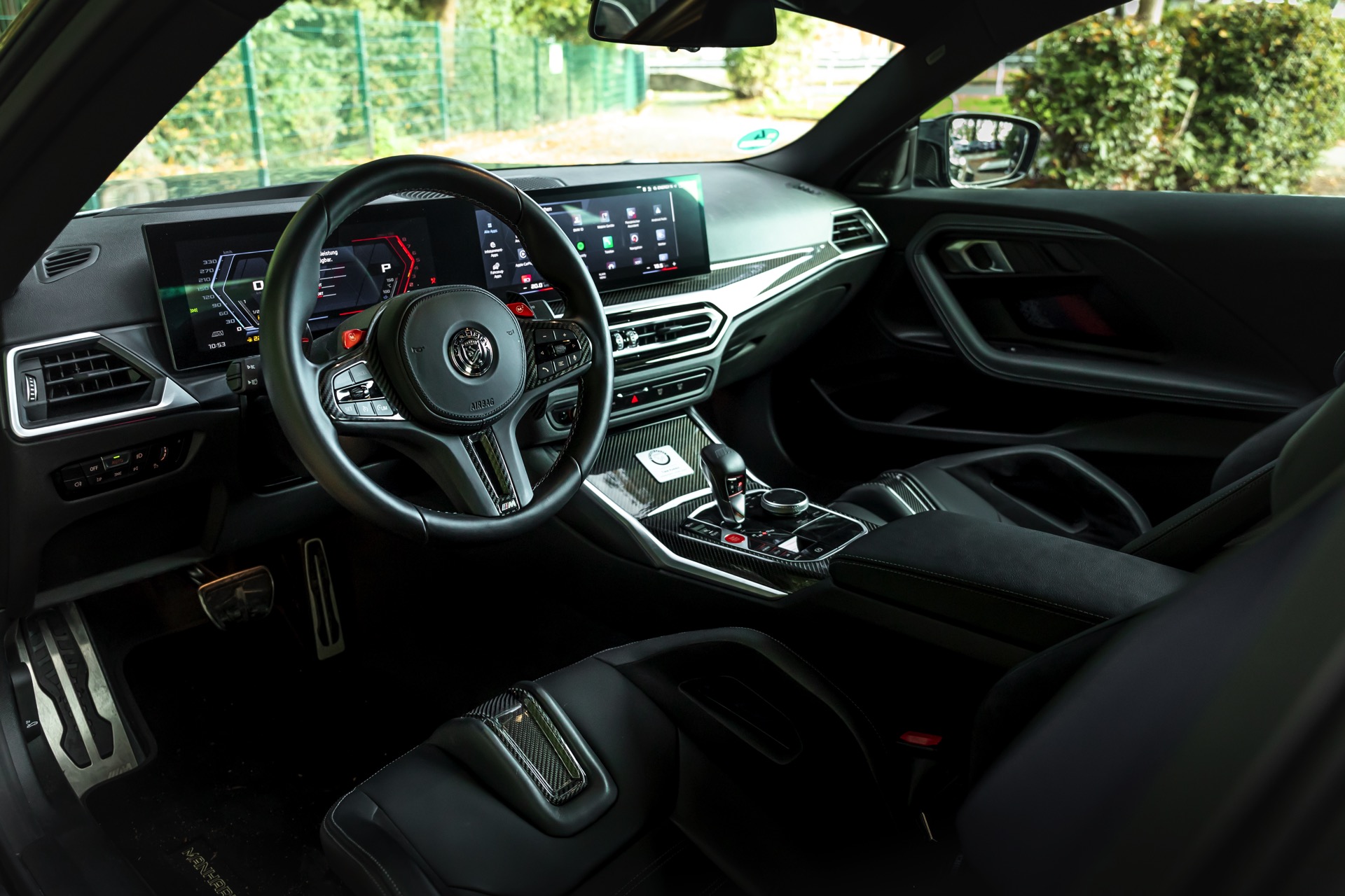 Dass bei derart tiefgreifenden Änderungen auch der Innenraum nicht im Serien-Zustand bleibt, versteht sich von selbst: Der gezeigte BMW M2 verzichtet auf eine Rückbank und verfügt stattdessen über einen massiven Überrollbügel, außerdem werden die ab Werk erhältlichen Carbon-Schalensitze mit Hosenträgergurten von Schroth kombiniert.
