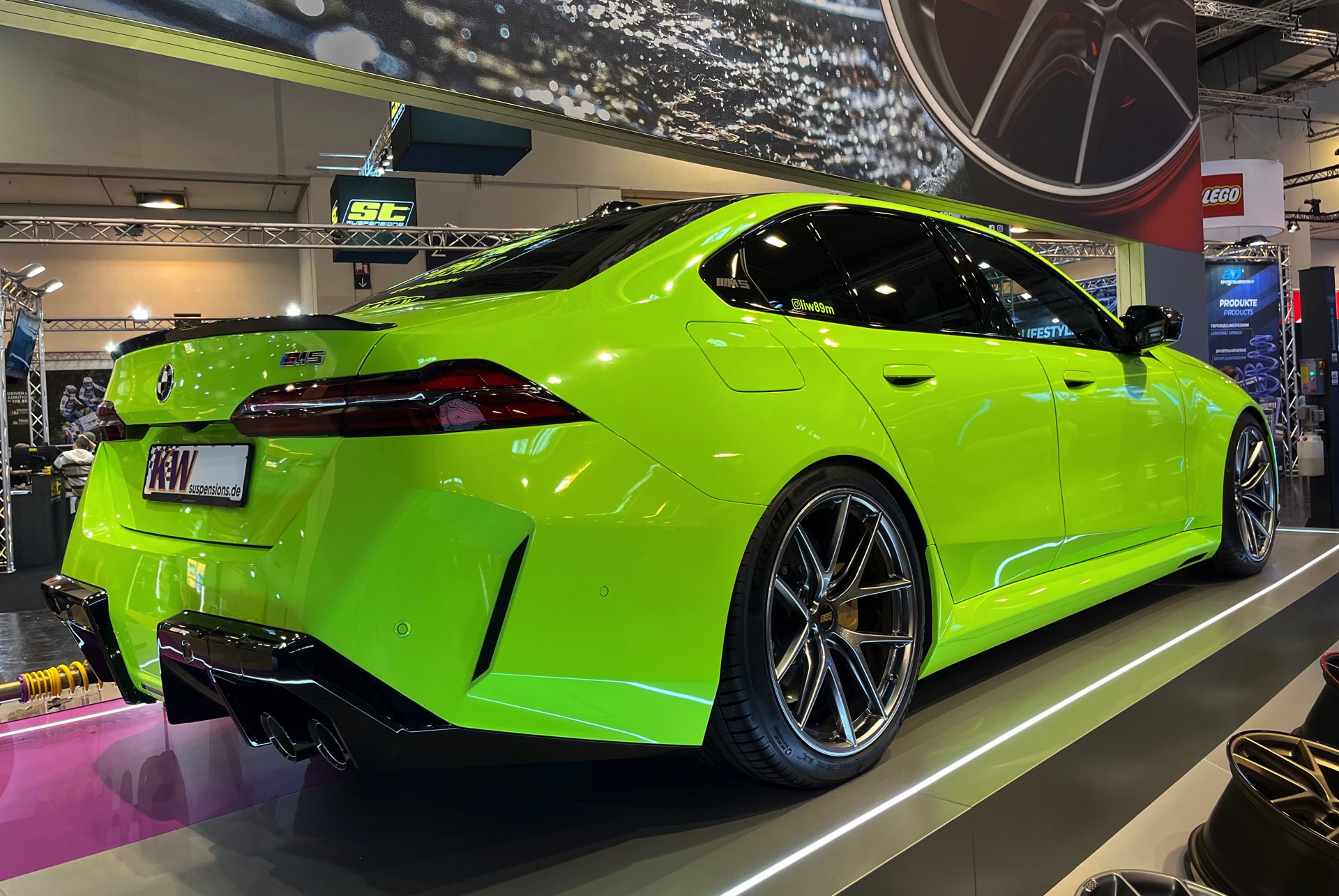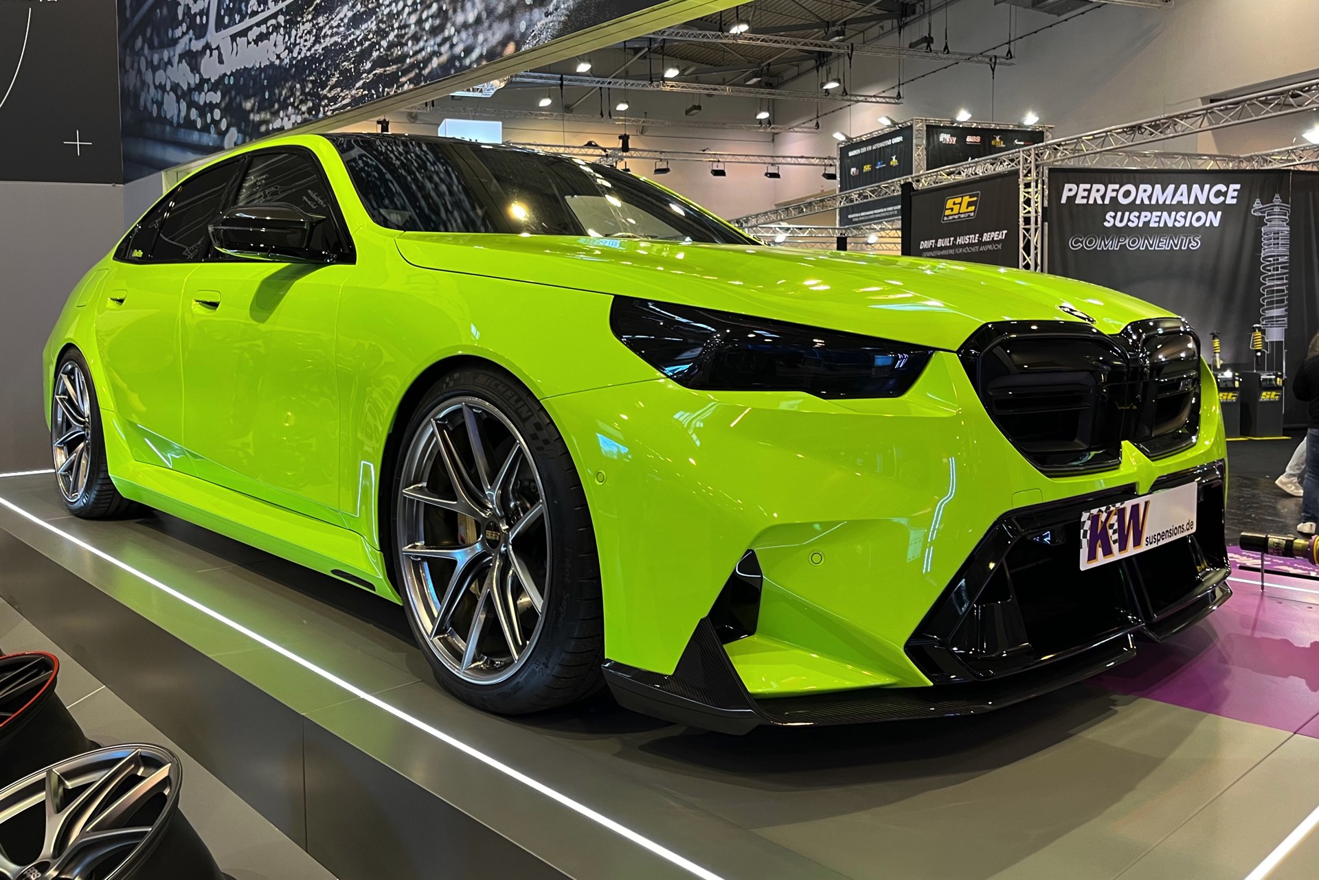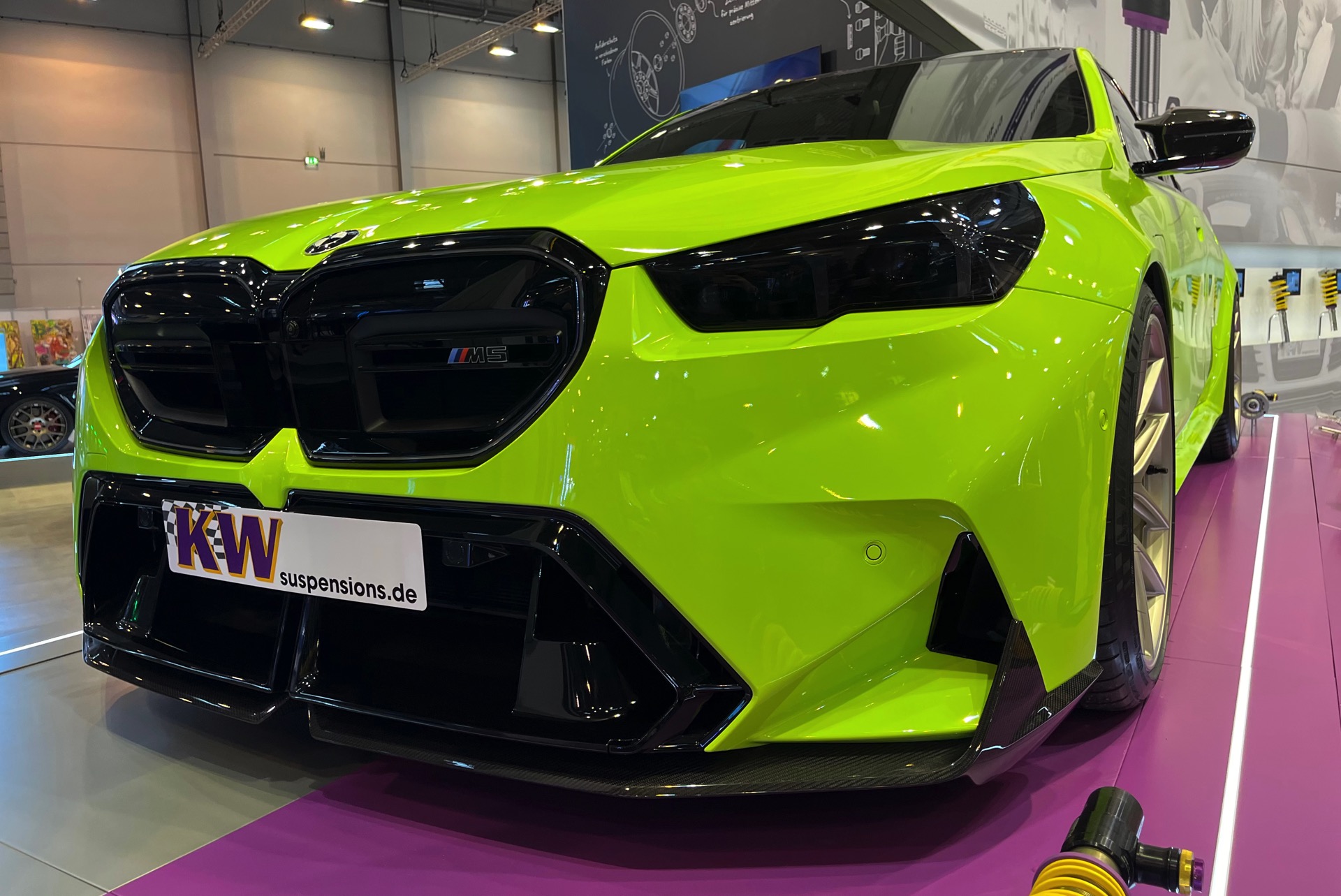 Schon aufgrund seiner Folierung in Toxic Green zählt der neue BMW M5 (G90) am Stand von KW Suspension zu den großen Hinguckern der Essen Motor Show 2024, aber neben der Farbe hat die Power-Limousine natürlich noch Einiges mehr zu bieten. Der giftgrüne M5 trägt ein KW V4 Gewindefahrwerk mit einstellbarer Zug- und Druckstufendämpfung und liegt einige Millimeter tiefer als üblich, außerdem trägt er auf beiden Seiten sehenswerte Felgen von BBS.
