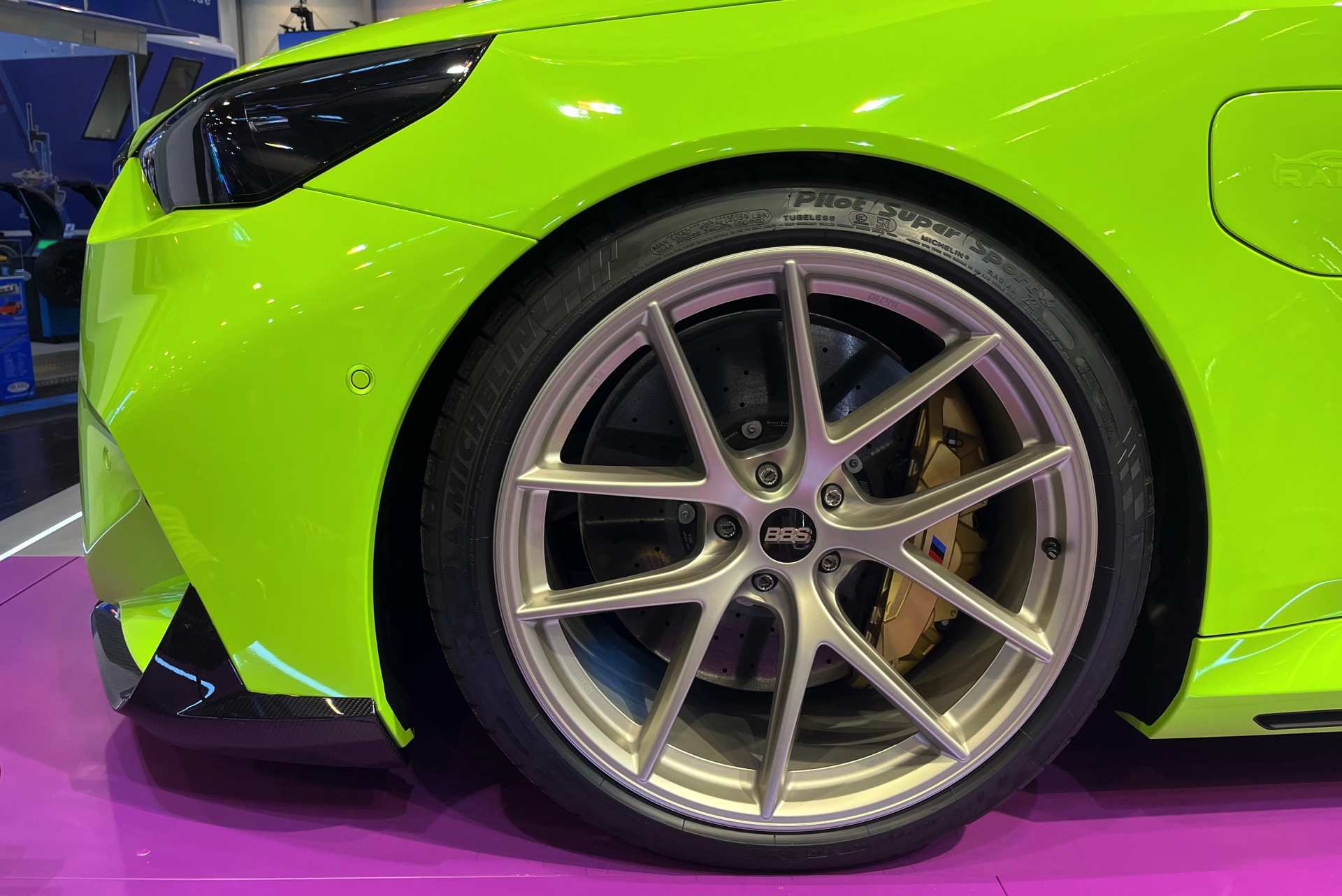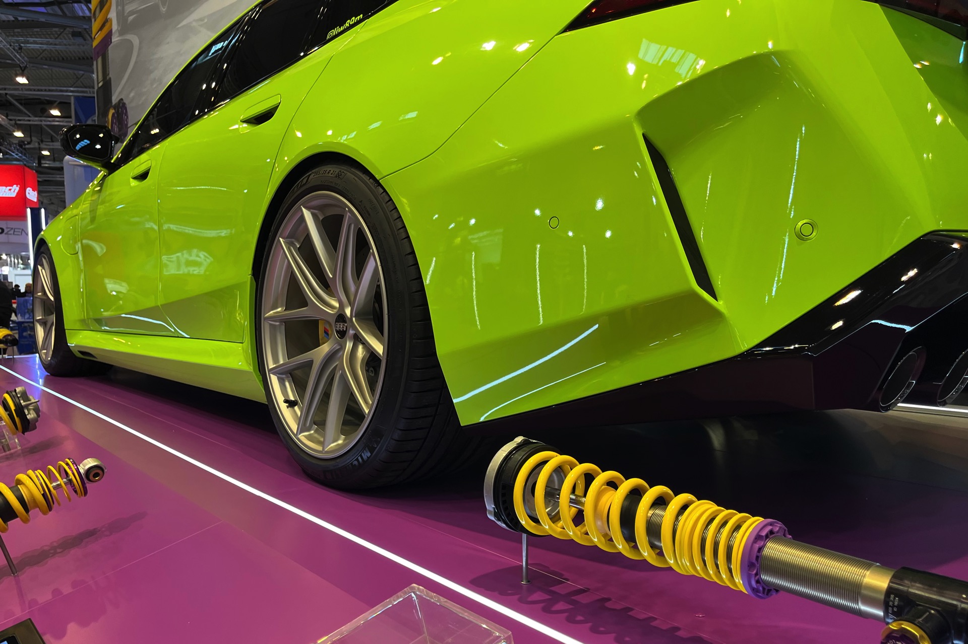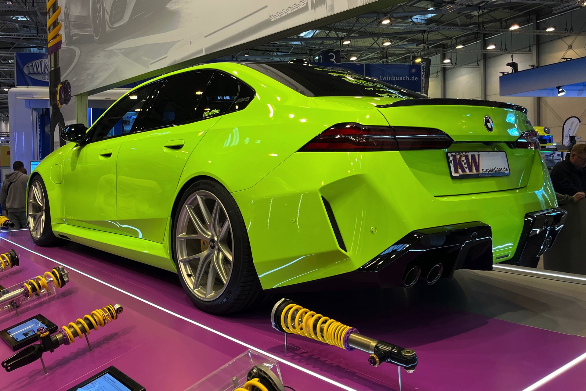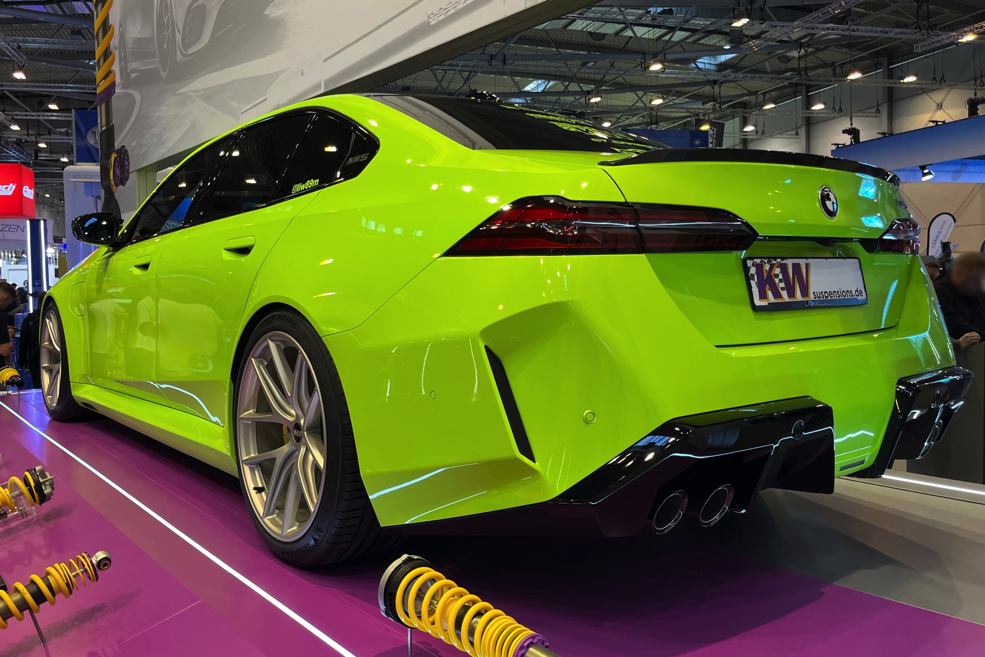 Schon aufgrund seiner Folierung in Toxic Green zählt der neue BMW M5 (G90) am Stand von KW Suspension zu den großen Hinguckern der Essen Motor Show 2024, aber neben der Farbe hat die Power-Limousine natürlich noch Einiges mehr zu bieten. Der giftgrüne M5 trägt ein KW V4 Gewindefahrwerk mit einstellbarer Zug- und Druckstufendämpfung und liegt einige Millimeter tiefer als üblich, außerdem trägt er auf beiden Seiten sehenswerte Felgen von BBS.