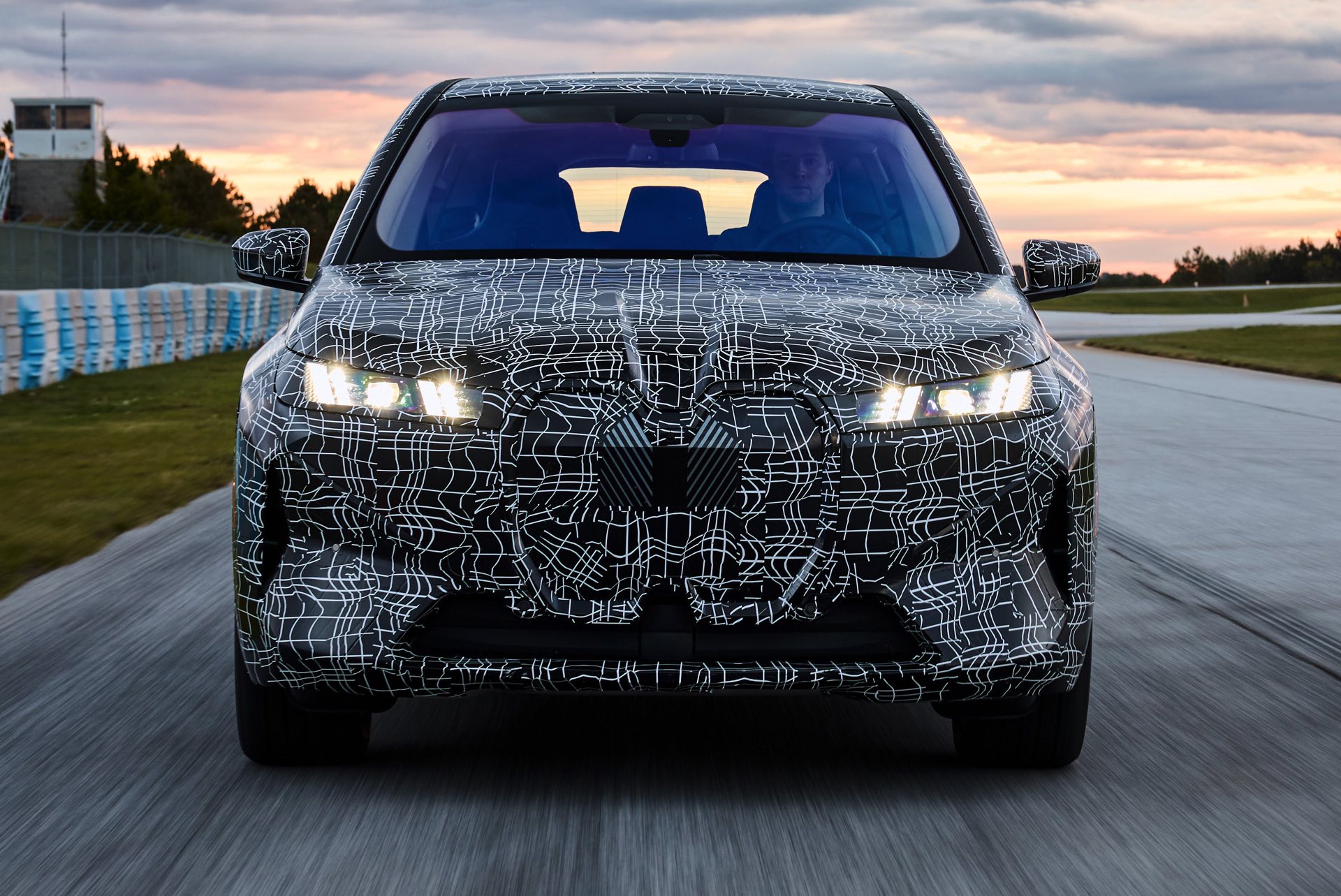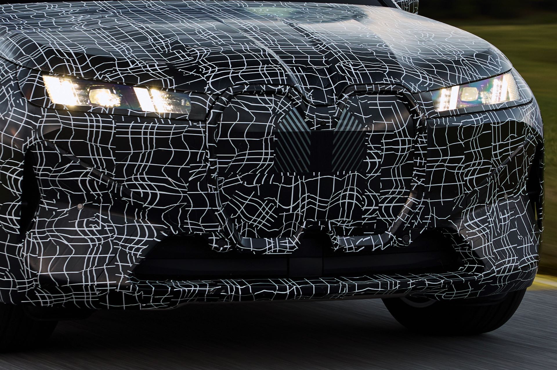 Klar zu erkennen sind das neue Scheinwerfer-Innenleben mit überarbeitetem Tagfahrlicht-Design für eine frische Optik bei Nacht. Dazu kommen neue Nieren, die sich mit diagonalen Streben an Neuheiten wie dem X3 (G45) oder auch 1er (F70) und 2er Gran Coupé (F74) orientieren. Ob das BMW iX Facelift auch mit beleuchteten Iconic Glow-Nieren kommen wird, bleibt aufgrund der Tarnung derzeit noch im Dunkeln. Gut erkennbar ist hingegen das leicht überarbeitete Frontschürzen-Design, das etwas mehr Sportlichkeit ausstrahlt.