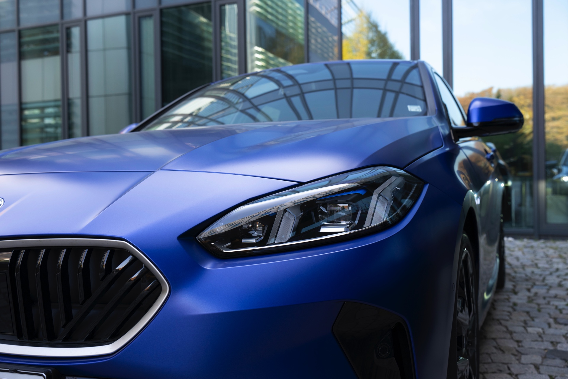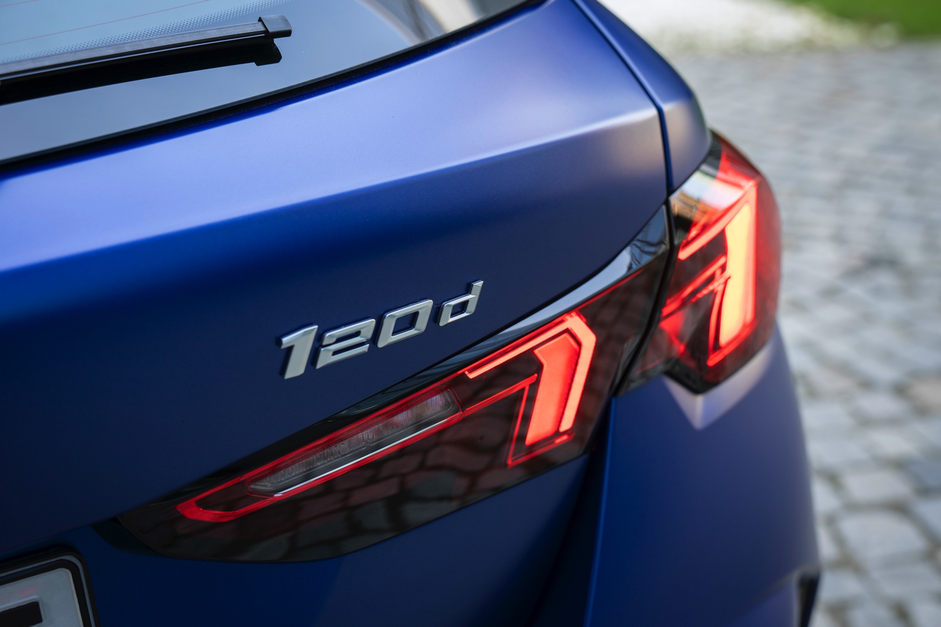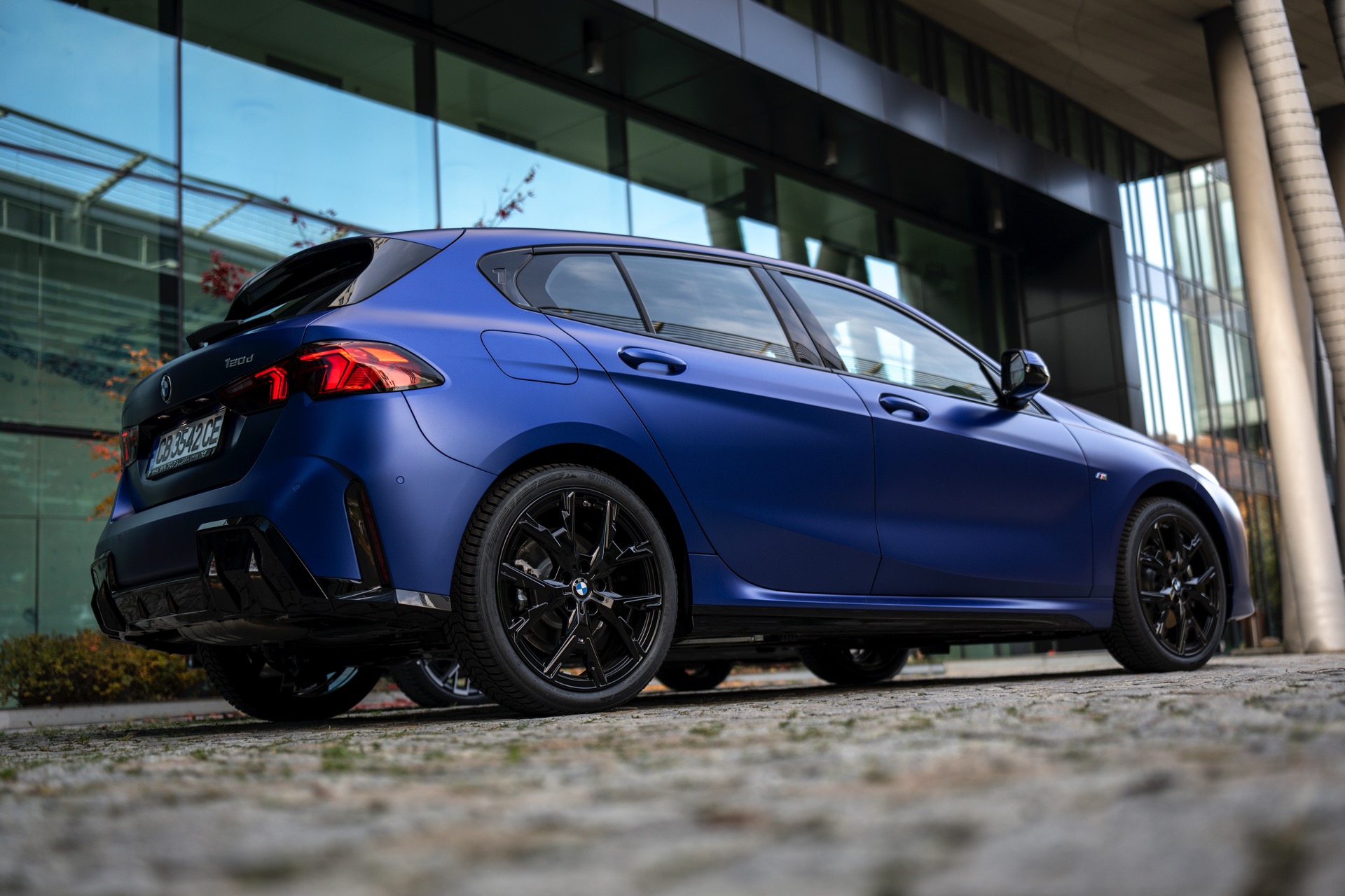Dass man auch mit weniger Leistung auffallen kann, zeigt der BMW 120d in Frozen Portimao Blue. Er kommt mit “nur” 163 PS und Frontantrieb, trägt neben der matten Lackierung aber auch das M Sportpaket und schwarze Felgen. Wie alle 1er unterhalb des M135 verzichtet er komplett auf sichtbare Endrohre, die Abgase seines Vierzylinder-Diesels werden unterhalb des Kofferraums unauffällig nach unten abgeleitet. Ein markantes Detail ist das Nieren-Innenleben an der Front, denn dieses verfügt über senkrechte und diagonale Streben – ein Look, den wir künftig öfter zu sehen bekommen werden, der bisher aber exklusiv bei 1er, 2er Gran Coupé (F74) und X3 (G45) verbaut wird.
