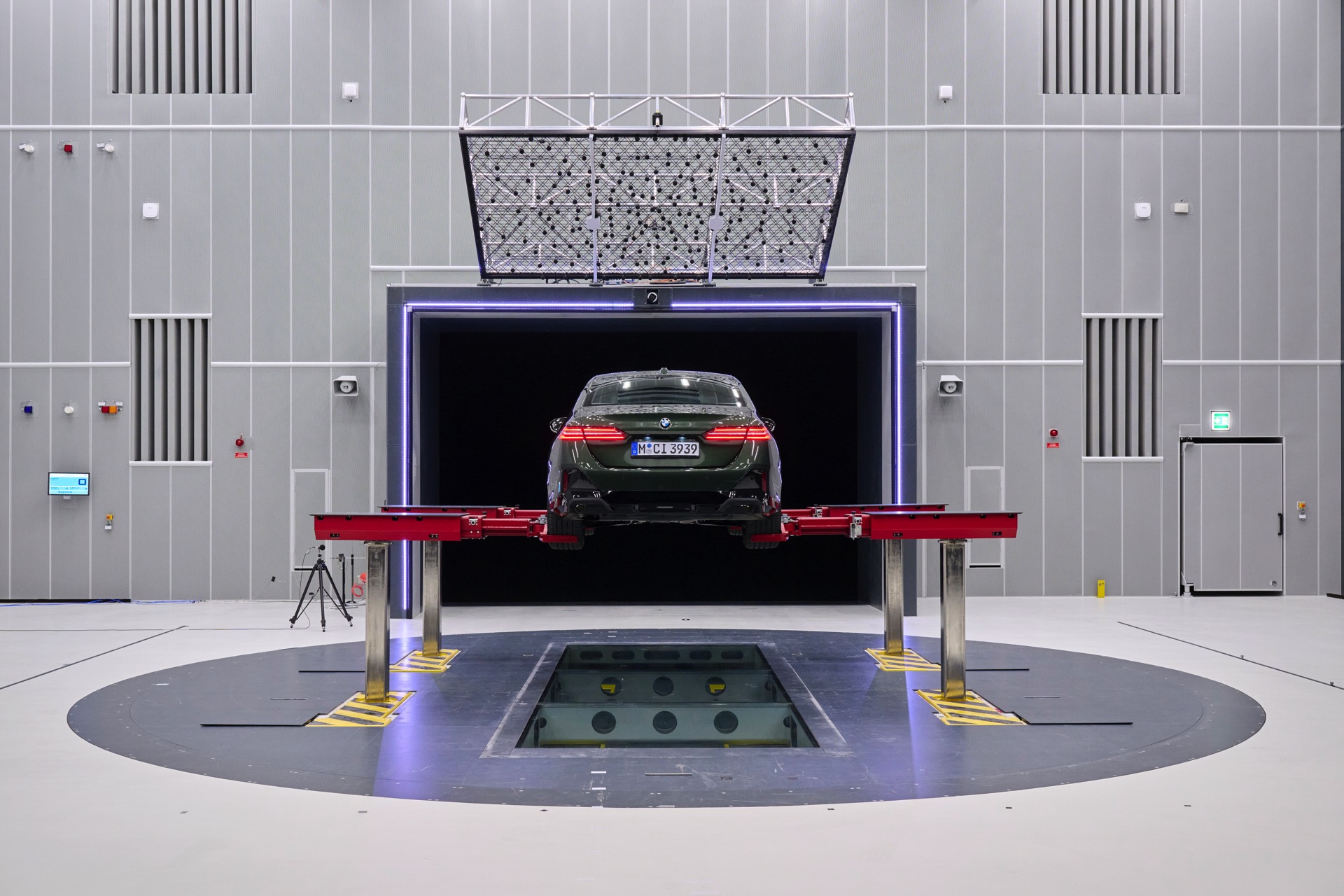 Um die Windgeräusche auch bei einem Autobahn-Tempo von bis zu 250 km/h untersuchen zu können, hat der neue Akustik-Windkanal der BMW Group eine Gebläseleistung von 4,5 Megawatt, der riesige Lüfter mit einem Düsen-Querschnitt von 25 Quadratmetern kann bis zu 100.000 Kubikmeter Luft pro Minute fördern. Die komplette Messfläche ist als akustischer Semifreifeld-Raum konzipiert, außer vom schallharten Boden treten also keine Schallreflexionen auf, die die Messung verfälschen könnten.