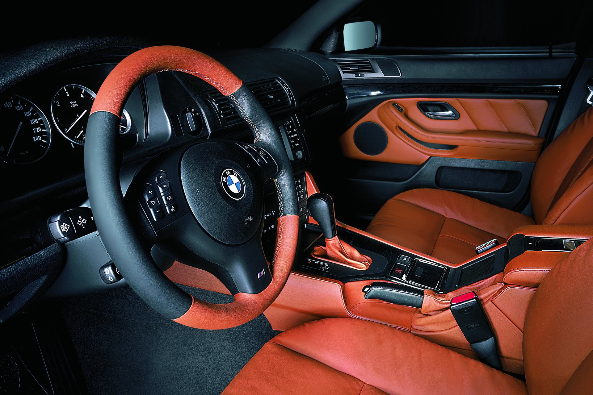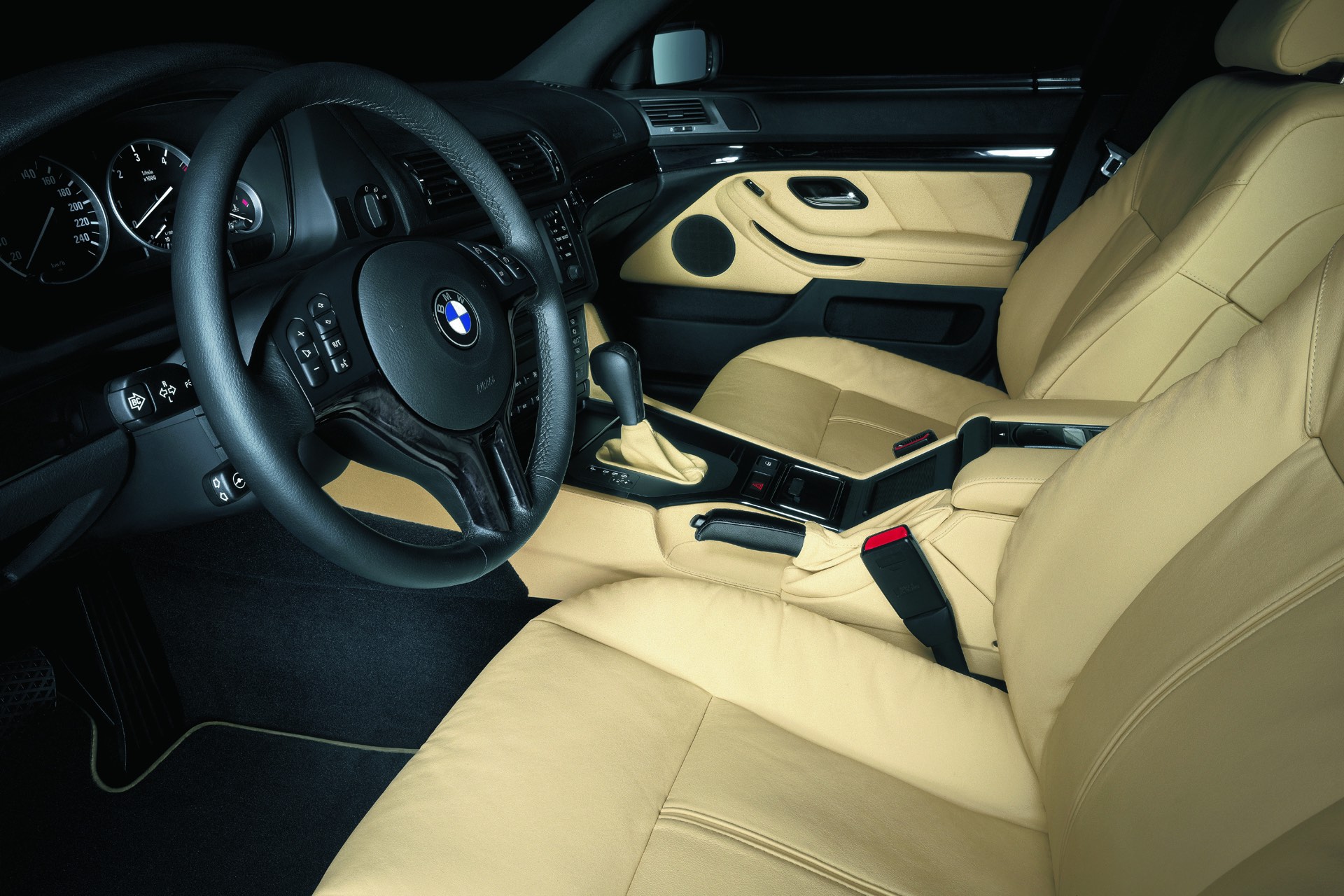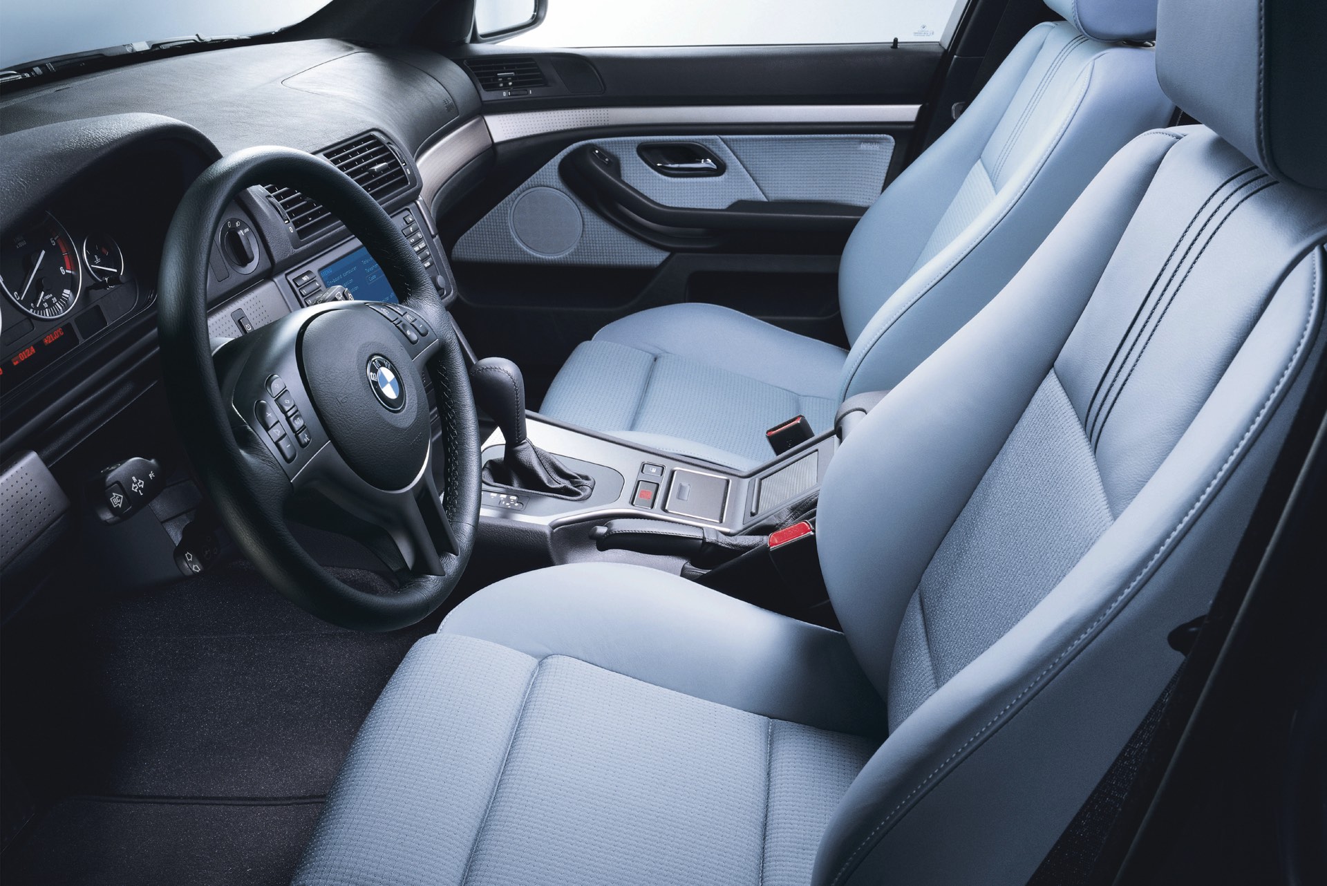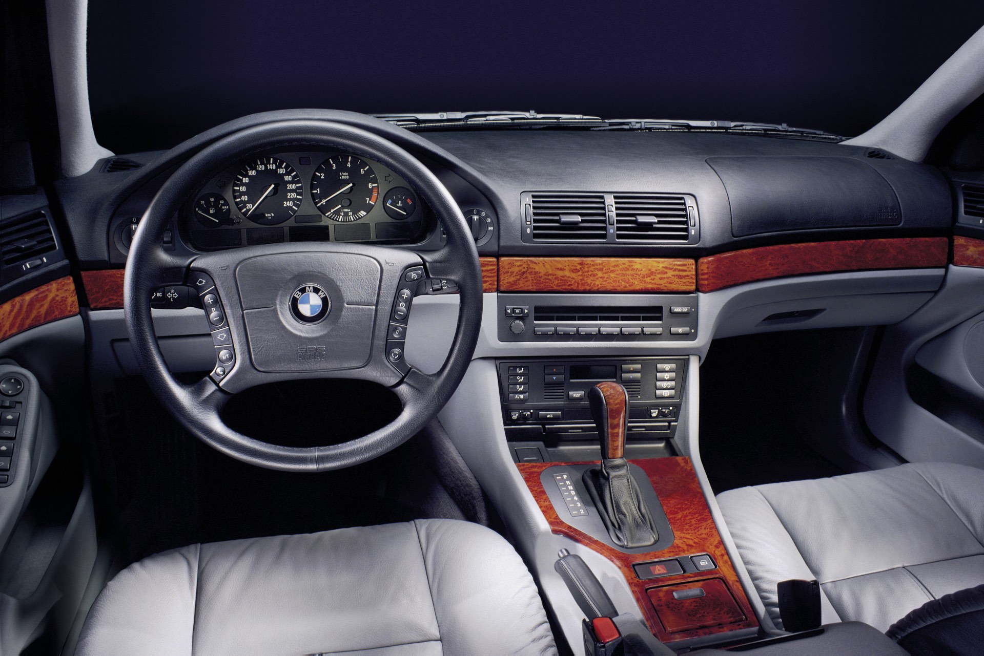 Ganz anders als heute präsentiert sich natürlich auch der Innenraum des BMW 5er E39: Im fahrerorientierten Cockpit, dessen Grund-Layout eng an das der 7er-Generation E38 angelehnt war und wenig später auch im BMW 3er der Generation E46 erfolgreich weitergelebt wurde, konzentrierte sich noch auf klassische Rundinstrumente. Erst später kam auch im E39 ein modernes Display für das Navigationssystem, allerdings in einem völlig anderen Format als heute. Ein interessantes Detail sind die beiden äußeren Luftauslässe, die wie beim 7er in die Türen statt in die Armaturentafel integriert waren.