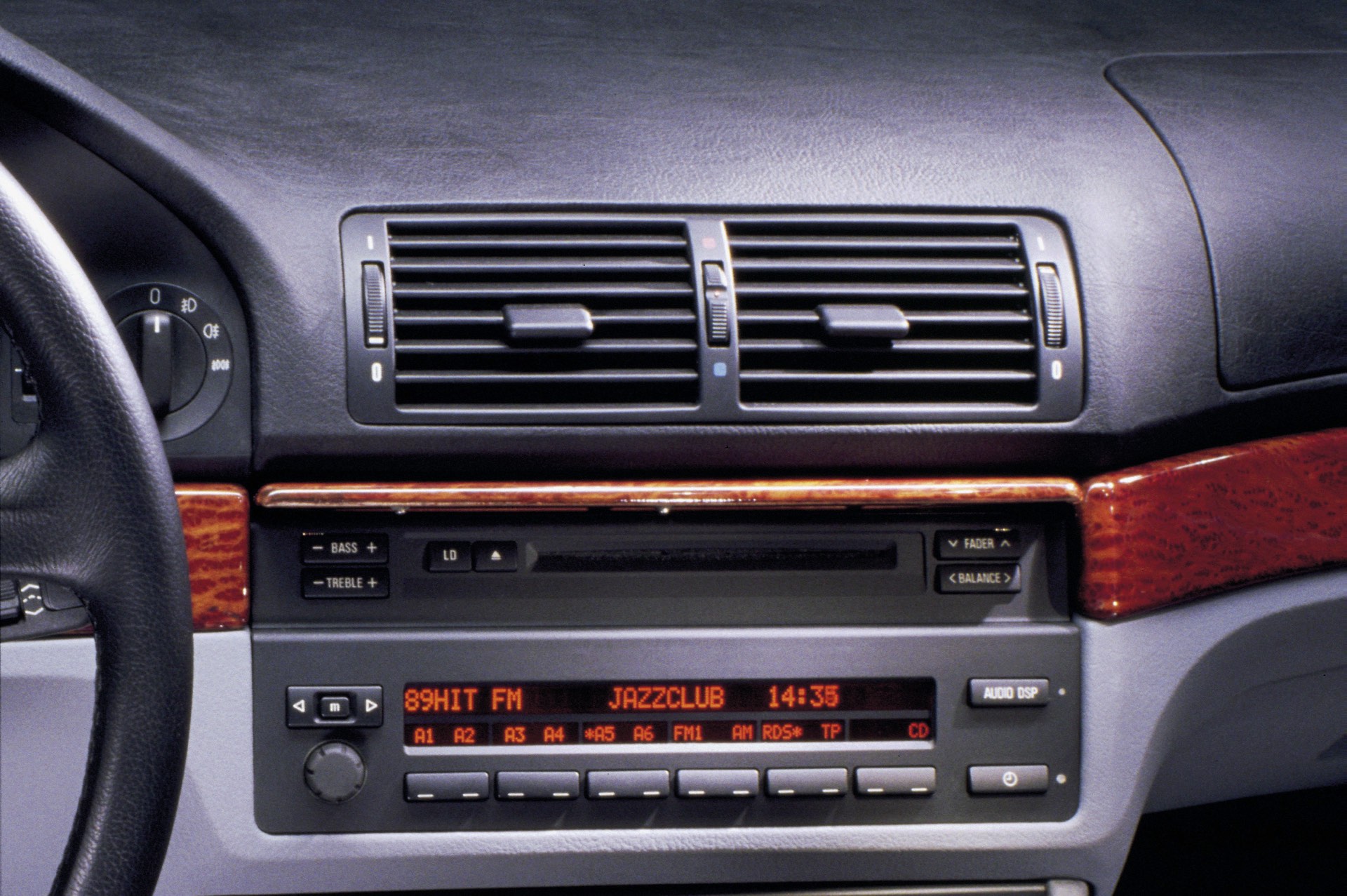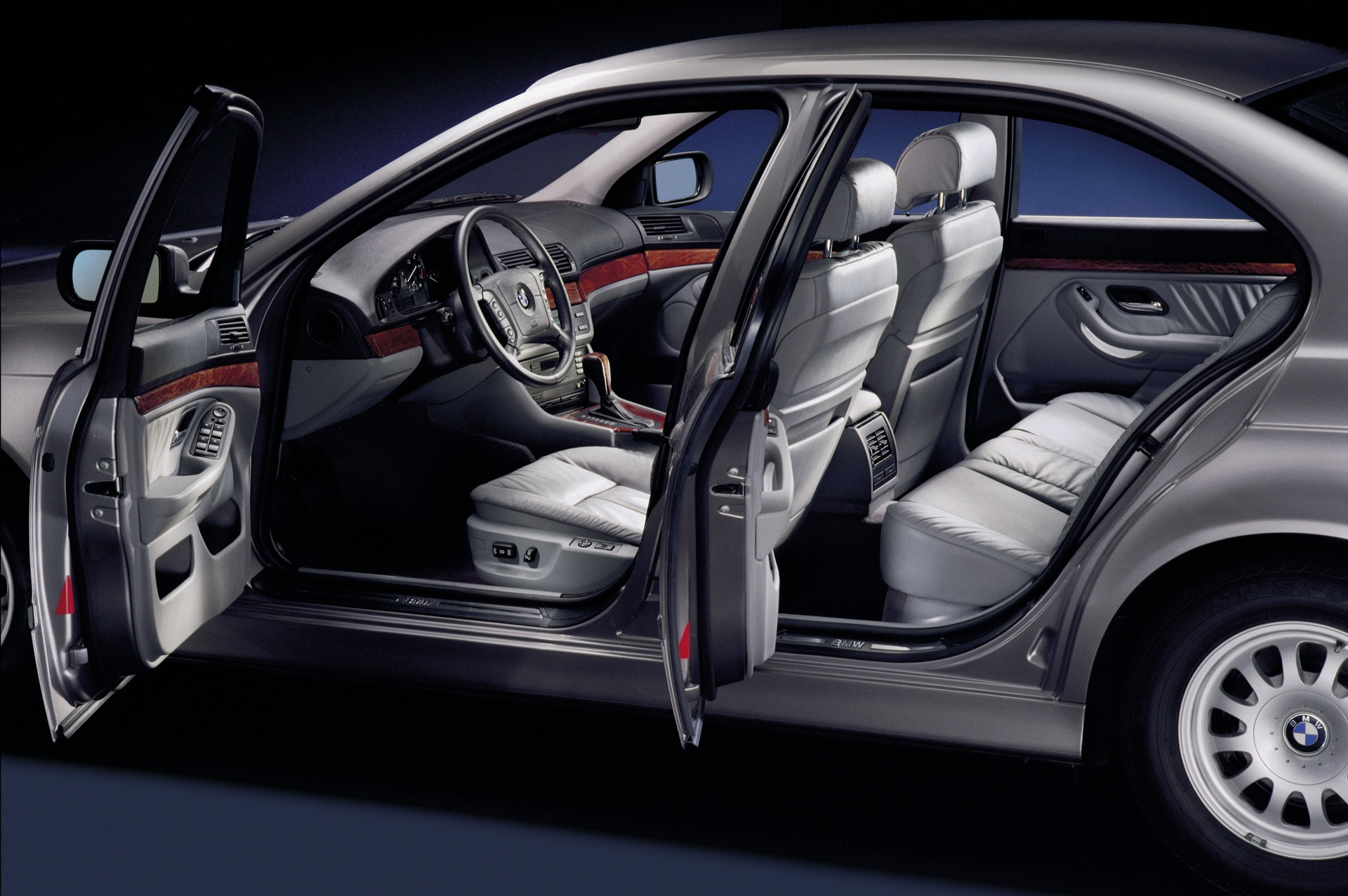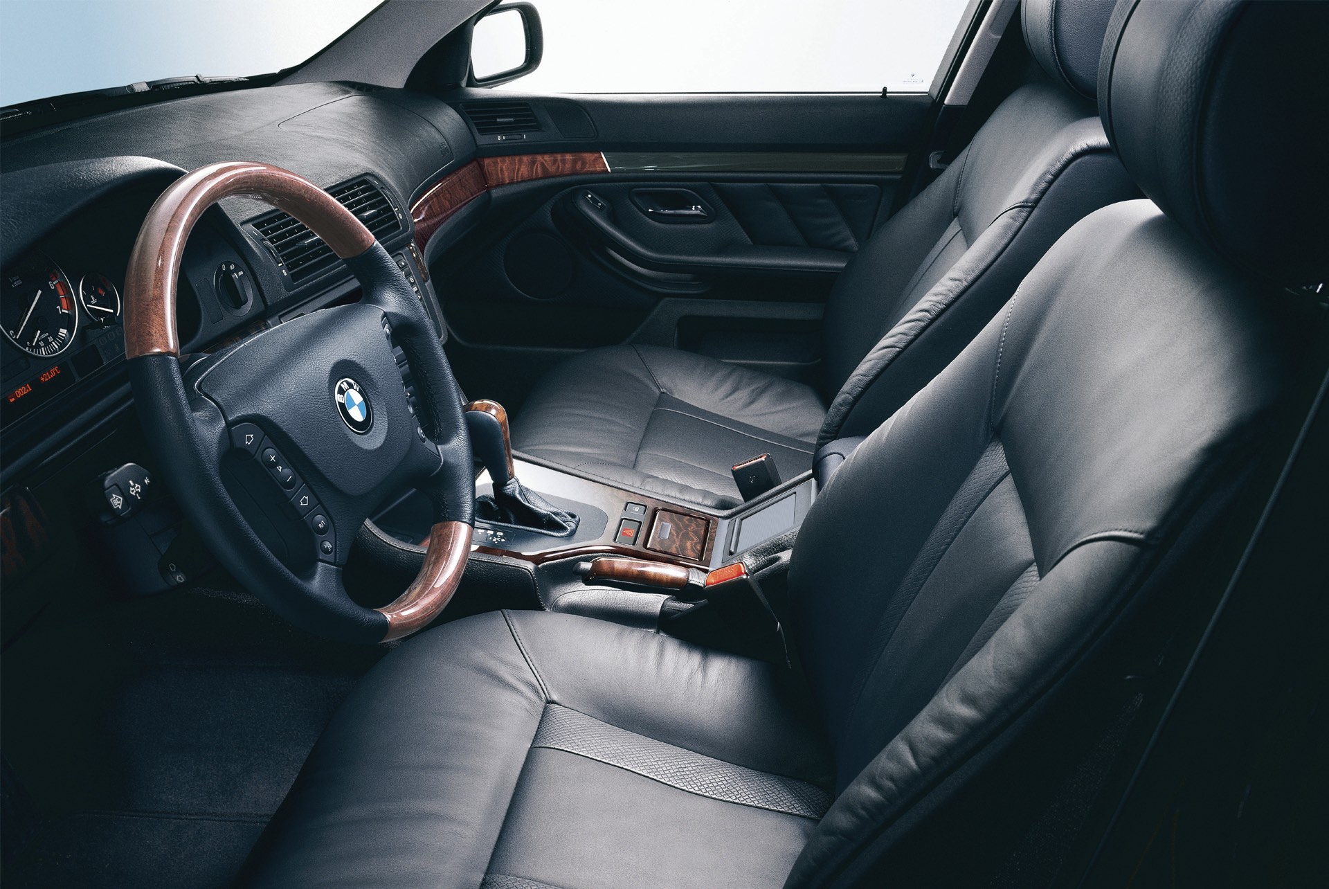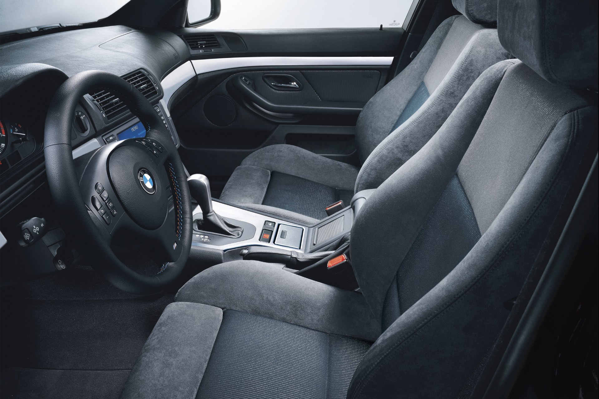 Ganz anders als heute präsentiert sich natürlich auch der Innenraum des BMW 5er E39: Im fahrerorientierten Cockpit, dessen Grund-Layout eng an das der 7er-Generation E38 angelehnt war und wenig später auch im BMW 3er der Generation E46 erfolgreich weitergelebt wurde, konzentrierte sich noch auf klassische Rundinstrumente. Erst später kam auch im E39 ein modernes Display für das Navigationssystem, allerdings in einem völlig anderen Format als heute. Ein interessantes Detail sind die beiden äußeren Luftauslässe, die wie beim 7er in die Türen statt in die Armaturentafel integriert waren.