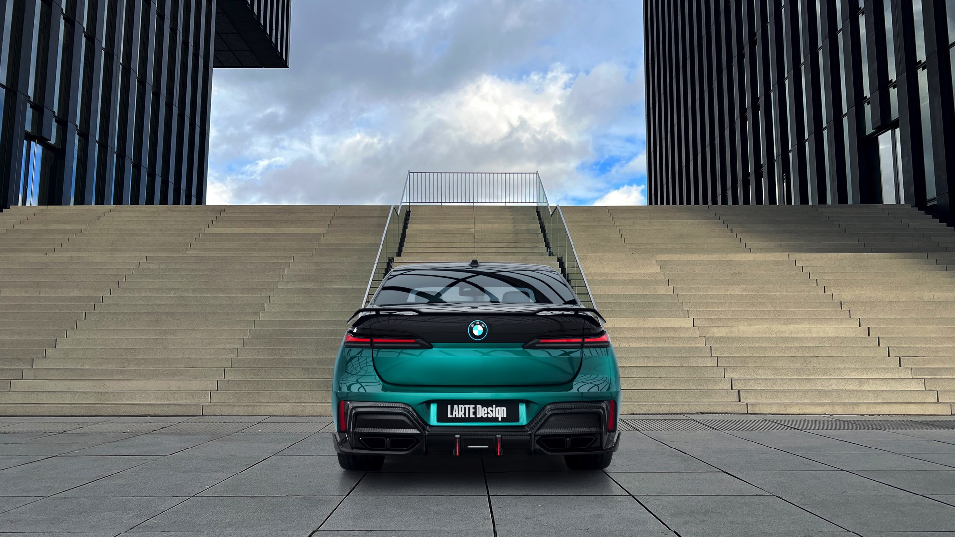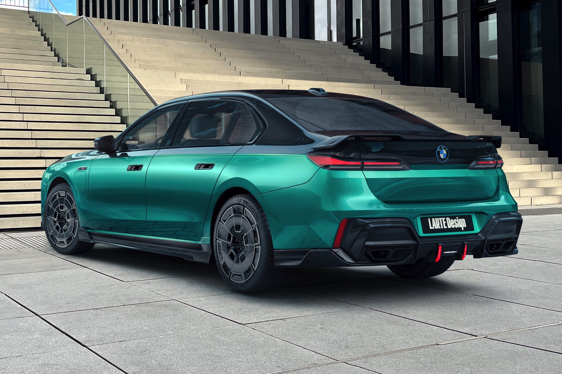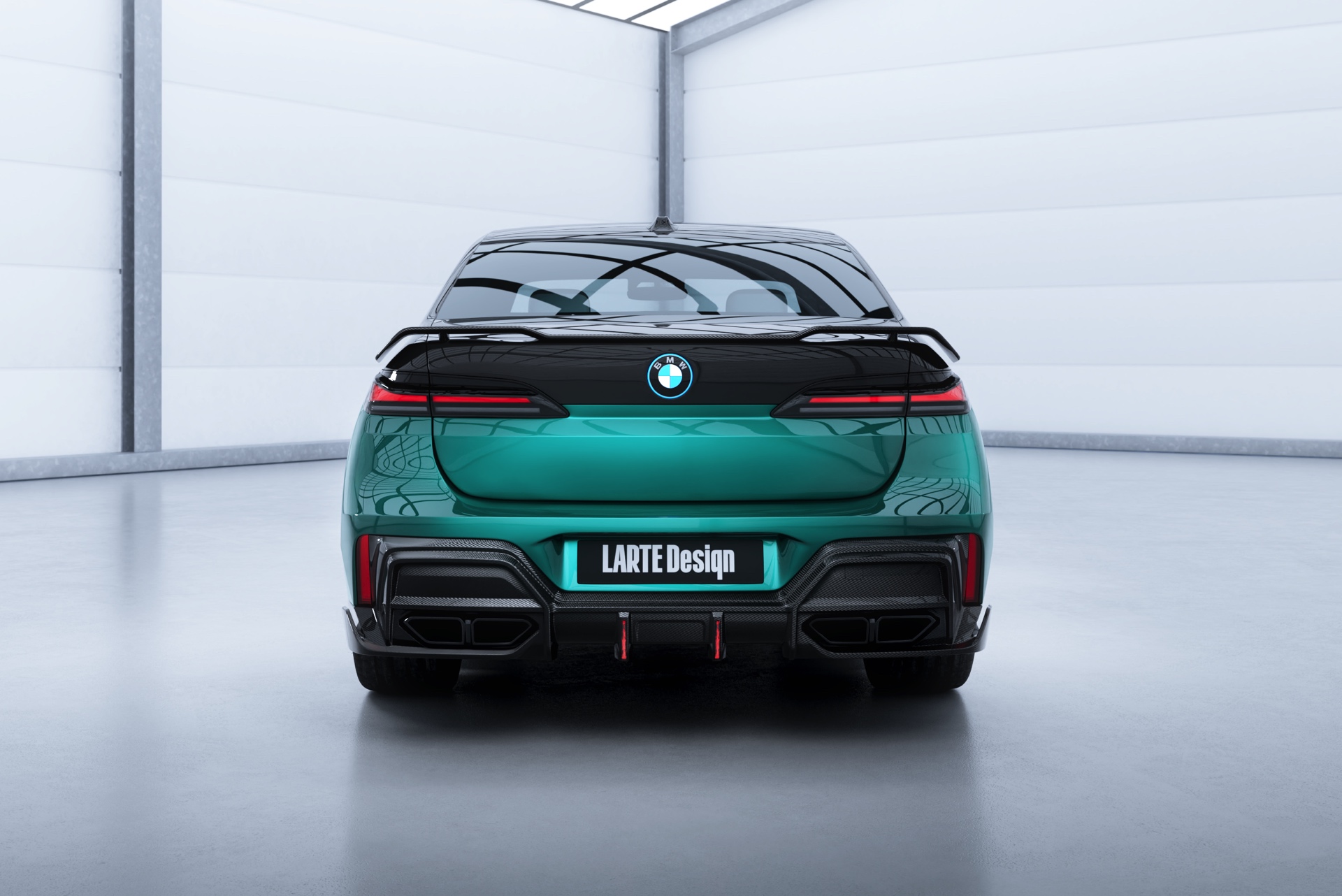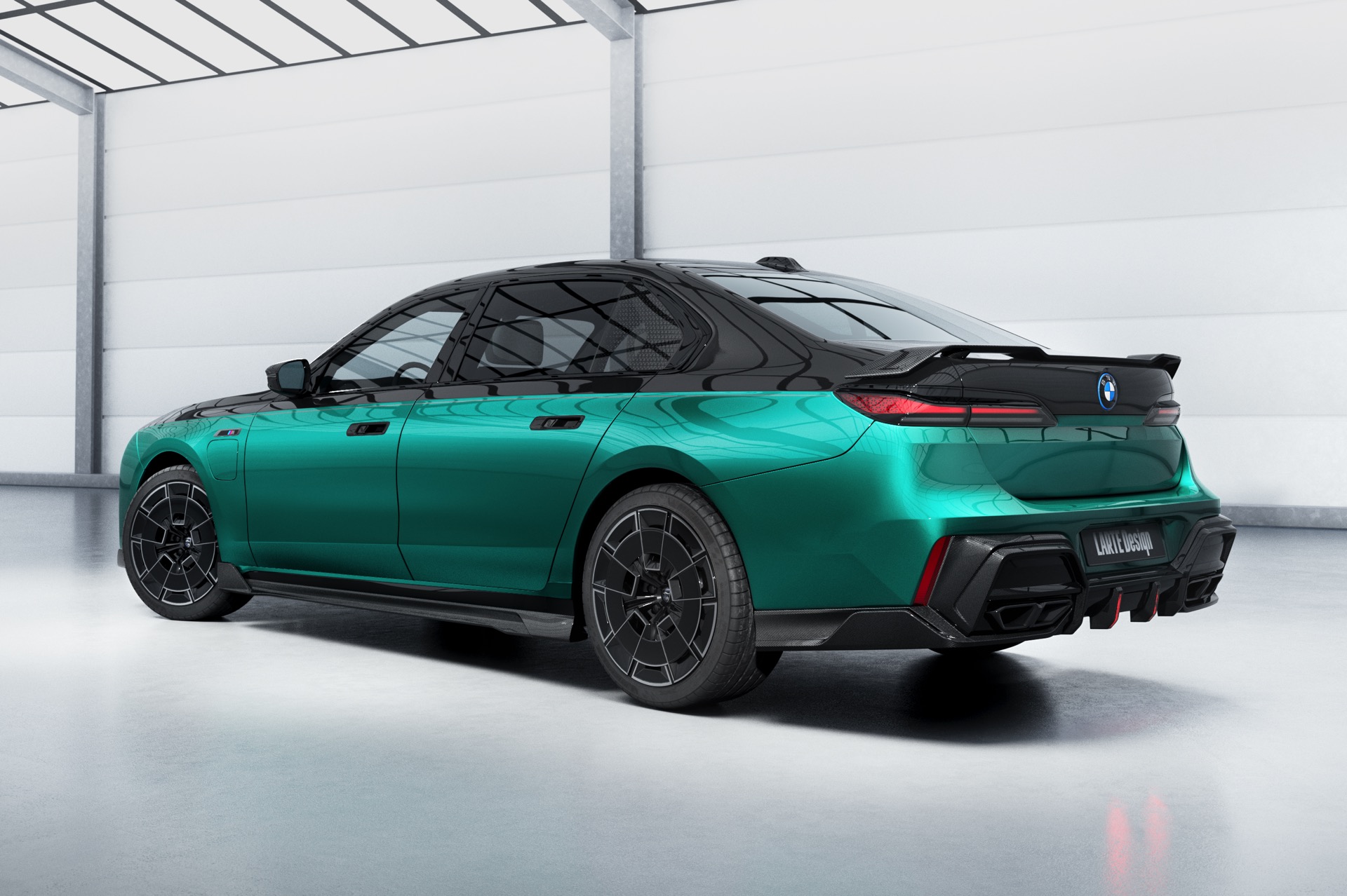 Zur weiteren Abgrenzung von der Serie trägt der BMW 7er von Larte Performance nicht nur eine Frontspoiler-Lippe, und Seitenschweller-Aufsätze aus Carbon, sondern auch ein sportliches Tuning-Paket für die Heckpartie: Hingucker Nummer 1 ist die Carbon-Heckspoiler-Lippe, die die Luft im äußeren Bereich direkt oberhalb der Rückleuchten führt, aber auch darunter gibt es viel zu sehen – der Diffusor-Einsatz von Larte punktet nicht nur mit Sicht-Carbon, sondern auch mit zwei zusätzlichen Bremslicht-Elementen für eine noch exklusivere Brems- und Nachtoptik.