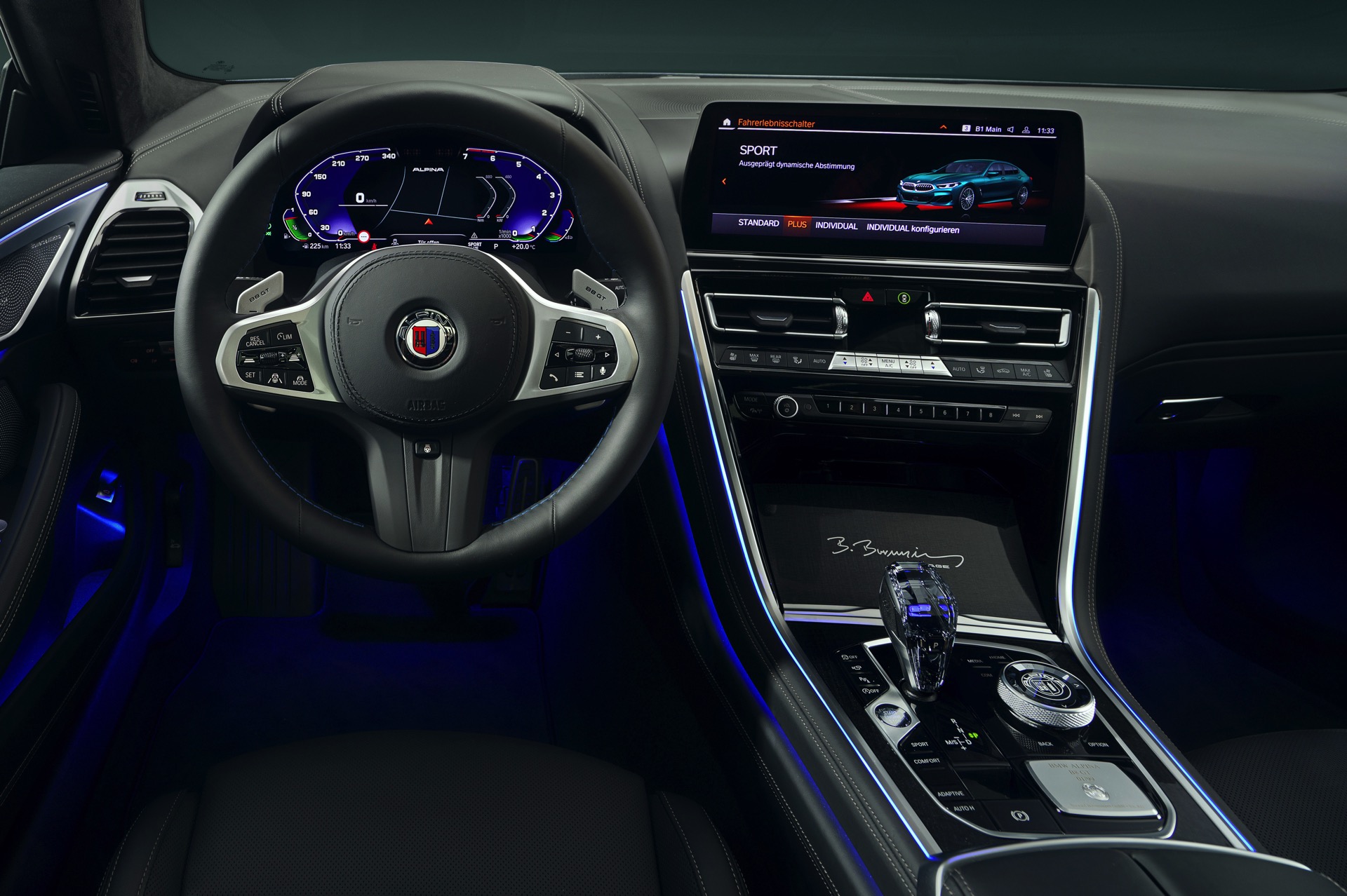 Dass es einem Fahrzeug mit derart exquisitem Auftrag nicht an Kraft mangeln darf, versteht sich in Buchloe von selbst: 634 PS und 850 Newtonmeter Drehmoment leistet der V8-Biturbo, der den BMW Alpina B8 GT ganz nebenbei zum bisher stärksten Serien-8er aller Zeiten macht. Bei Bedarf geht es in 3,3 Sekunden von 0 auf 100, die 200er-Marke fällt nach 10,5 Sekunden und bei der Höchstgeschwindigkeit von 330 km/h beschränkt sich die Konkurrenz beinahe ausnahmslos auf exotische Supersportler. Passend zur Leistungssteigerung gibt es auch eine nochmals optimierte Fahrwerksabstimmung, die in allen Modi ein noch souveräneres Fahrerlebnis verspricht.
