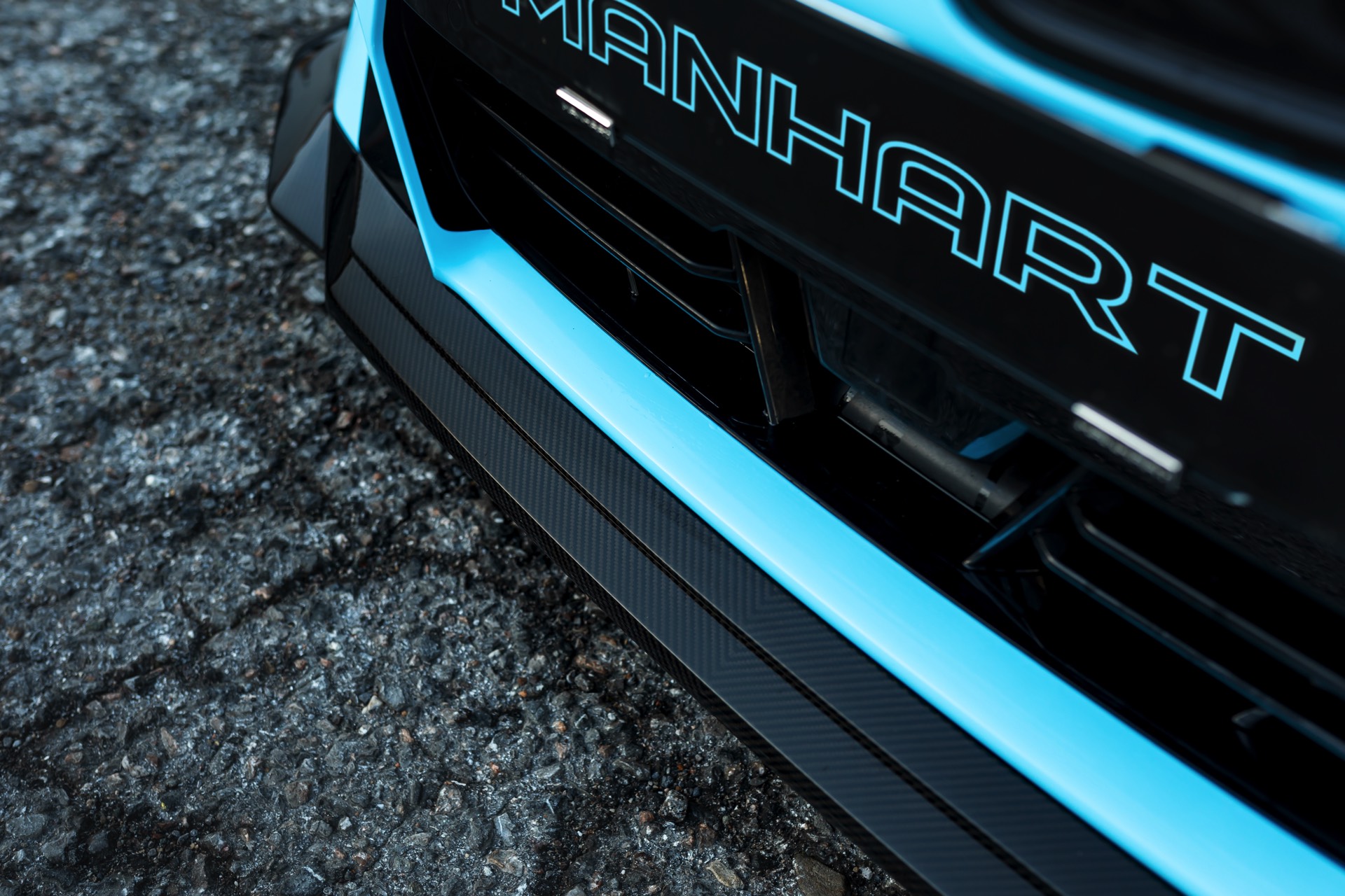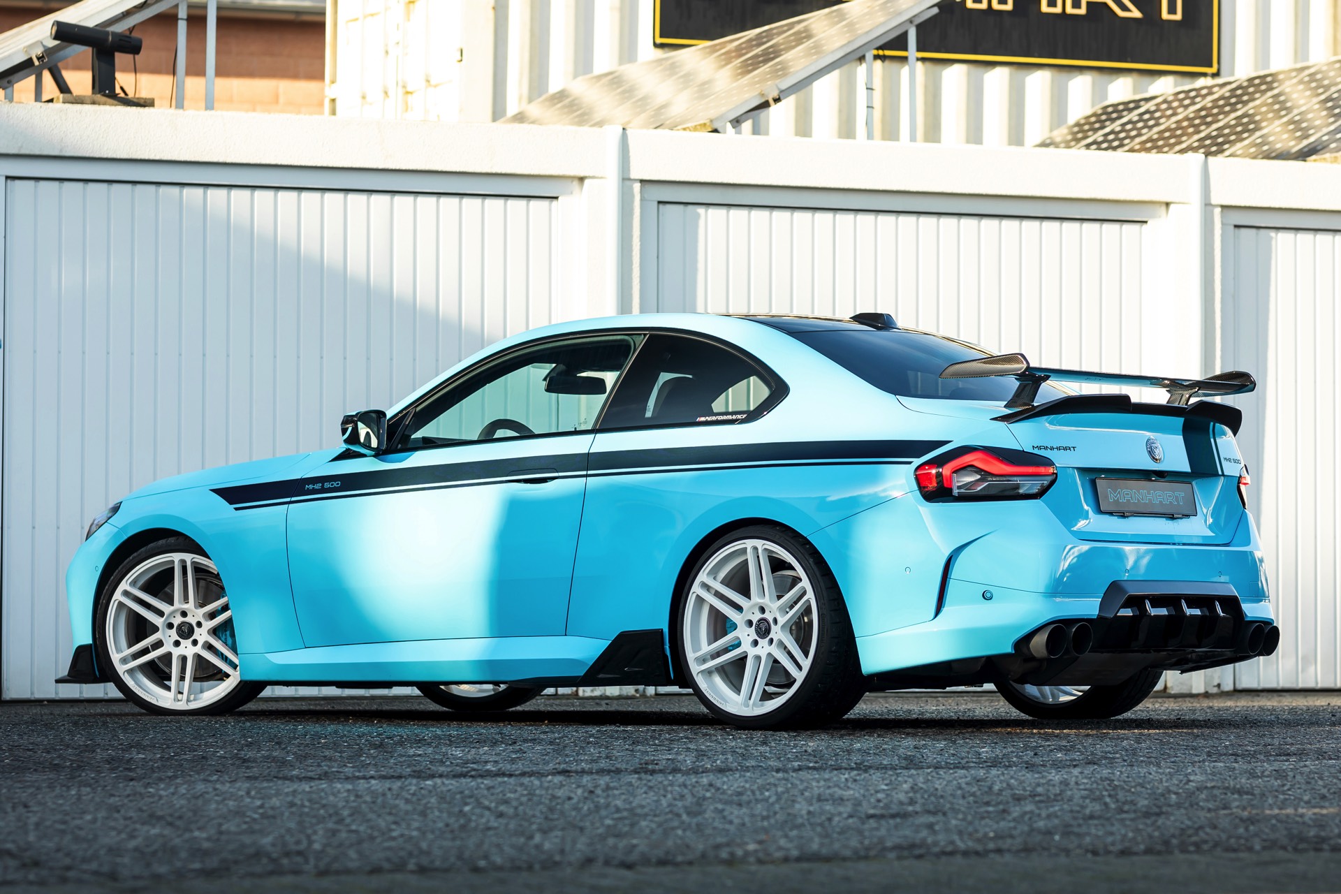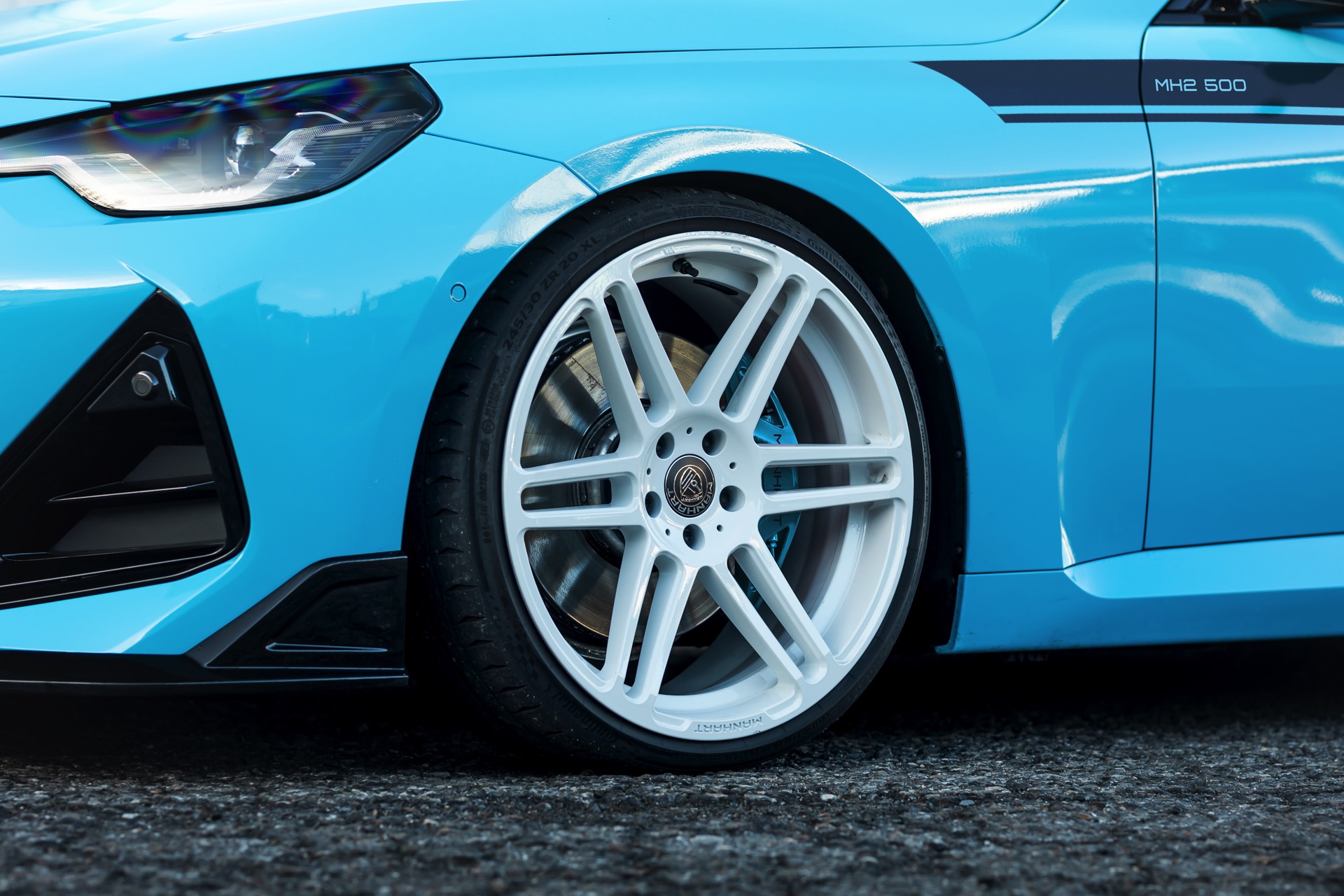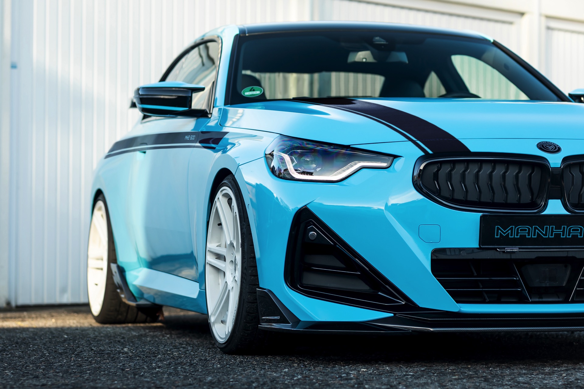 Für die zur Leistung passende Optik trägt der MH2 500 II eine markante Folierung in Hellblau, die mit schwarzen Akzenten den Look der Shadow Line mit erweiterten Umfängen ergänzt. Aerodynamik-Komponenten aus Carbon und weiße, 20 Zoll große Felgen im Concave One-Design von Manhart runden den verschärften Auftritt im Zusammenspiel mit einem Gewindefahrwerk der Variante 3 von KW sehenswert ab.