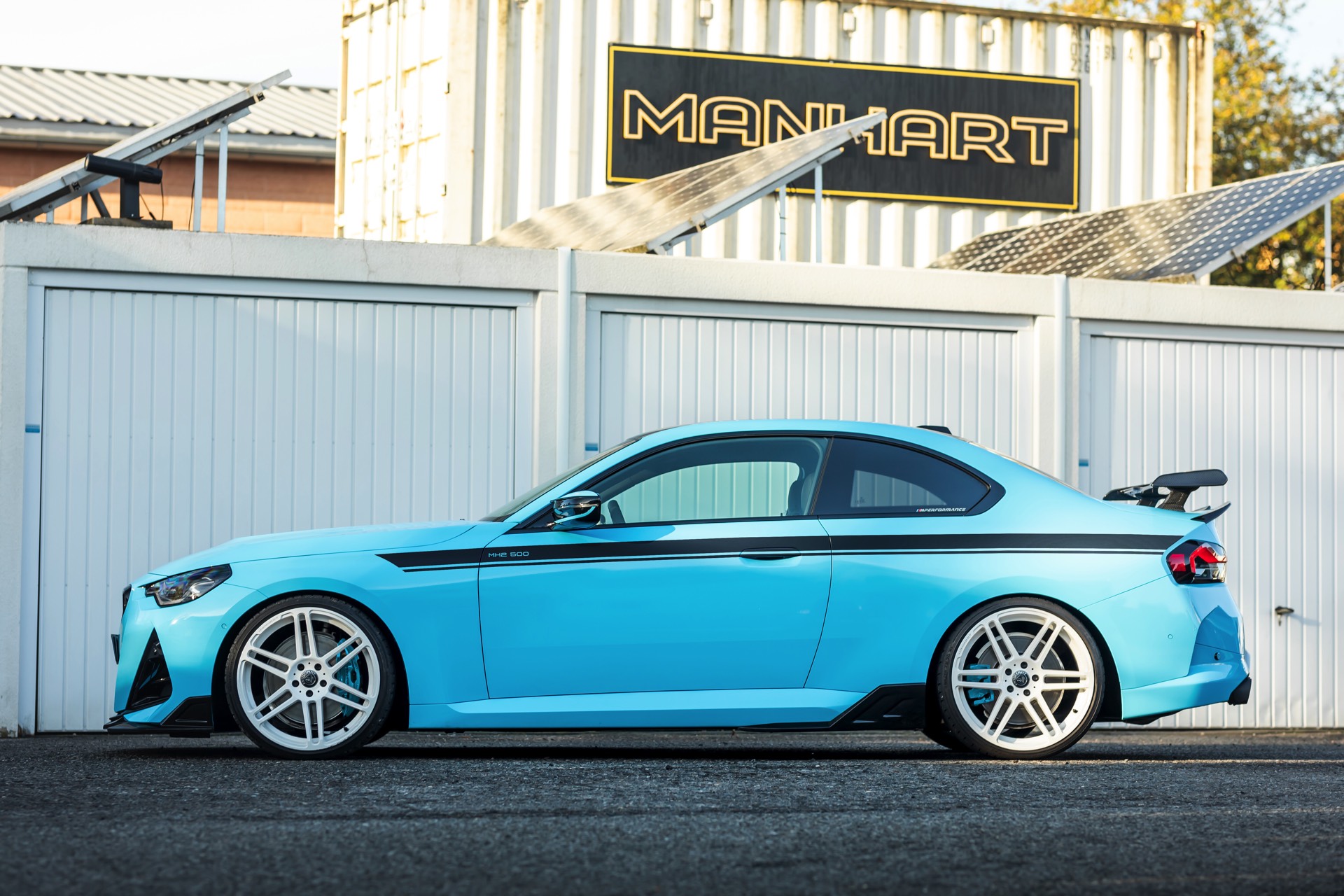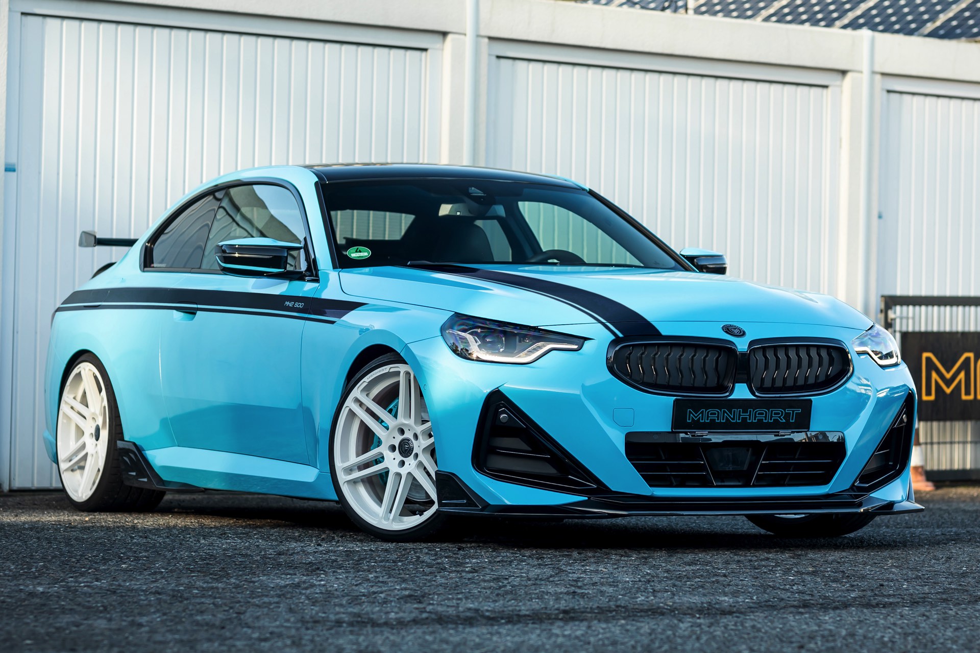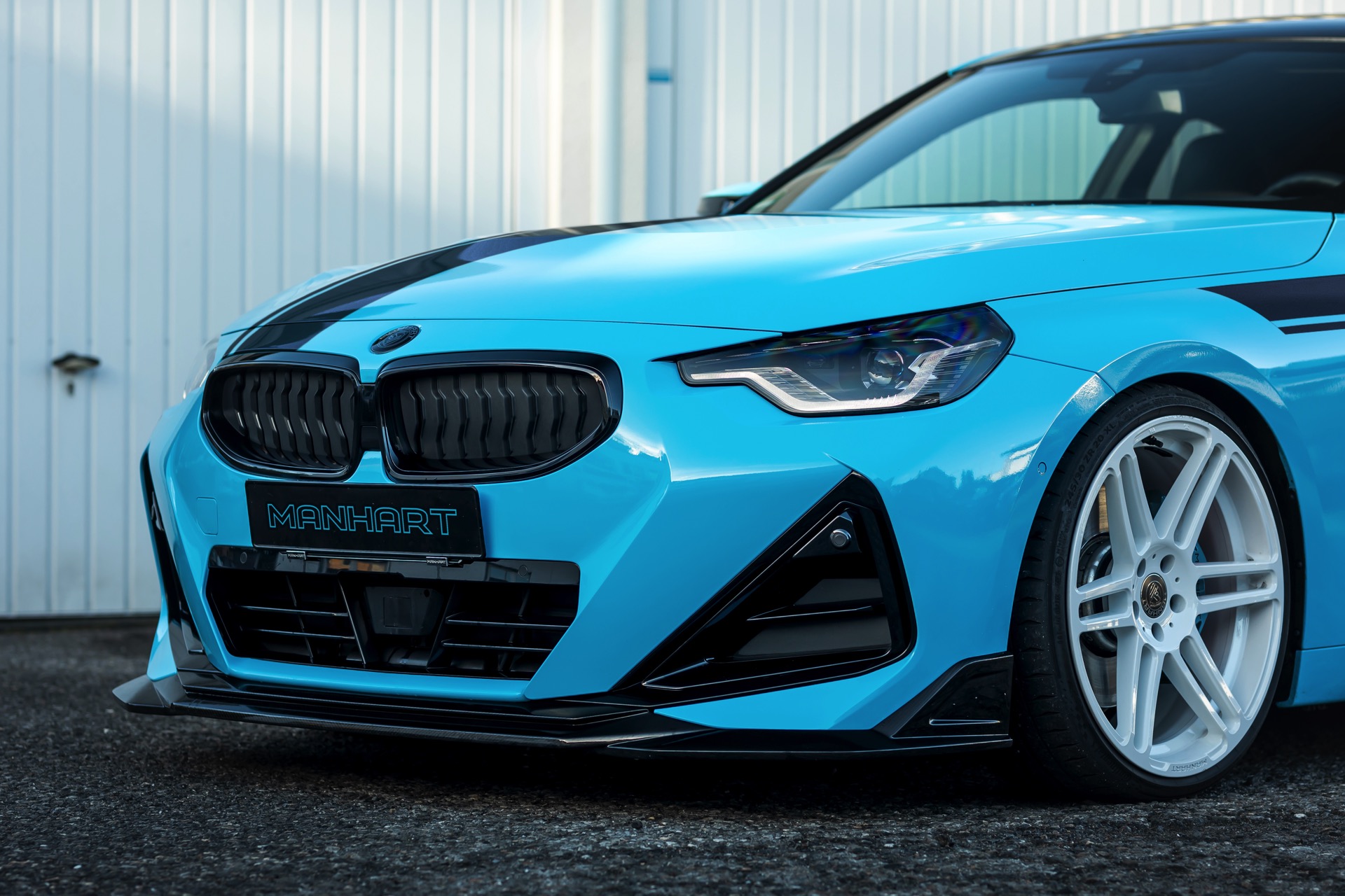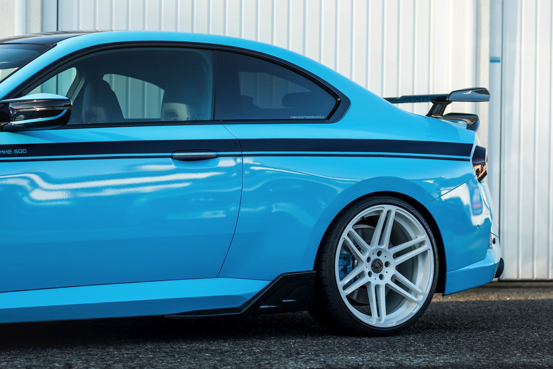 Für die zur Leistung passende Optik trägt der MH2 500 II eine markante Folierung in Hellblau, die mit schwarzen Akzenten den Look der Shadow Line mit erweiterten Umfängen ergänzt. Aerodynamik-Komponenten aus Carbon und weiße, 20 Zoll große Felgen im Concave One-Design von Manhart runden den verschärften Auftritt im Zusammenspiel mit einem Gewindefahrwerk der Variante 3 von KW sehenswert ab.