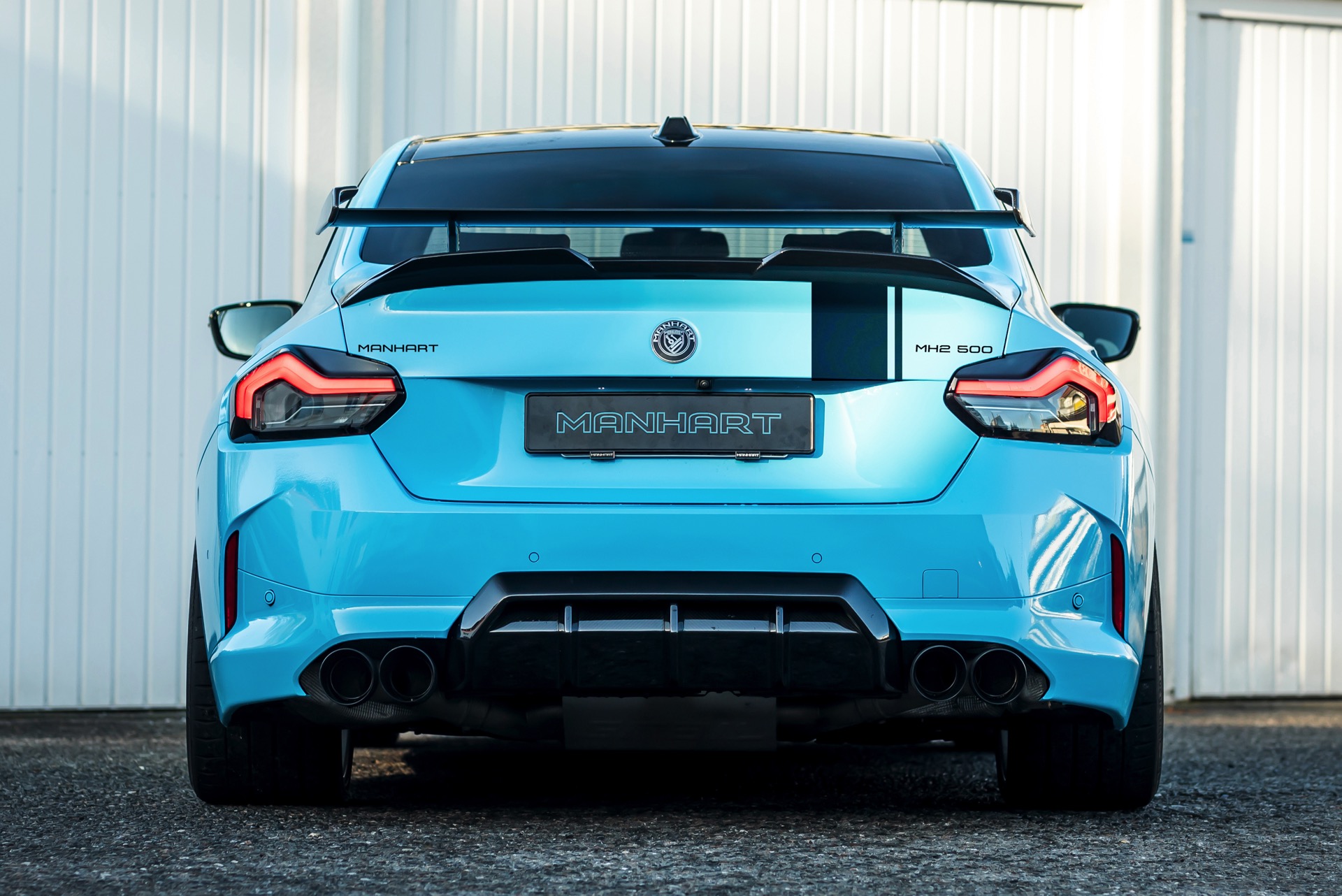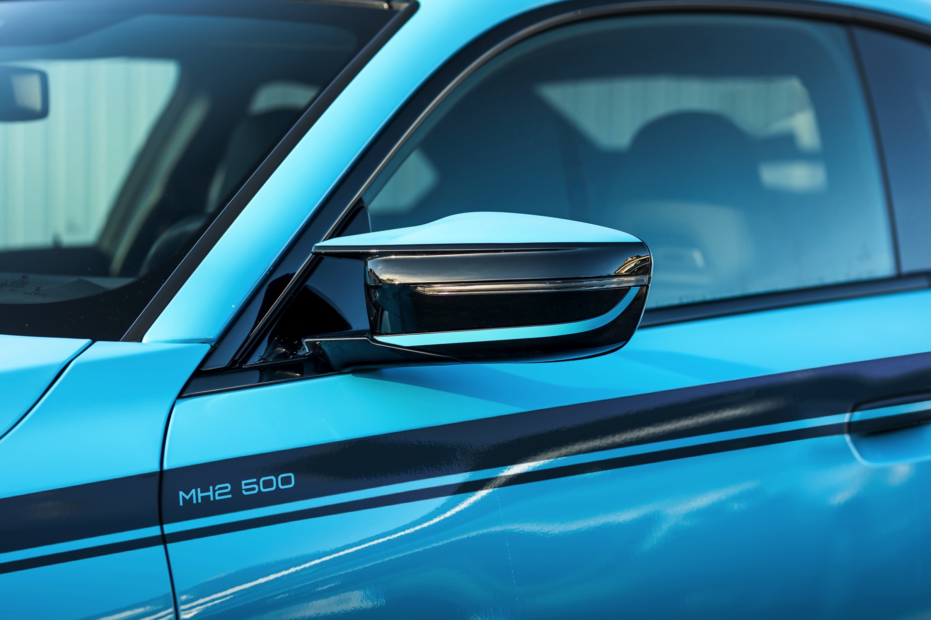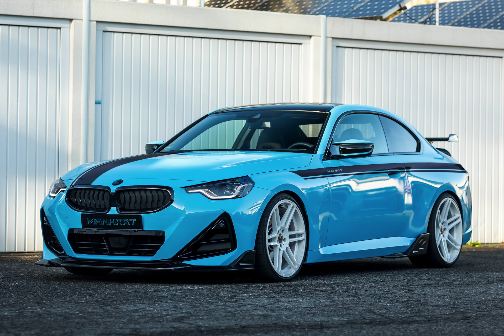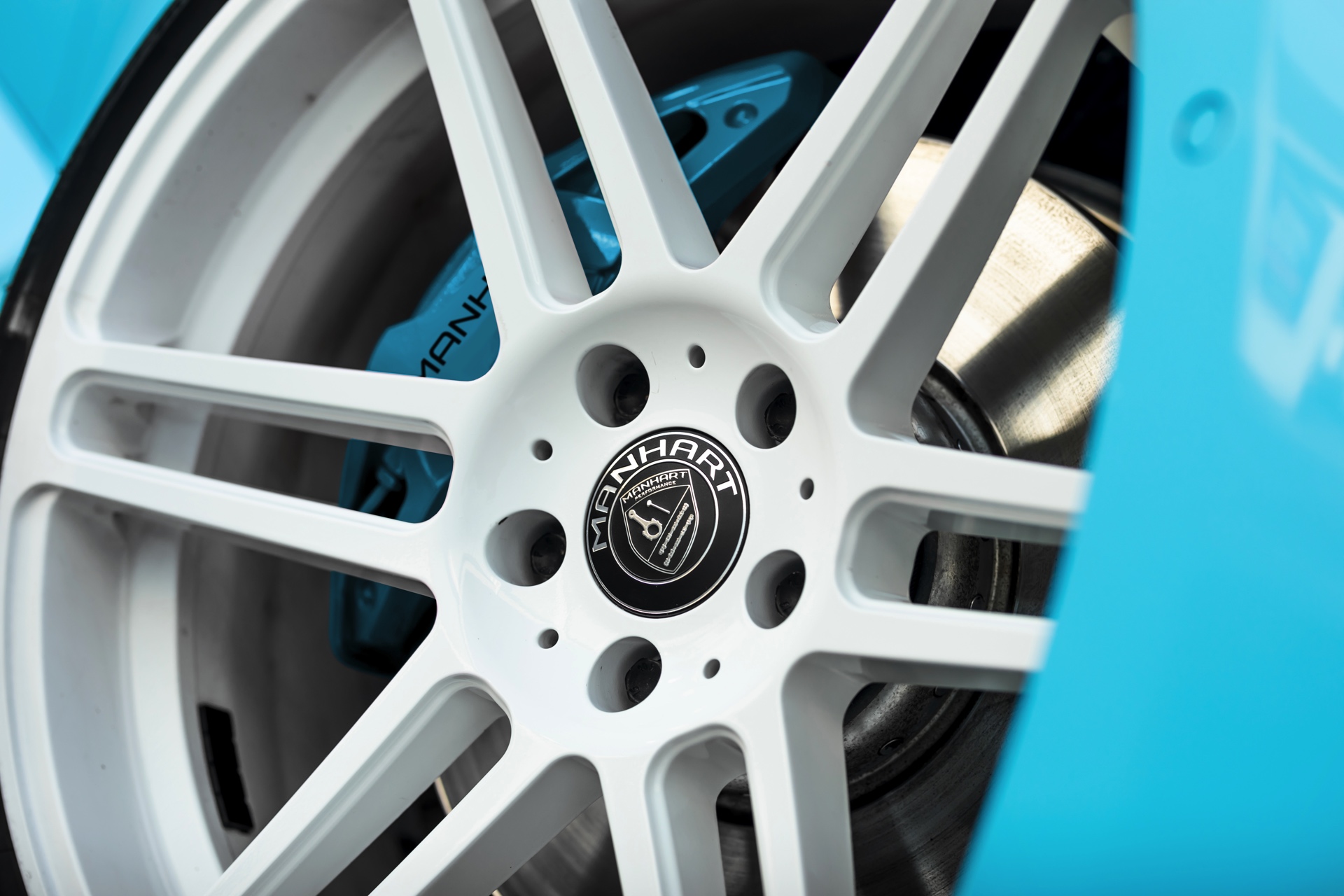 Für die zur Leistung passende Optik trägt der MH2 500 II eine markante Folierung in Hellblau, die mit schwarzen Akzenten den Look der Shadow Line mit erweiterten Umfängen ergänzt. Aerodynamik-Komponenten aus Carbon und weiße, 20 Zoll große Felgen im Concave One-Design von Manhart runden den verschärften Auftritt im Zusammenspiel mit einem Gewindefahrwerk der Variante 3 von KW sehenswert ab.