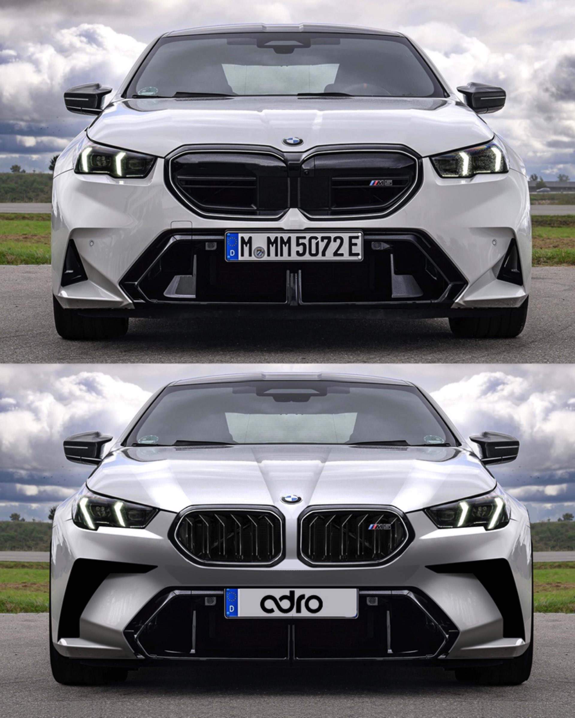 Da bei der aktuellen Niere des BMW M5 der obere Teil geschlossen ist, könnte auch die kleinere Niere genügend Luftzufuhr ermöglichen – die Masse der benötigten Luft kommt ohnehin durch den zentralen Lufteinlass unterhalb der Nieren. Außerdem kommt der M5-Entwurf von Adro.Davis mit deutlich markanteren Lufteinlässen unterhalb der Scheinwerfer, die den M5 noch etwas aggressiver wirken lassen.