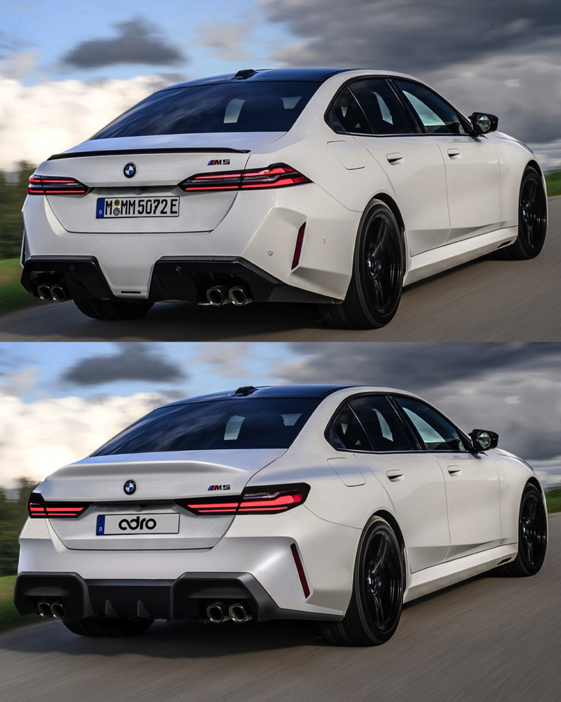 Im direkten Vergleich mit dem tatsächlichen G90 zeigt sich, dass der Entwurf von Adro.Davis auch über oben stärker einzogene hintere Kotflügel verfügt. In Verbindung mit den modifizierten Rückleuchten, die sich klar vom regulären BMW 5er (G60) und M5 (G90) unterscheiden und eine stärkere L-Form tragen, ergibt sich eine grundlegend veränderte Optik.
