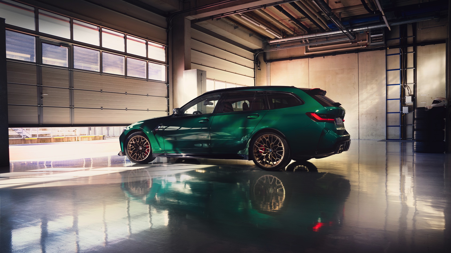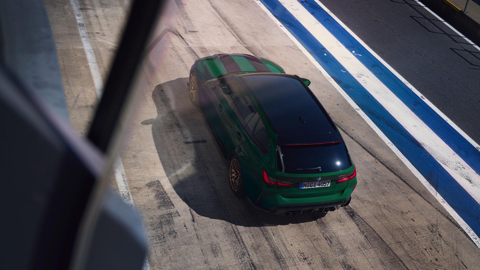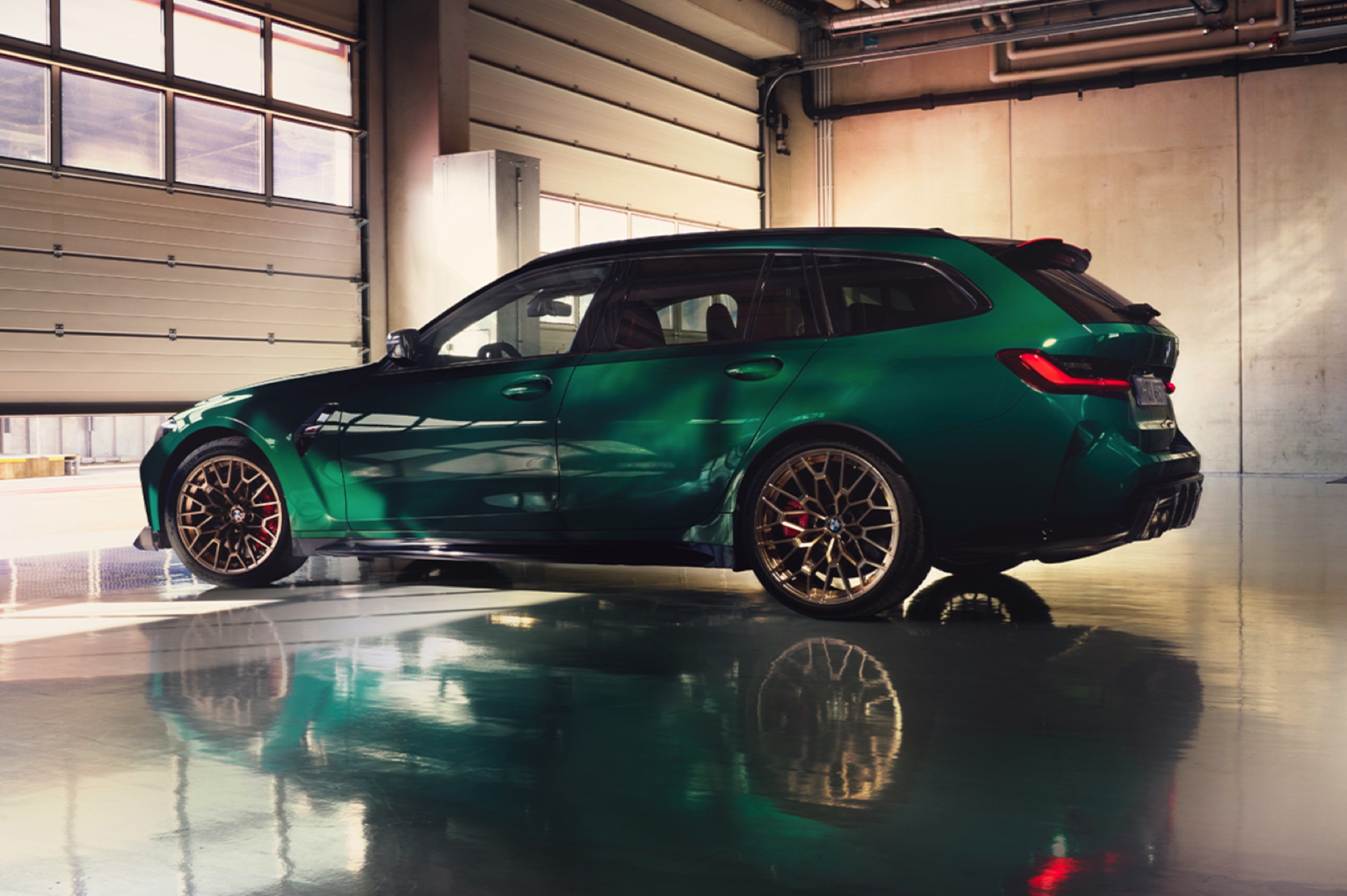 Wer allerdings schon weiß, dass er seinen BMW M3 CS Touring mit dem matt-goldenen Finish für die vorne 19 und hinten 20 Zoll großen Leichtmetallräder Sternspeiche 827 M bestellen will, könnte sich dabei etwas leichter tun: Die offiziell Goldbronze matt genannte Lackierung harmoniert offenbar ganz hervorragend mit British Racing Green. Hinter den Felgen sehen wir rote Bremssättel, die sich aber nicht mehr auf den ersten Blick mit einer der beiden Bremsanlagen assoziieren lassen: Sowohl die Compound-Bremse als auch die optionale Carbon-Keramik-Bremse können mit roten Sätteln bestellt werden.