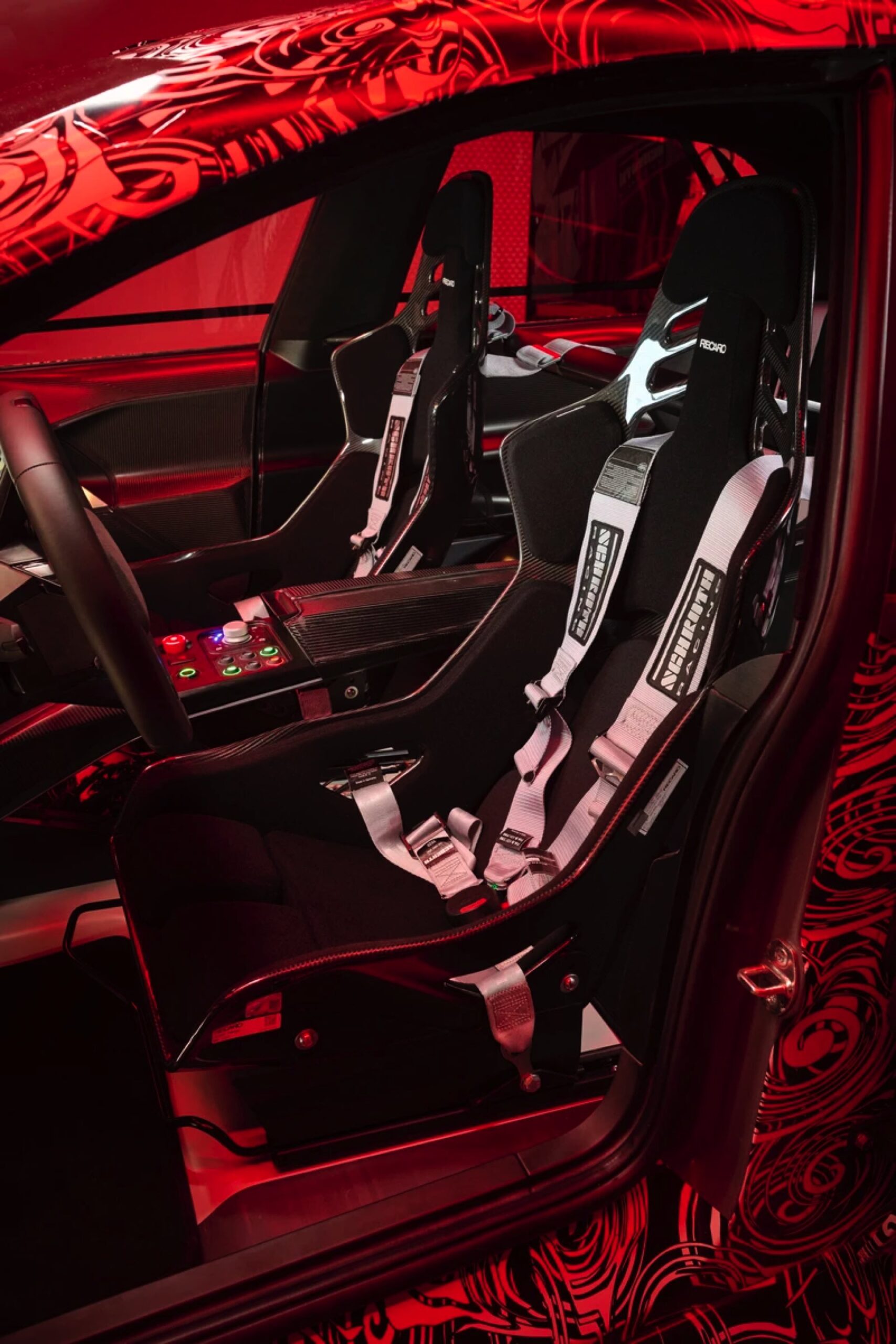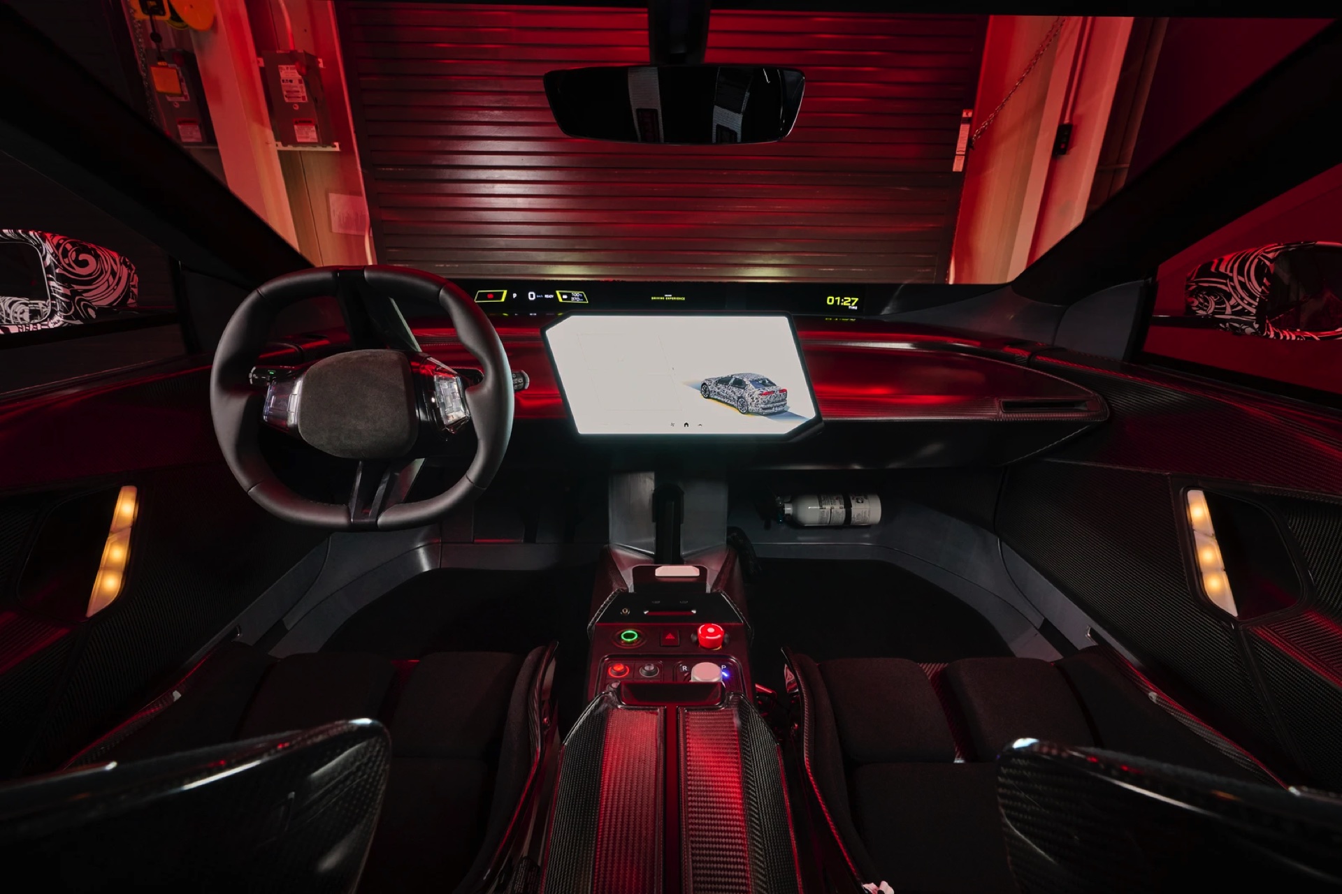 Die Dachlinie weist darauf hin, dass auch in der zweiten Reihe genügend Kopffreiheit erhalten bleibt – obwohl der Innenraum des Vision Cars mit seinen zwei Schalensitzen und der reduzierten Instrumententafel eher an einen Rennwagen als an ein Serienfahrzeug erinnert. Obwohl das Cockpit des BMW Vision Driving Experience stark reduziert ist, sind auch Features wie das große Infotainment-Display und das BMW Panoramic Vision Display von iDrive X erkennbar.