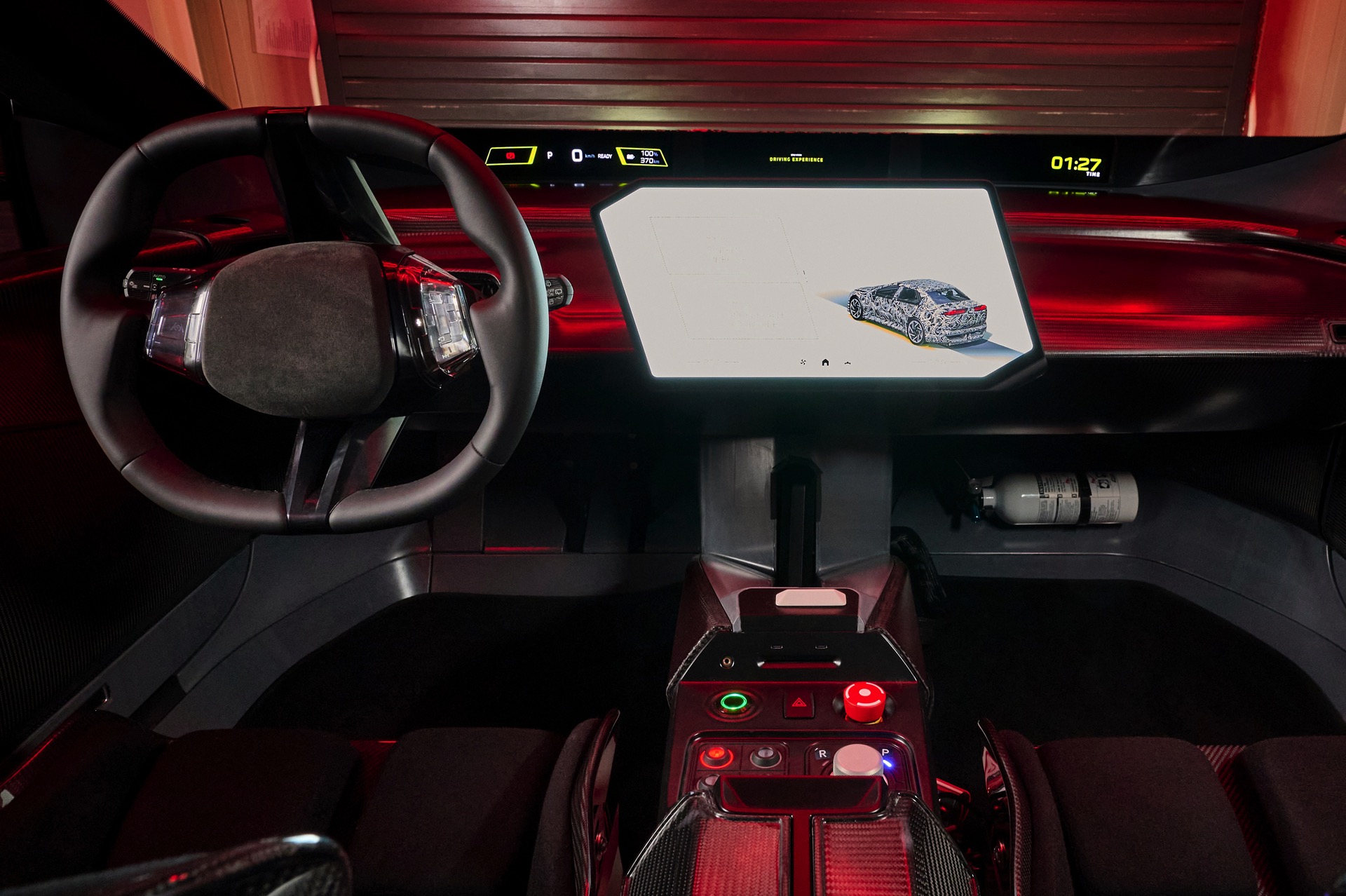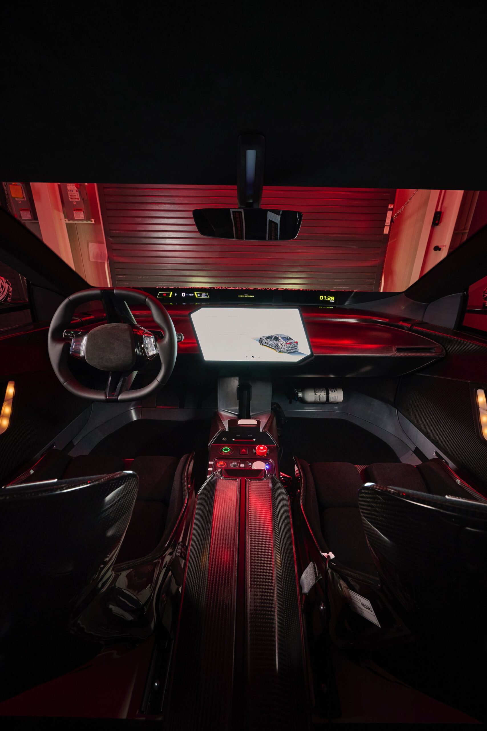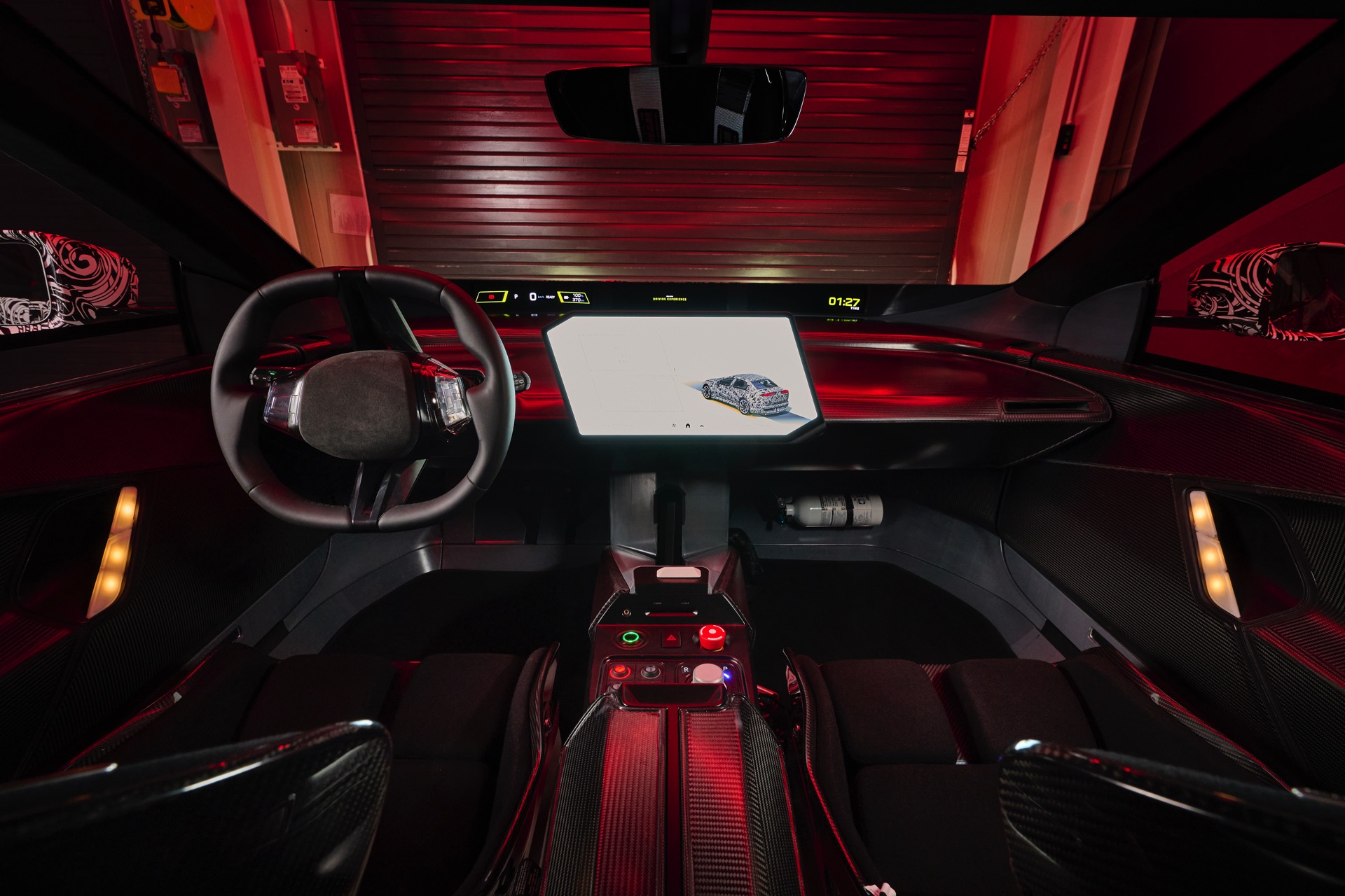 Dass die Performance des Vision Cars enorm ist, zeigt der Blick in den Innenraum: Recaro Carbon-Schalensitze mit Mehrpunkt-Gurten, eine aus Carbon bestehende Mittelkonsole mit wenigen Knöpfen und ein unübersehbarer Verzicht auf Geräuschdämmung und andere Komfort-Features erinnern eher an einen Rennwagen als an einen Erlkönig für ein Serienfahrzeug. Dennoch ist die technische Nähe zur Serie gut erkennbar, unter anderem am Panoramic Vision Display und am Neue Klasse-Lenkrad mit seinem charakteristischen Speichen-Design.