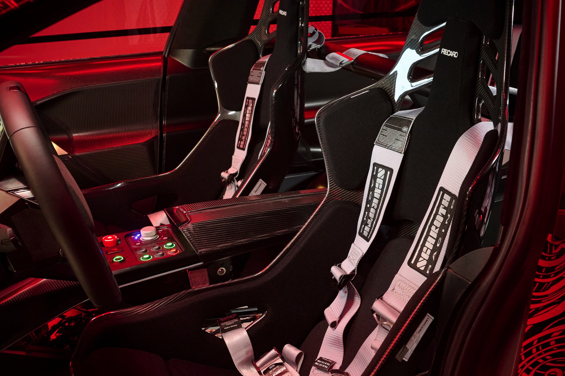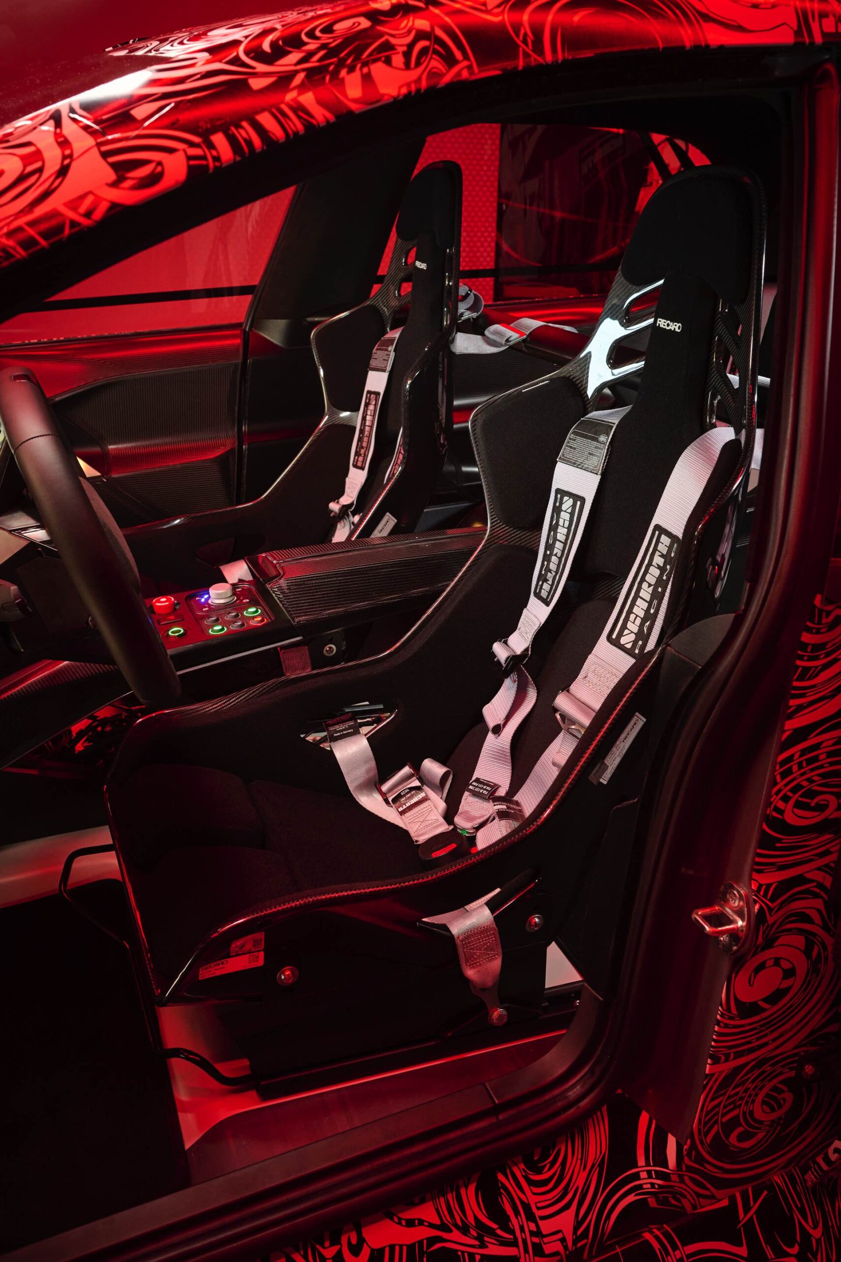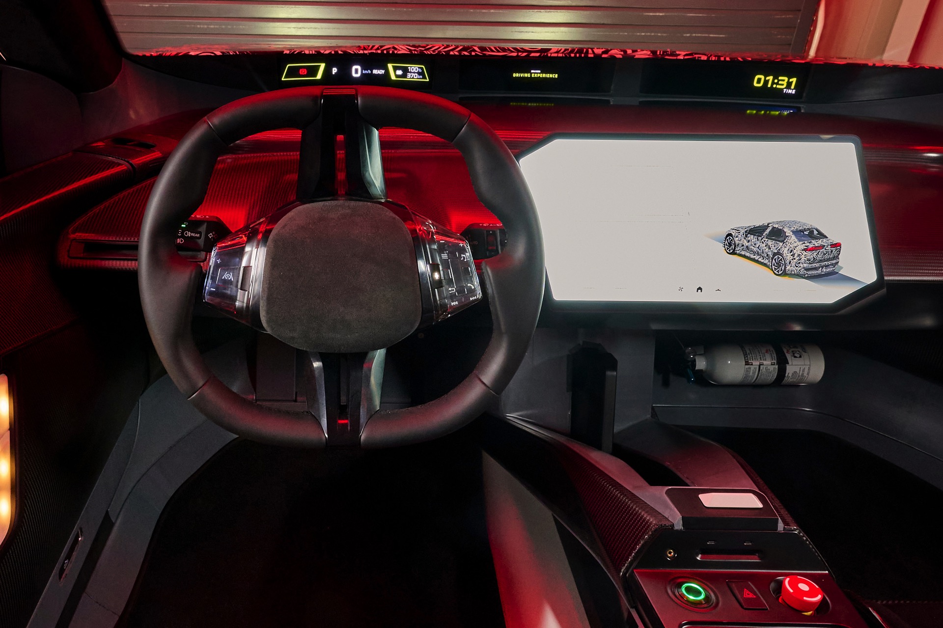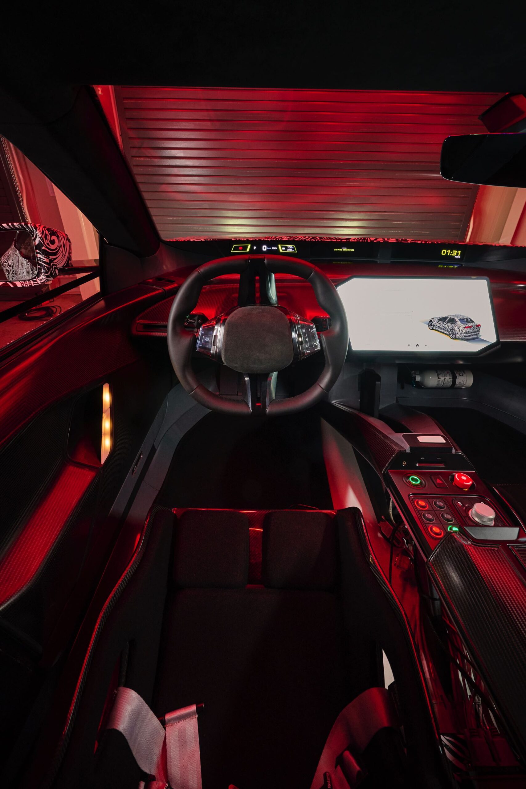 Dass die Performance des Vision Cars enorm ist, zeigt der Blick in den Innenraum: Recaro Carbon-Schalensitze mit Mehrpunkt-Gurten, eine aus Carbon bestehende Mittelkonsole mit wenigen Knöpfen und ein unübersehbarer Verzicht auf Geräuschdämmung und andere Komfort-Features erinnern eher an einen Rennwagen als an einen Erlkönig für ein Serienfahrzeug. Dennoch ist die technische Nähe zur Serie gut erkennbar, unter anderem am Panoramic Vision Display und am Neue Klasse-Lenkrad mit seinem charakteristischen Speichen-Design.