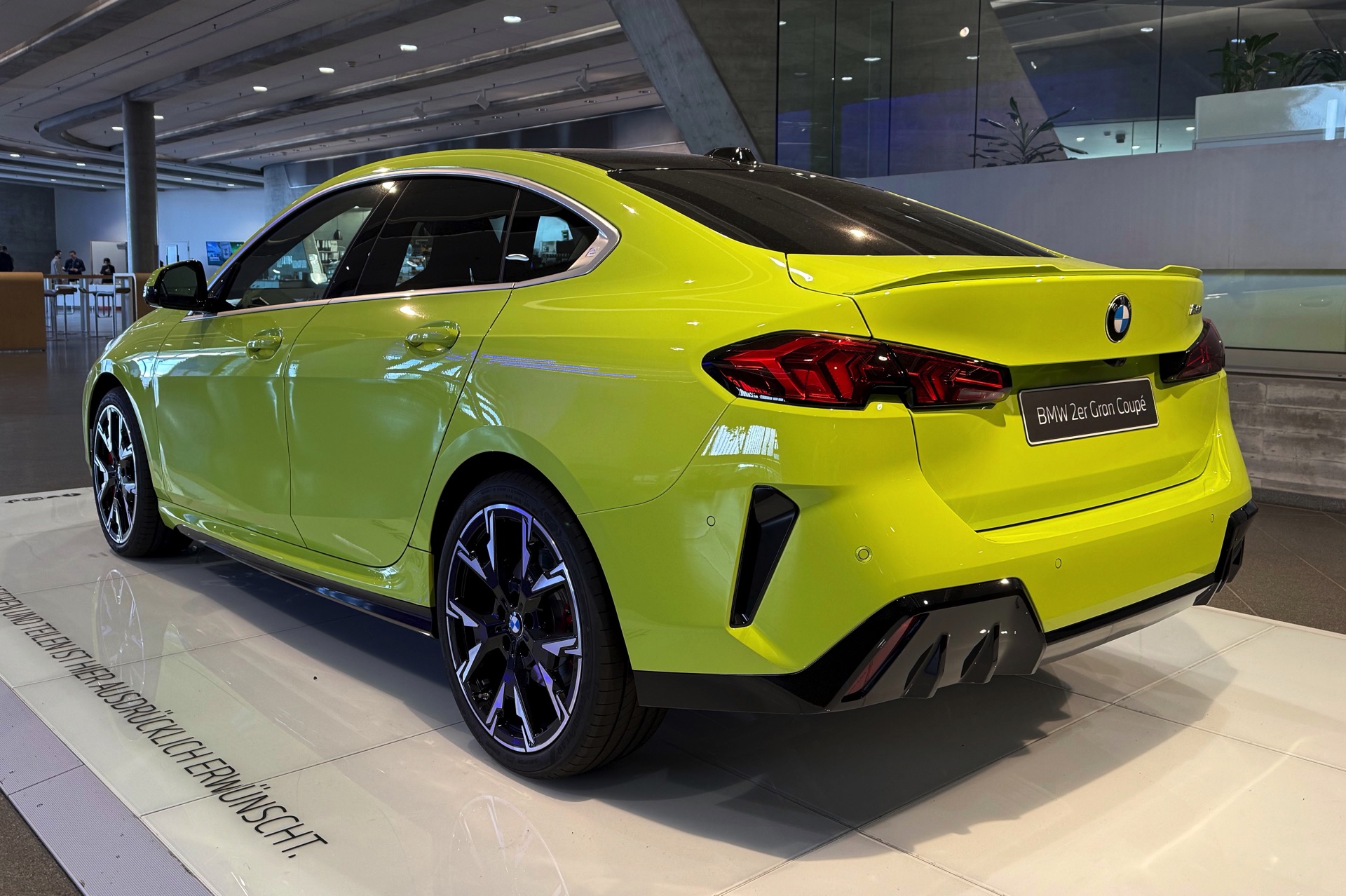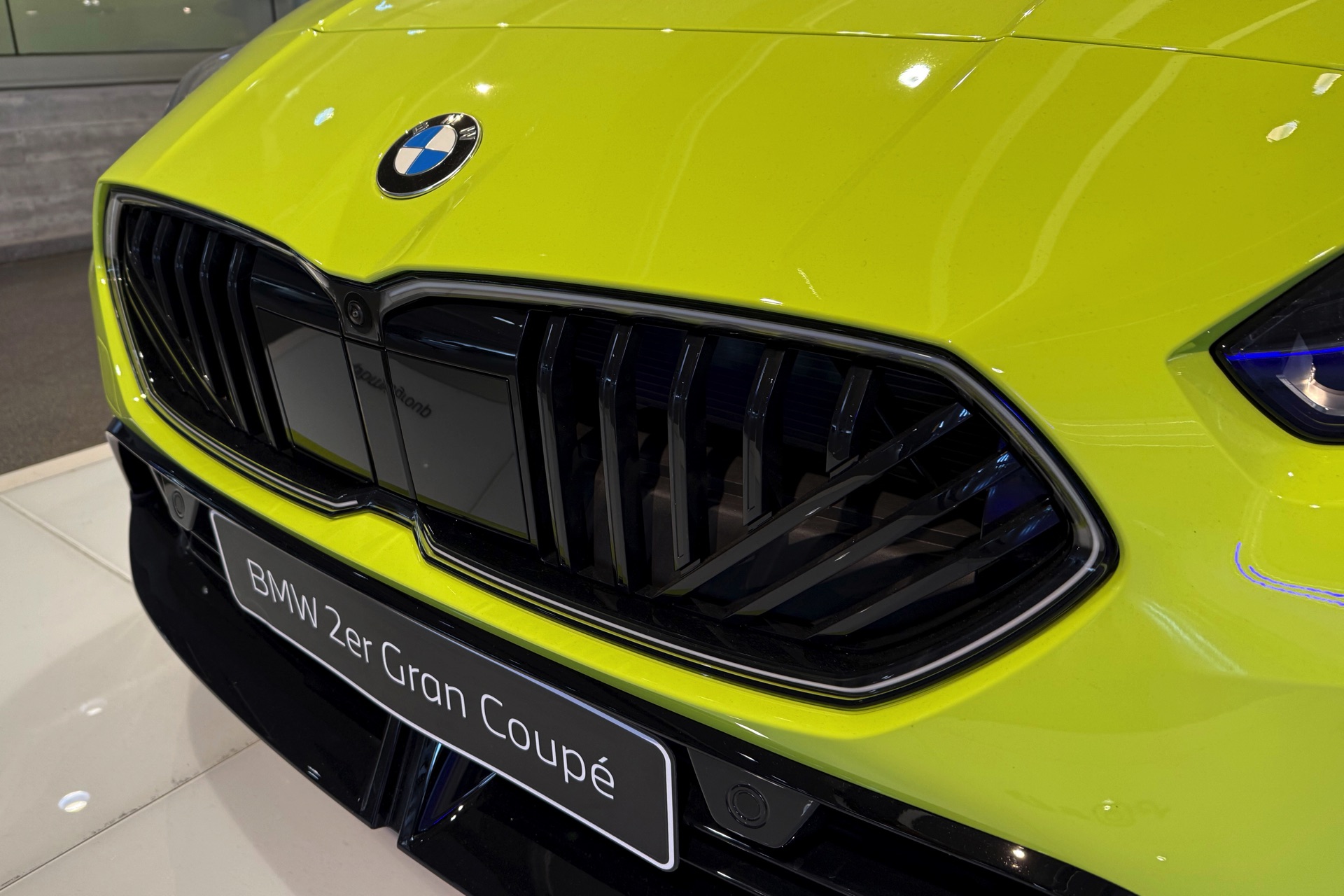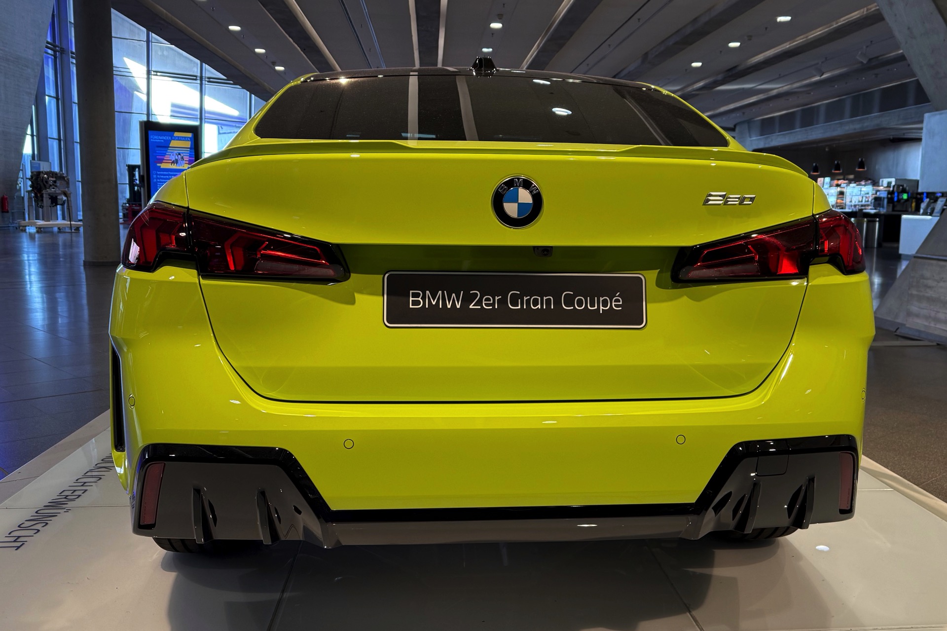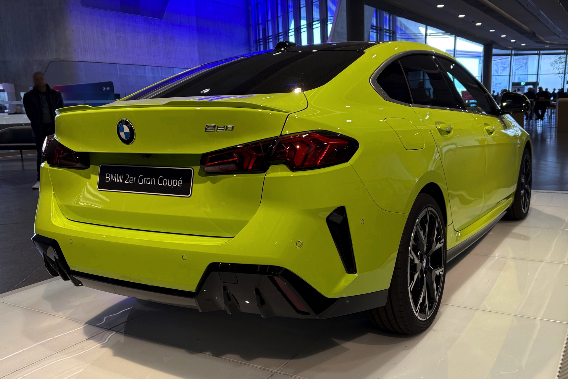 Das viertürige Kompaktklasse-Coupé trägt neben der exklusiven Lackierung auch das M Sport-Paket und die 19 Zoll großen Leichtmetallräder Y-Speiche 976 M Bicolor. Bemerkenswert sind manche Details des gezeigten BMW 2er Gran Coupé: Die Einfassungen der Seitenscheiben samt der geprägten 2 im Bereich des Hofmeister-Knicks glänzen offenbar silbern, obwohl die M Hochglanz Shadow Line mit ihren schwarzen Einfassungen heute zum Serienumfang zählt. Auch die roten Bremssättel der M Sportbremse sind so eigentlich nicht erhältlich, denn sie sind immer Bestandteil des M Sport Pro-Pakets und würden dann mit mehr schwarzen Akzenten kombiniert werden.