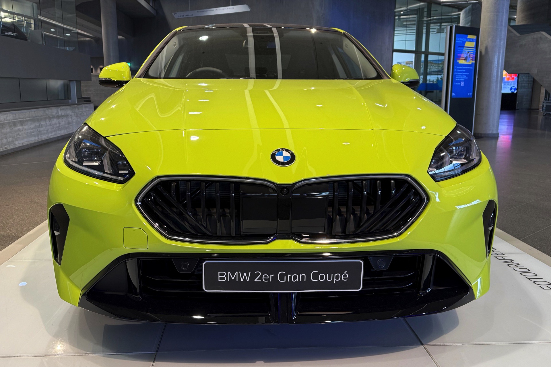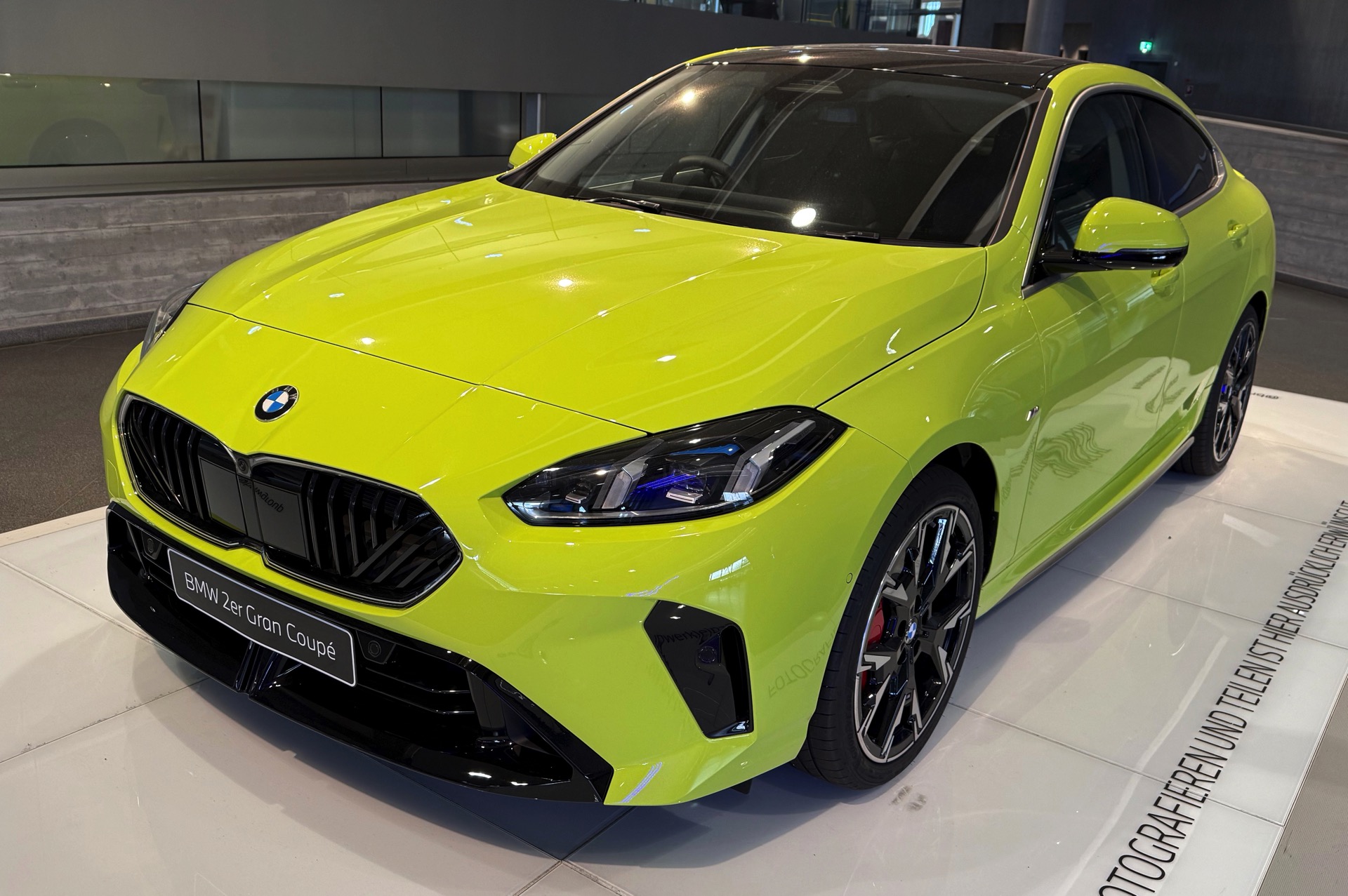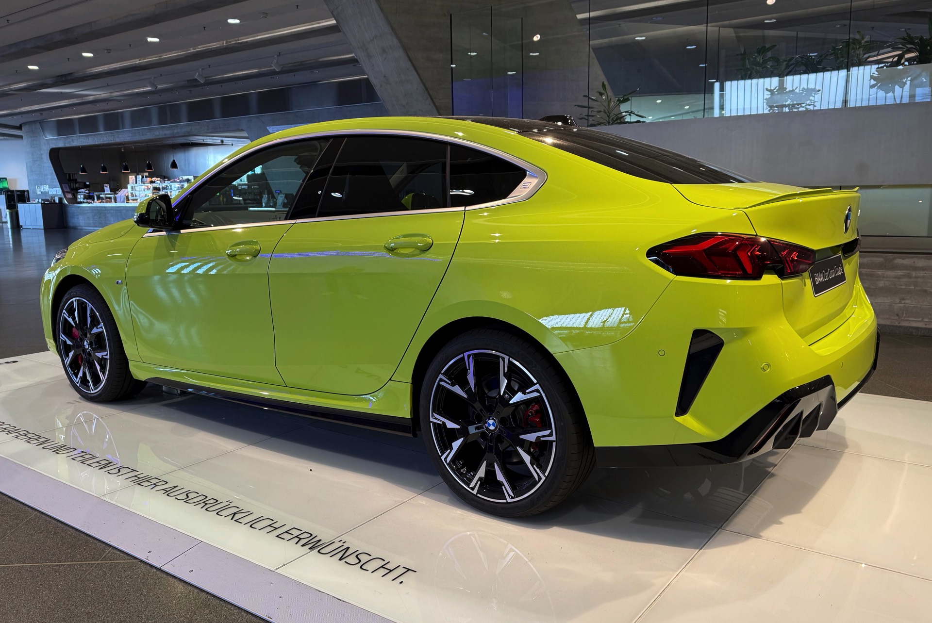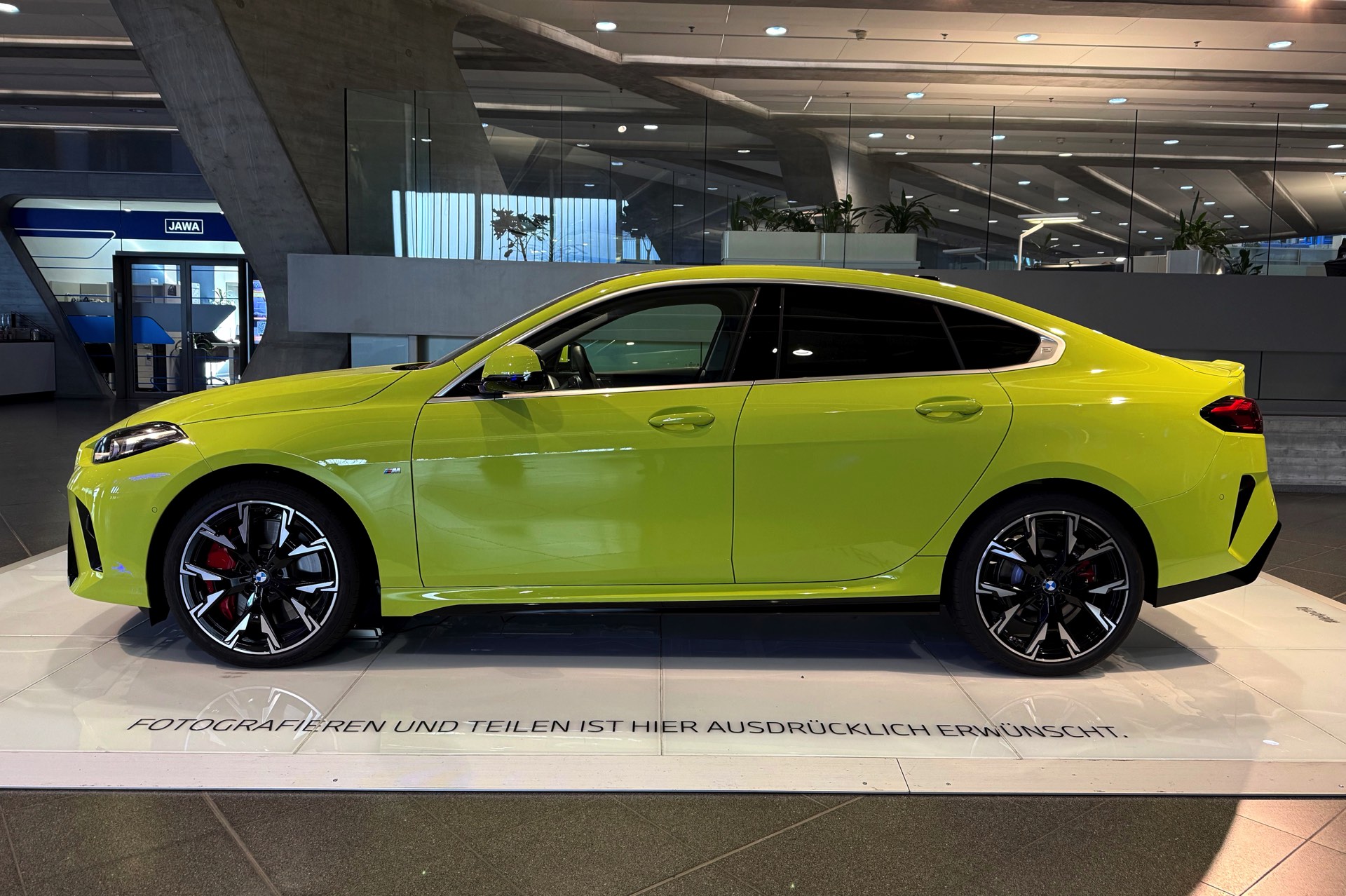 Das viertürige Kompaktklasse-Coupé trägt neben der exklusiven Lackierung auch das M Sport-Paket und die 19 Zoll großen Leichtmetallräder Y-Speiche 976 M Bicolor. Bemerkenswert sind manche Details des gezeigten BMW 2er Gran Coupé: Die Einfassungen der Seitenscheiben samt der geprägten 2 im Bereich des Hofmeister-Knicks glänzen offenbar silbern, obwohl die M Hochglanz Shadow Line mit ihren schwarzen Einfassungen heute zum Serienumfang zählt. Auch die roten Bremssättel der M Sportbremse sind so eigentlich nicht erhältlich, denn sie sind immer Bestandteil des M Sport Pro-Pakets und würden dann mit mehr schwarzen Akzenten kombiniert werden.