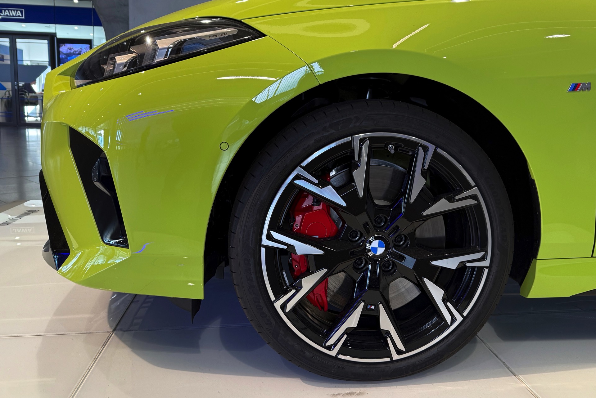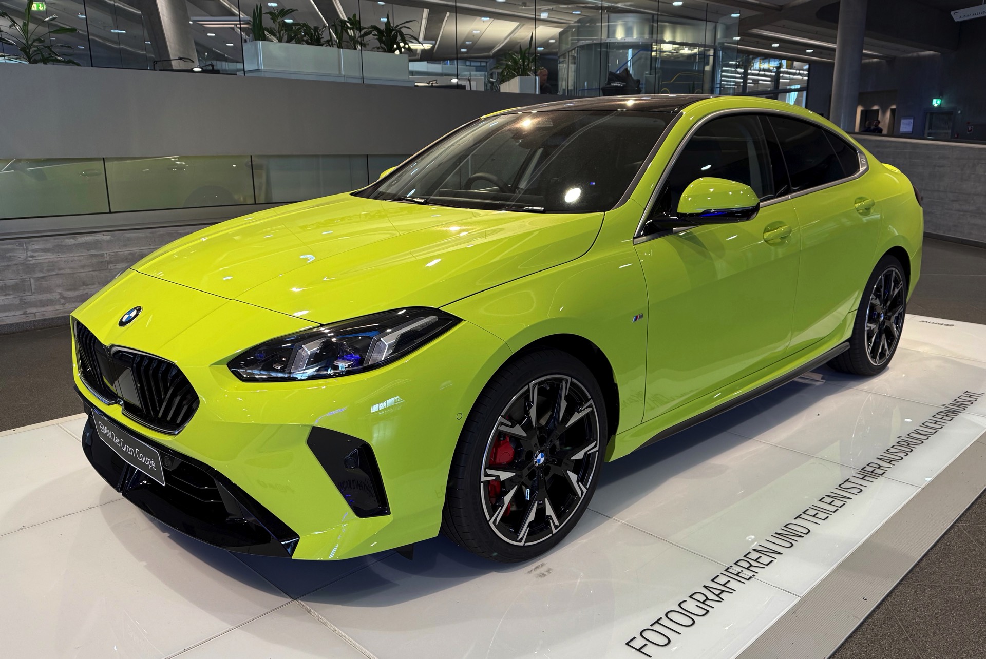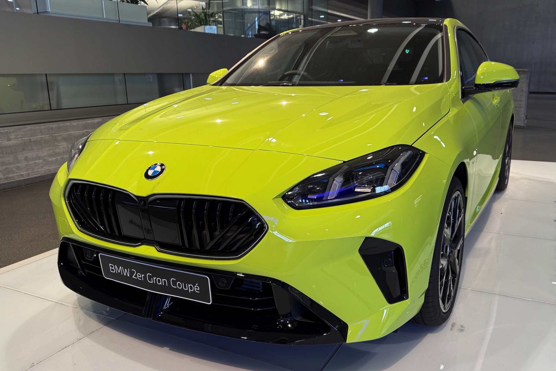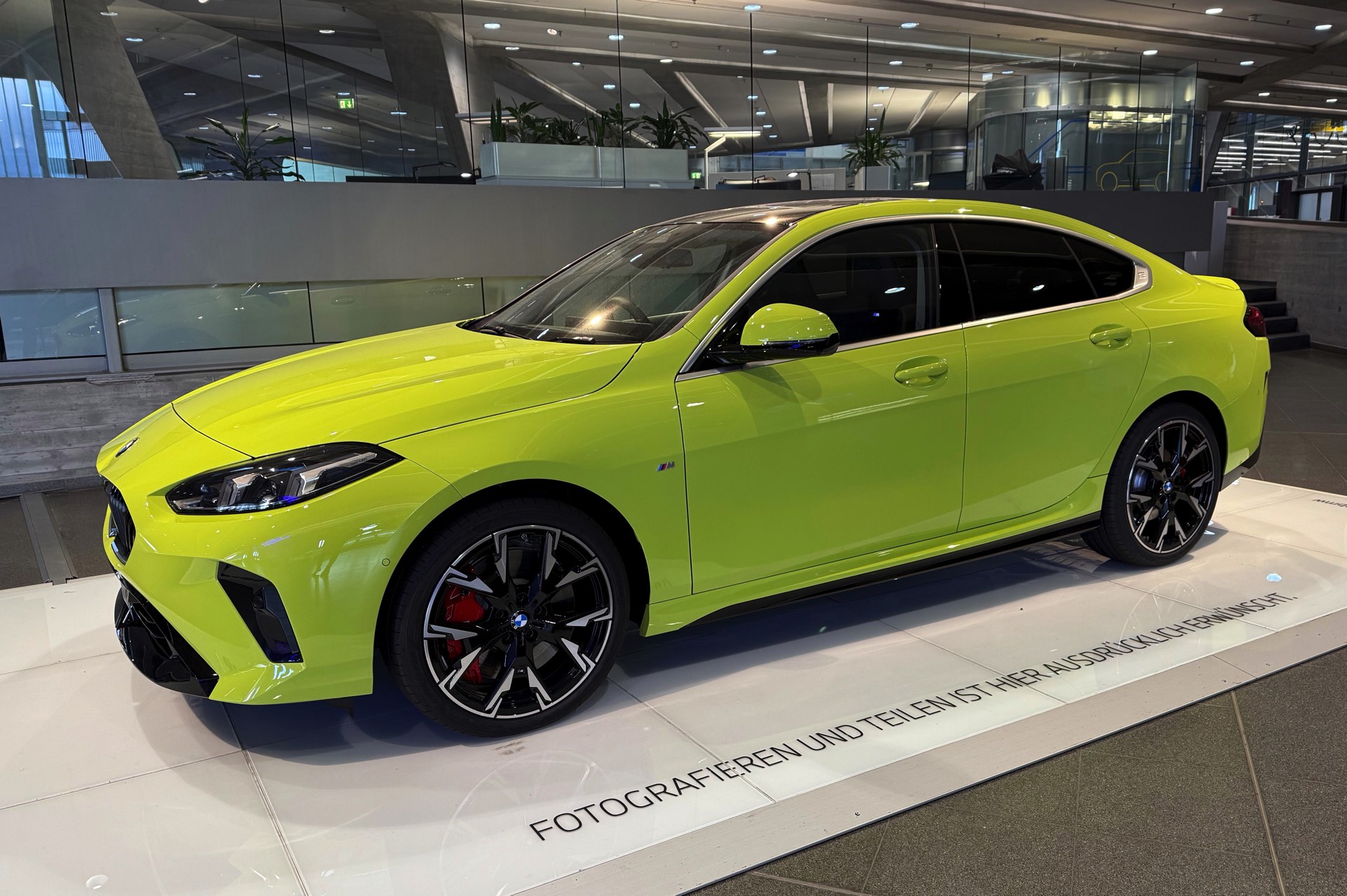 Das viertürige Kompaktklasse-Coupé trägt neben der exklusiven Lackierung auch das M Sport-Paket und die 19 Zoll großen Leichtmetallräder Y-Speiche 976 M Bicolor. Bemerkenswert sind manche Details des gezeigten BMW 2er Gran Coupé: Die Einfassungen der Seitenscheiben samt der geprägten 2 im Bereich des Hofmeister-Knicks glänzen offenbar silbern, obwohl die M Hochglanz Shadow Line mit ihren schwarzen Einfassungen heute zum Serienumfang zählt. Auch die roten Bremssättel der M Sportbremse sind so eigentlich nicht erhältlich, denn sie sind immer Bestandteil des M Sport Pro-Pakets und würden dann mit mehr schwarzen Akzenten kombiniert werden.