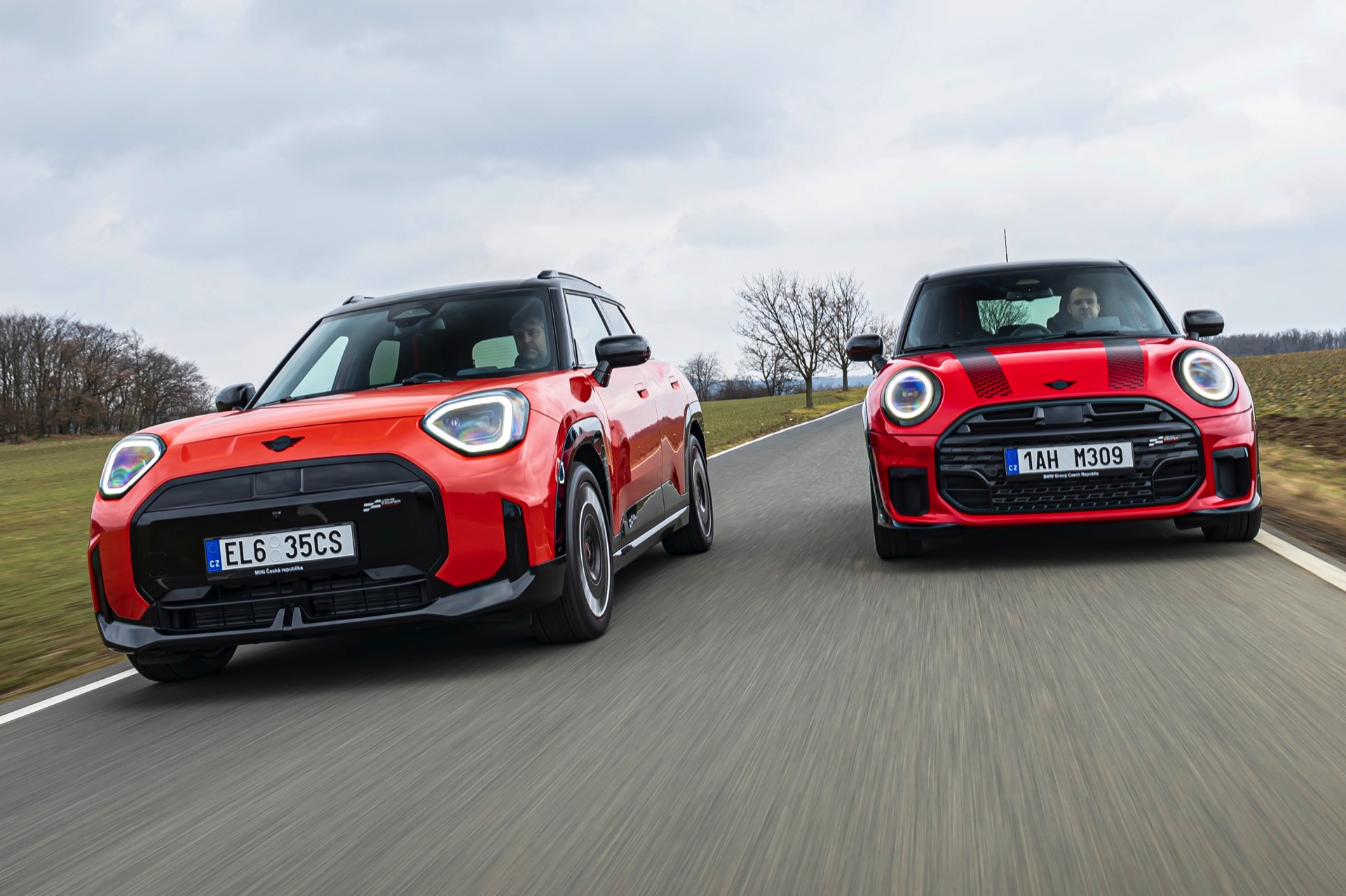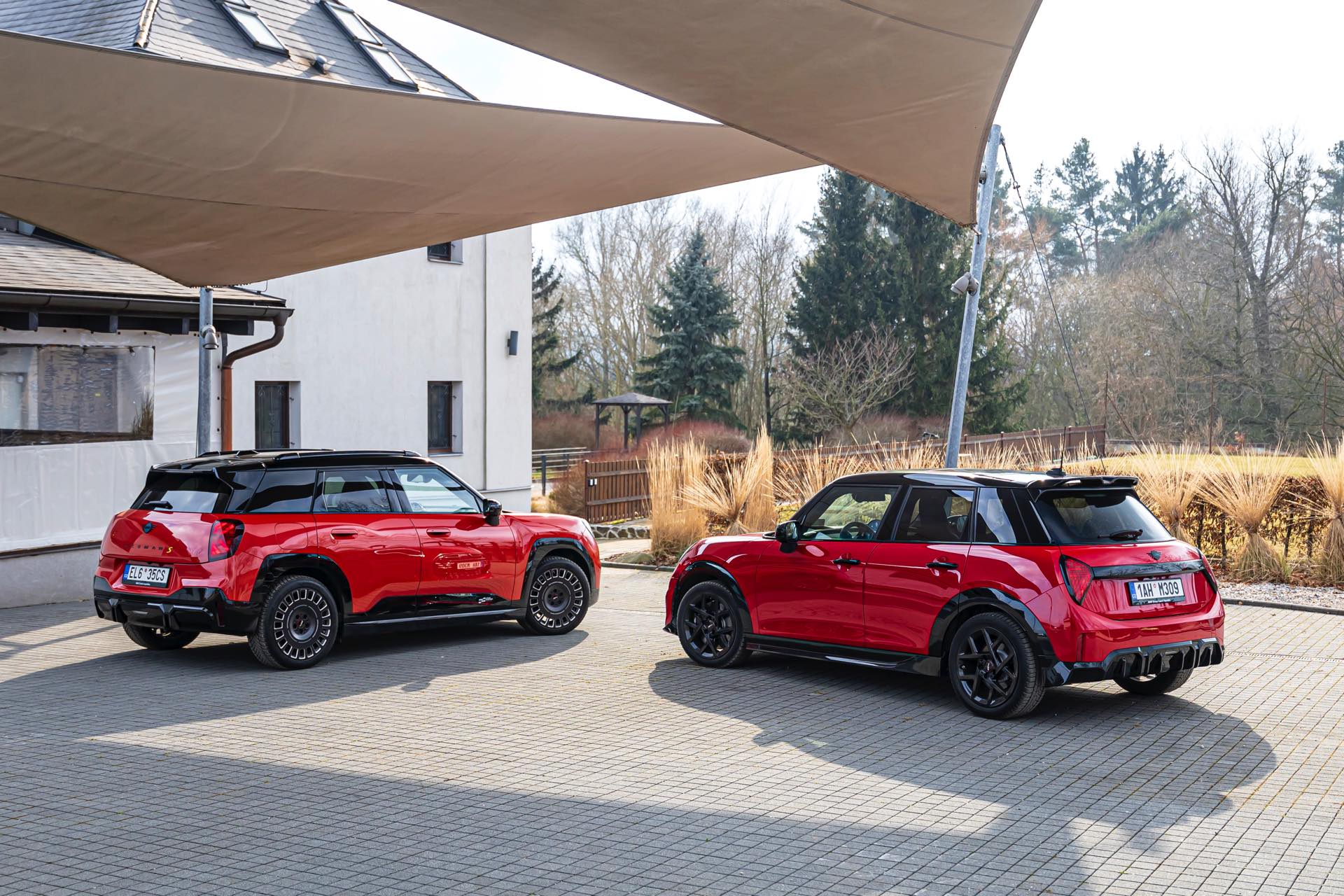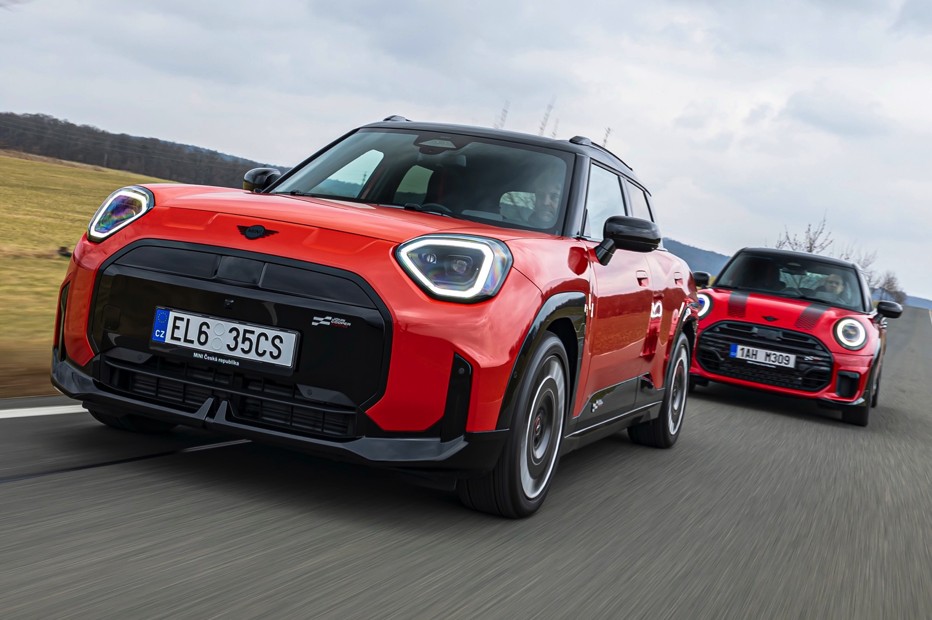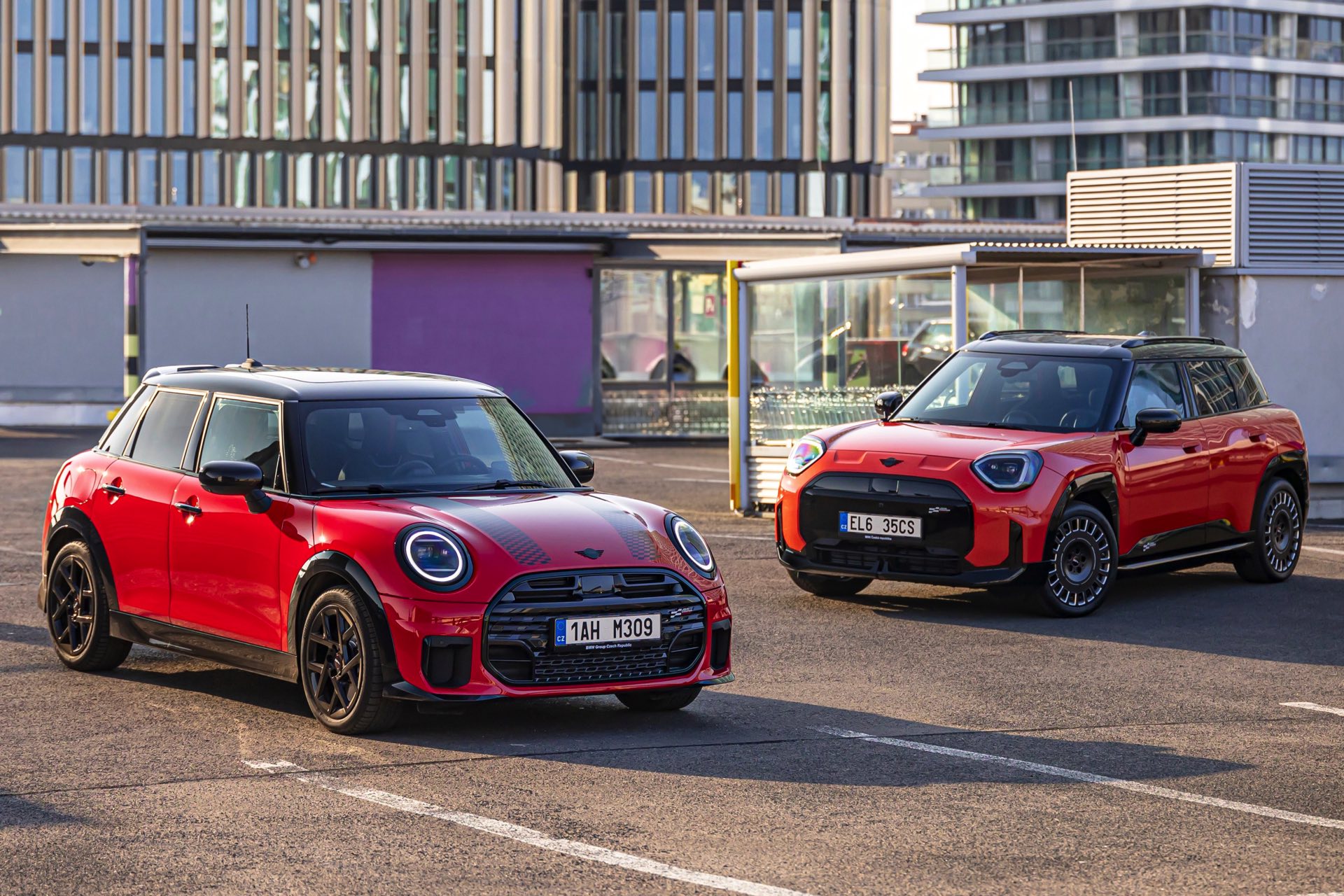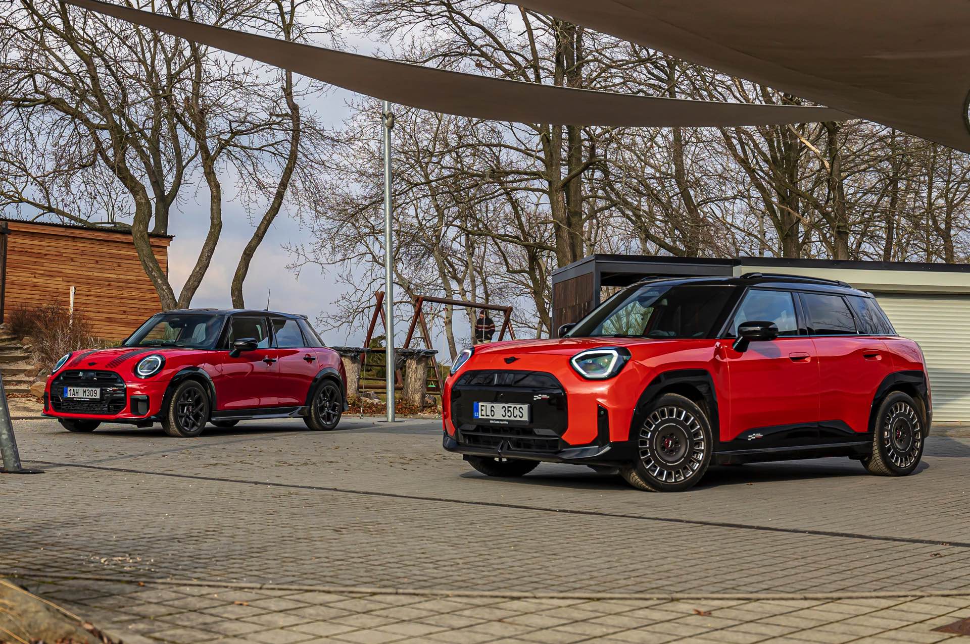 Dass es neben vielen Gemeinsamkeiten auch beim Design einige Unterschiede gibt, zeigt ein aktuelles Foto-Set aus der Tschechischen Republik. Auf den Fotos sehen wir sowohl den MINI Aceman als auch den MINI 5-Türer mit John Cooper Works-Paket und roter Lackierung, sodass sich beide Modelle gut miteinander vergleichen lassen. Der 4,3 Zentimeter kürzere und zudem 5 Zentimeter flachere Fünftürer (Kennzeichen 1AH M309) ist anhand seiner kreisrunden Front-Scheinwerfer und der annähernd dreieckigen Rückleuchten auch für Laien gut vom etwas größeren und mit insgesamt kantigeren Formen kommenden Aceman (Kennzeichen EL6 35CS) zu unterscheiden.