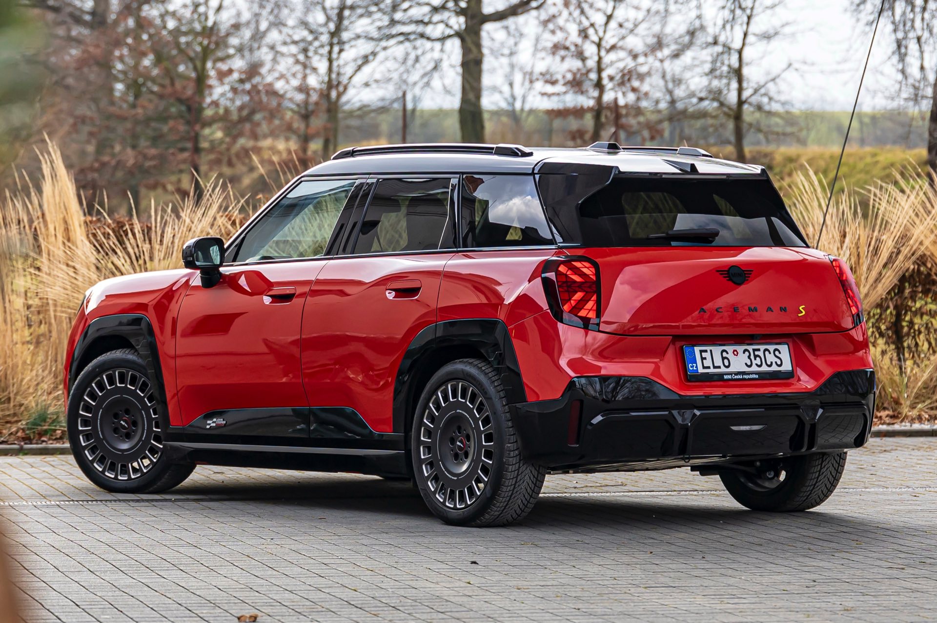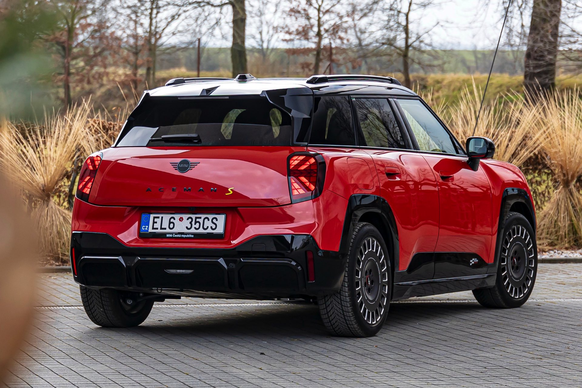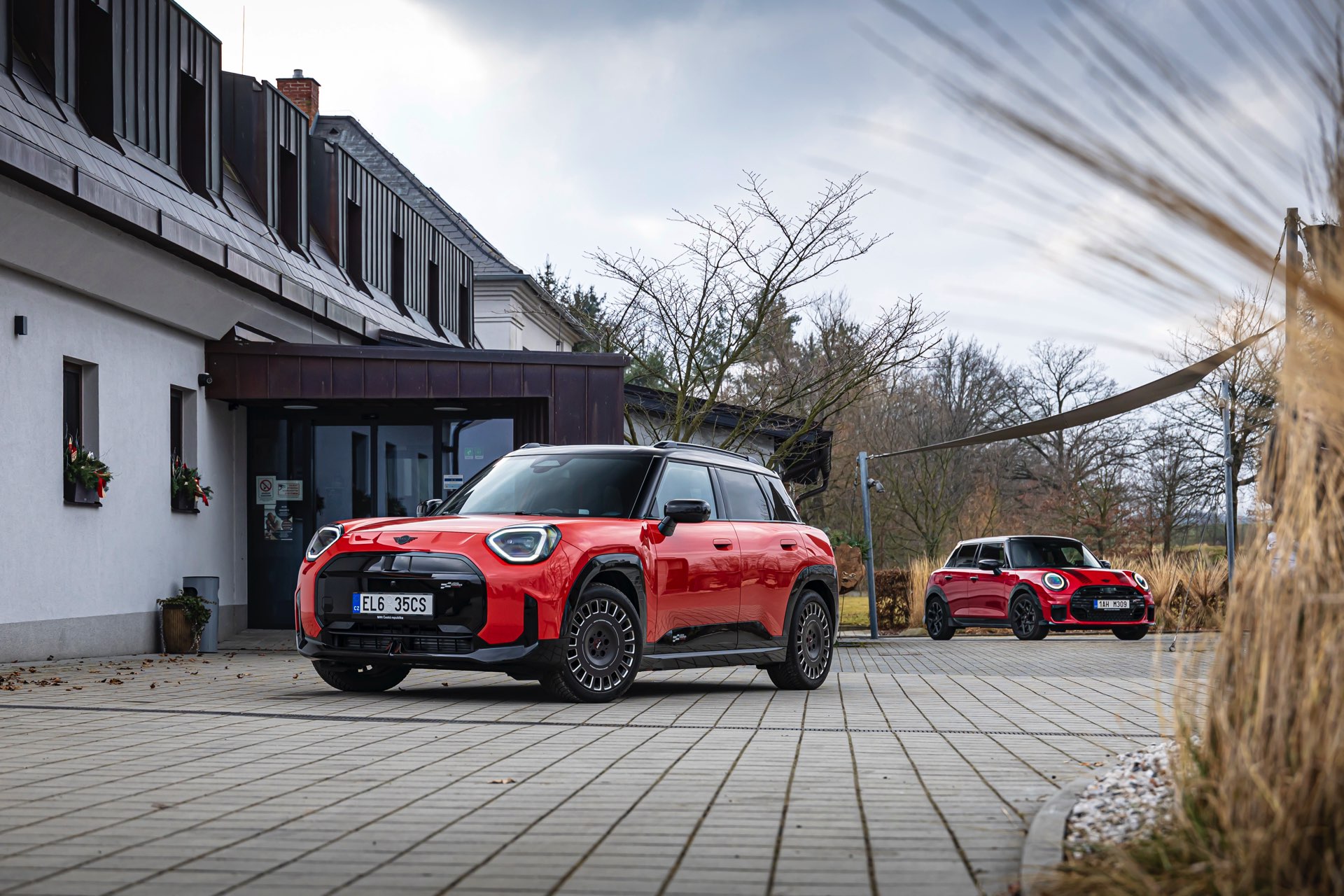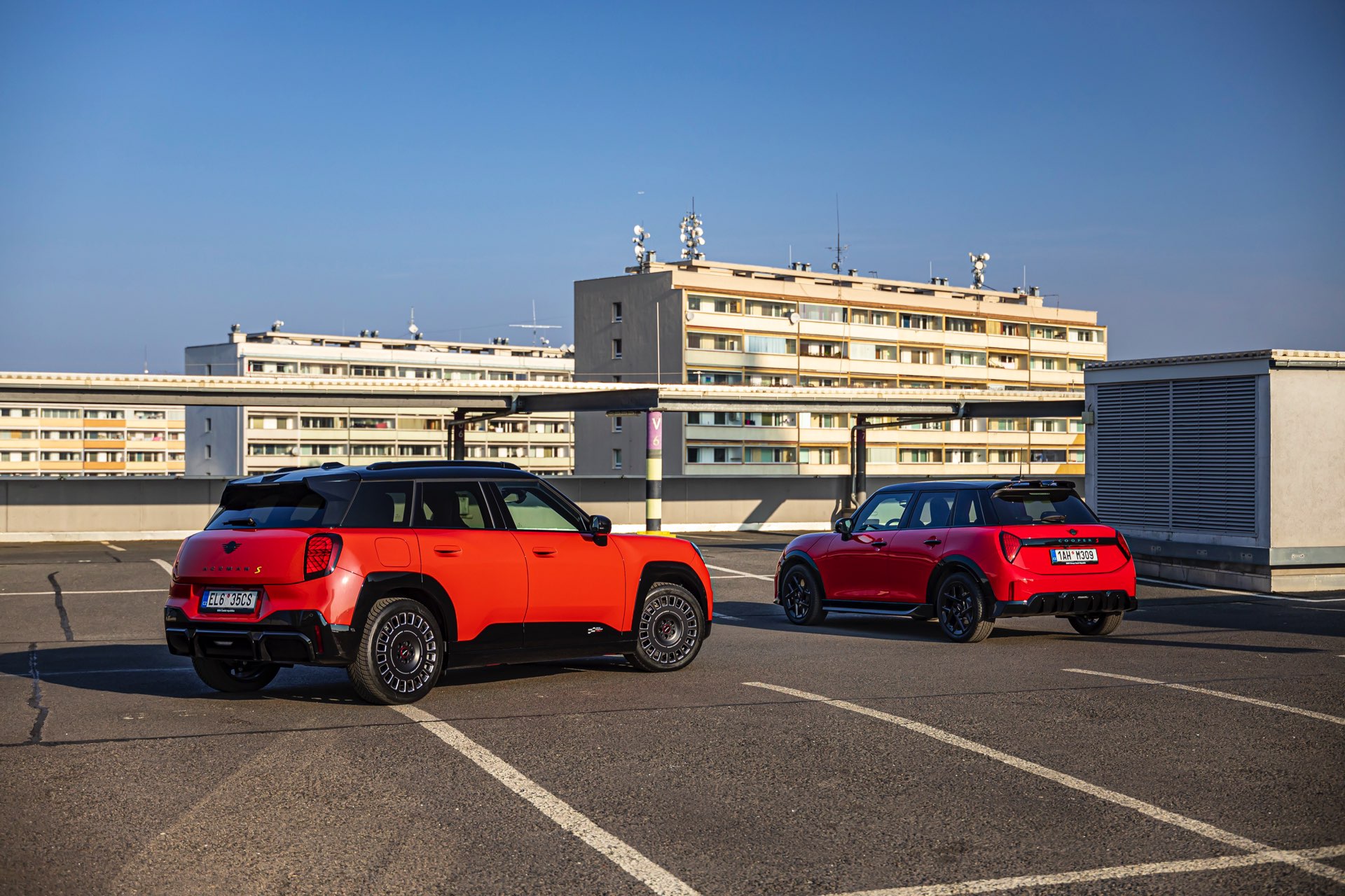 Dass es neben vielen Gemeinsamkeiten auch beim Design einige Unterschiede gibt, zeigt ein aktuelles Foto-Set aus der Tschechischen Republik. Auf den Fotos sehen wir sowohl den MINI Aceman als auch den MINI 5-Türer mit John Cooper Works-Paket und roter Lackierung, sodass sich beide Modelle gut miteinander vergleichen lassen. Der 4,3 Zentimeter kürzere und zudem 5 Zentimeter flachere Fünftürer (Kennzeichen 1AH M309) ist anhand seiner kreisrunden Front-Scheinwerfer und der annähernd dreieckigen Rückleuchten auch für Laien gut vom etwas größeren und mit insgesamt kantigeren Formen kommenden Aceman (Kennzeichen EL6 35CS) zu unterscheiden.