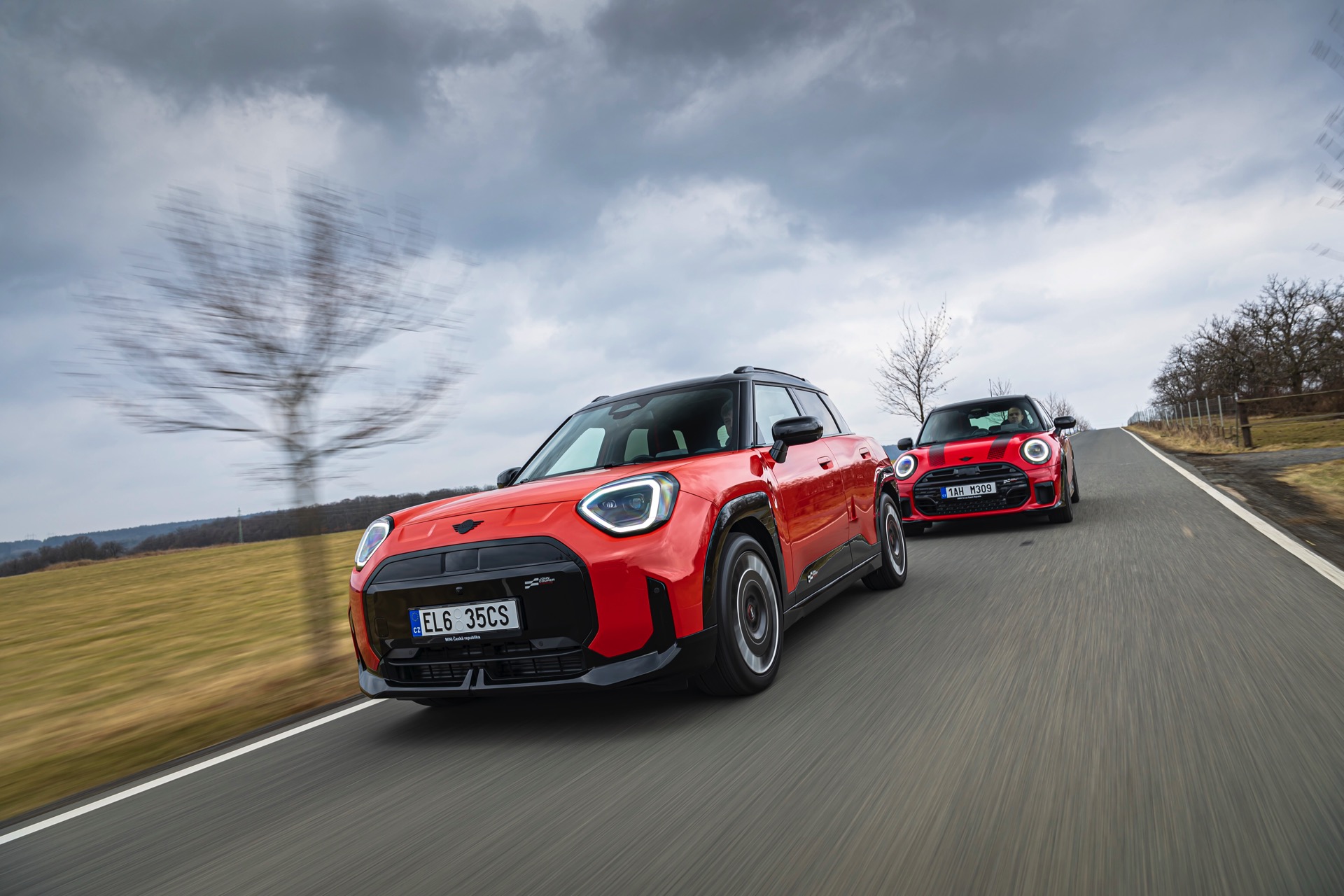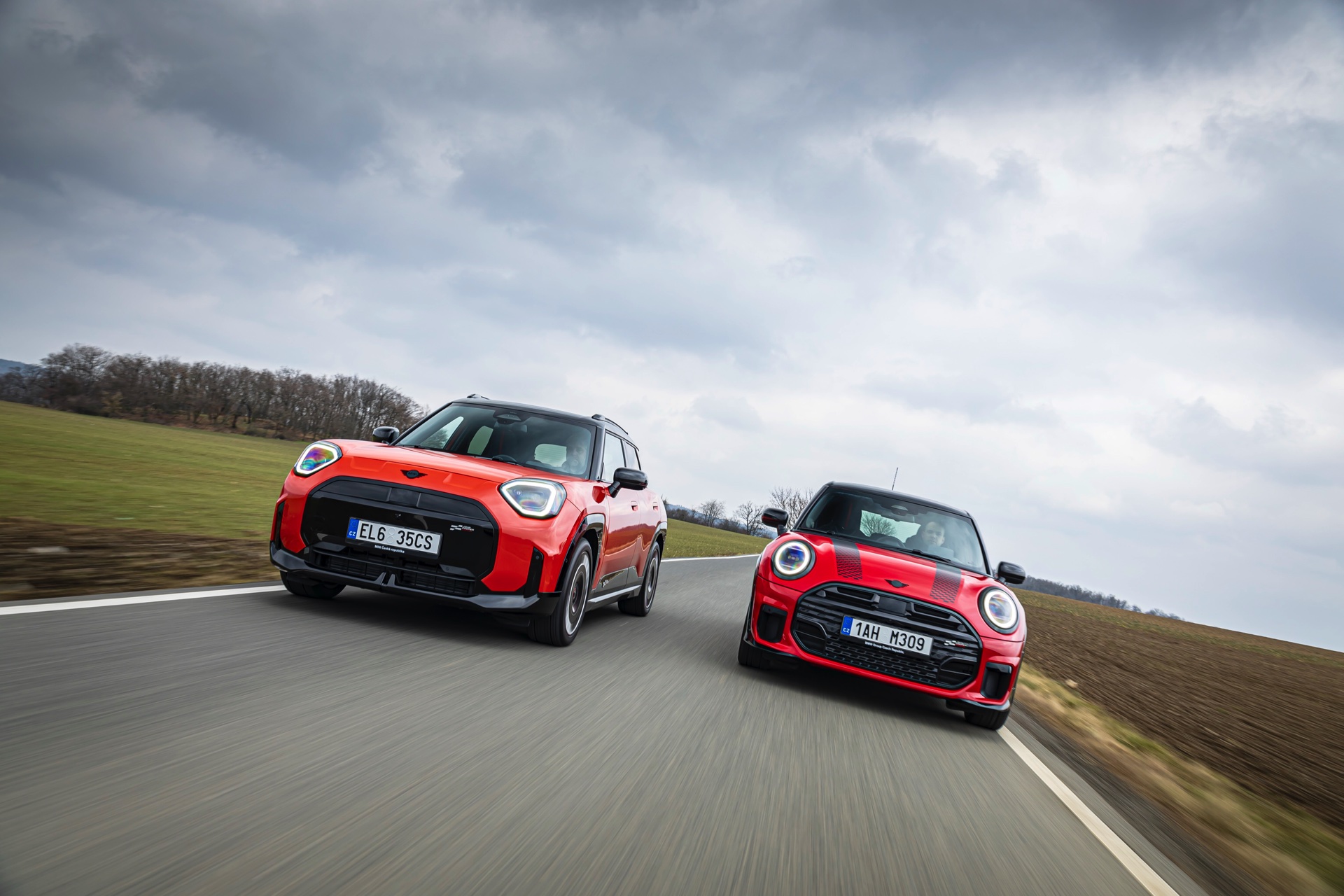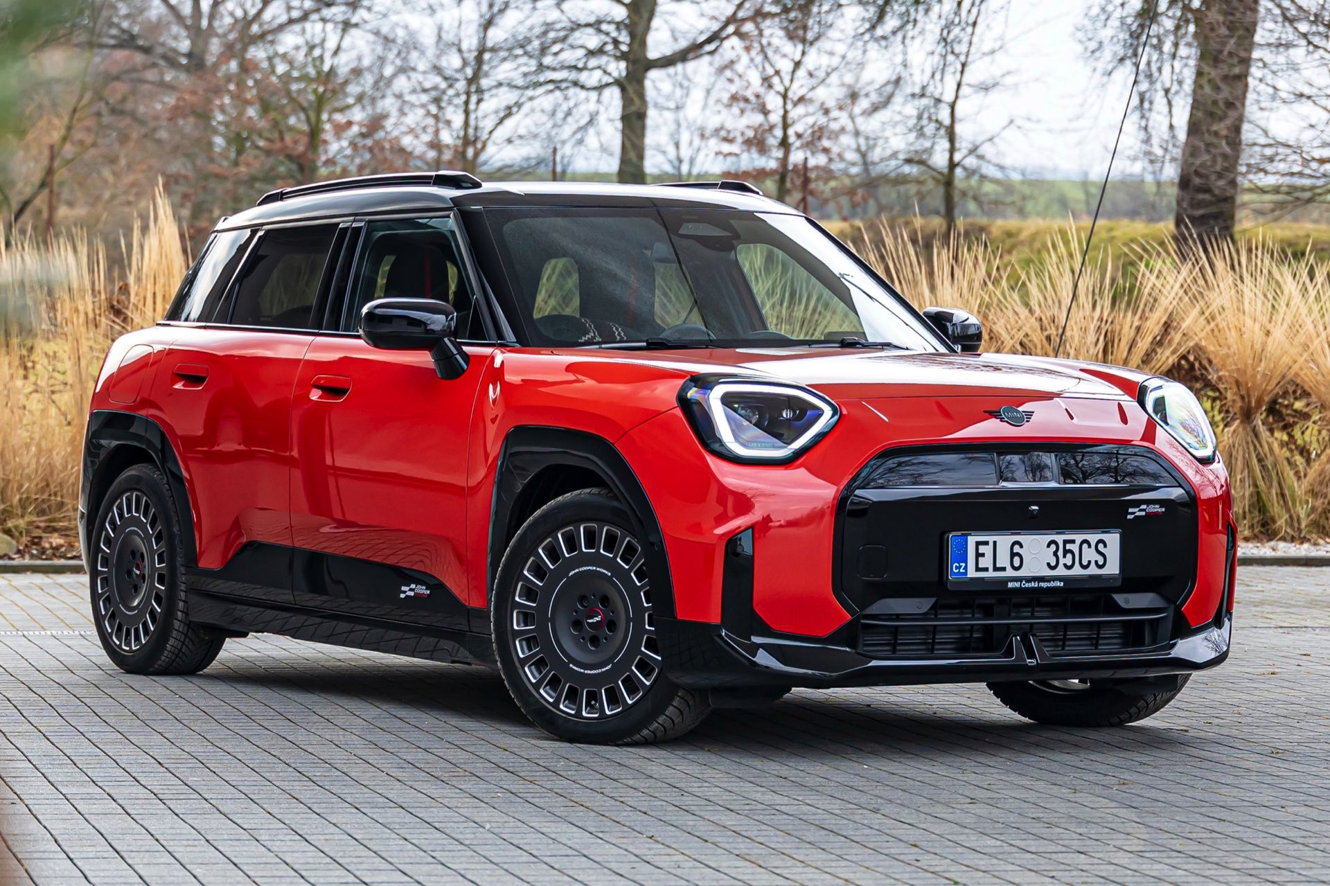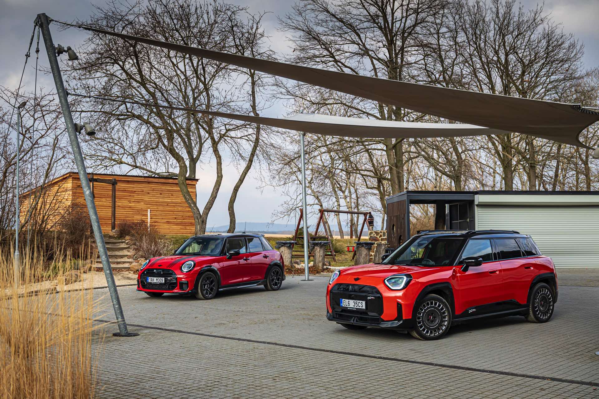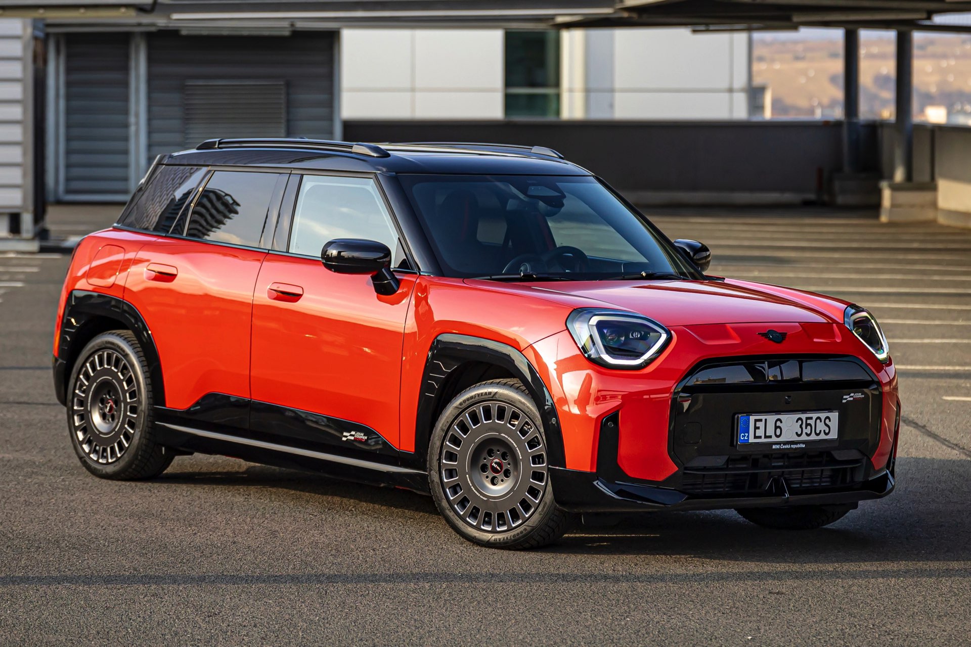 Dass es neben vielen Gemeinsamkeiten auch beim Design einige Unterschiede gibt, zeigt ein aktuelles Foto-Set aus der Tschechischen Republik. Auf den Fotos sehen wir sowohl den MINI Aceman als auch den MINI 5-Türer mit John Cooper Works-Paket und roter Lackierung, sodass sich beide Modelle gut miteinander vergleichen lassen. Der 4,3 Zentimeter kürzere und zudem 5 Zentimeter flachere Fünftürer (Kennzeichen 1AH M309) ist anhand seiner kreisrunden Front-Scheinwerfer und der annähernd dreieckigen Rückleuchten auch für Laien gut vom etwas größeren und mit insgesamt kantigeren Formen kommenden Aceman (Kennzeichen EL6 35CS) zu unterscheiden.
