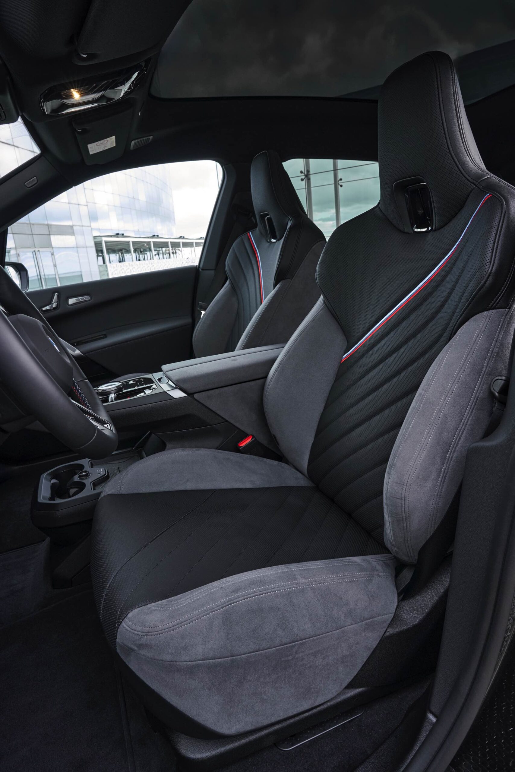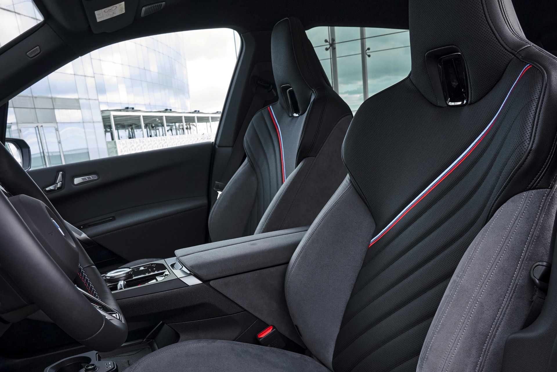 Überarbeitet wurde mit dem Facelift auch der Innenraum, der unter anderem ein neues M-Lenkrad und neue Sitze mit längerer Sitzfläche erhalten hat. Auf den Fotos sehen wir das Bicolor-Interieur Design M Sport mit Bezügen in Sensatec und Microfaser, wobei Schwarz und Atlasgrau für etwas Abwechslung sorgen. Deutlich stärker ins Auge fallen allerdings die diagonal über alle vier Sitze verlaufenden Farben der M GmbH, die einen sportlichen Akzent setzen.