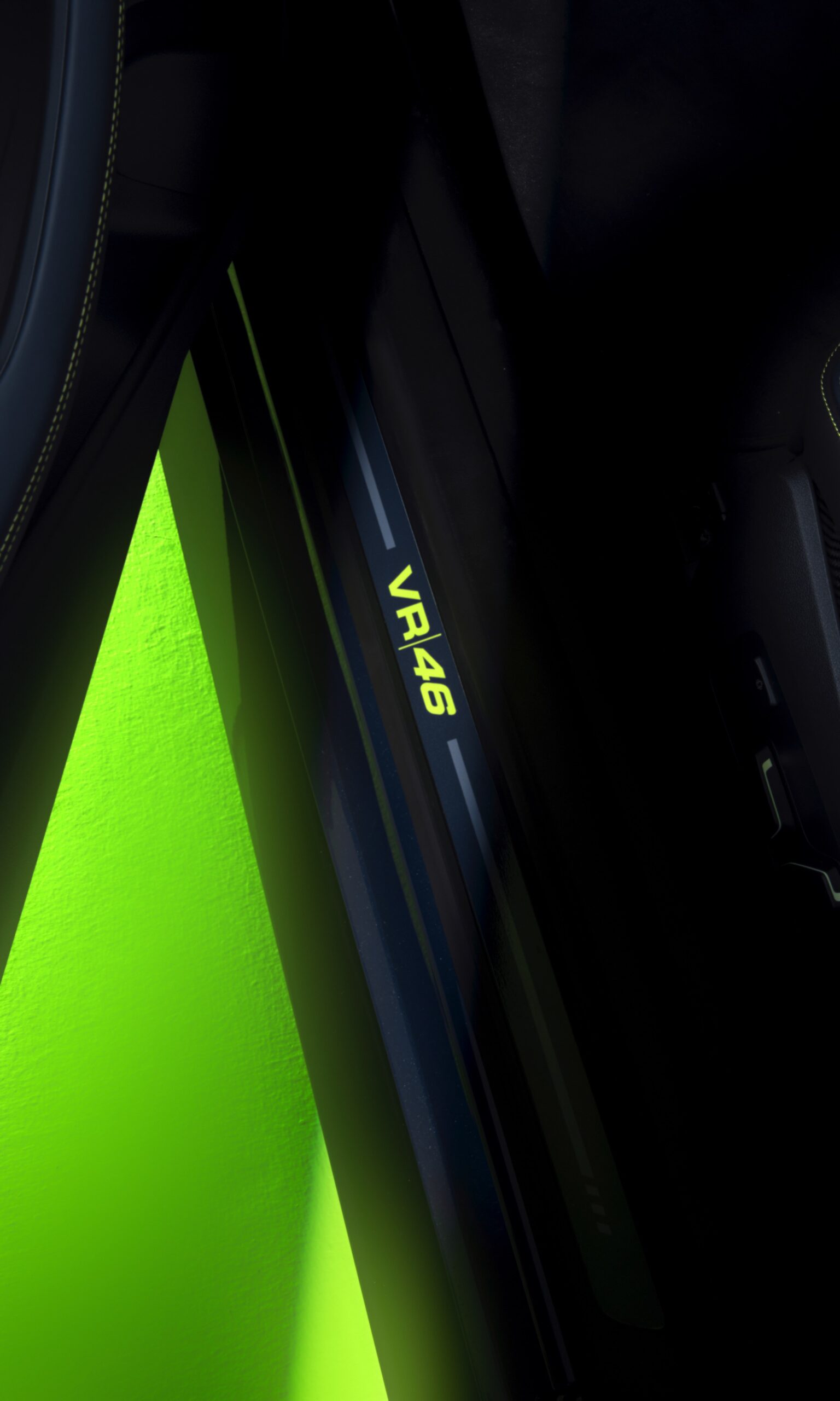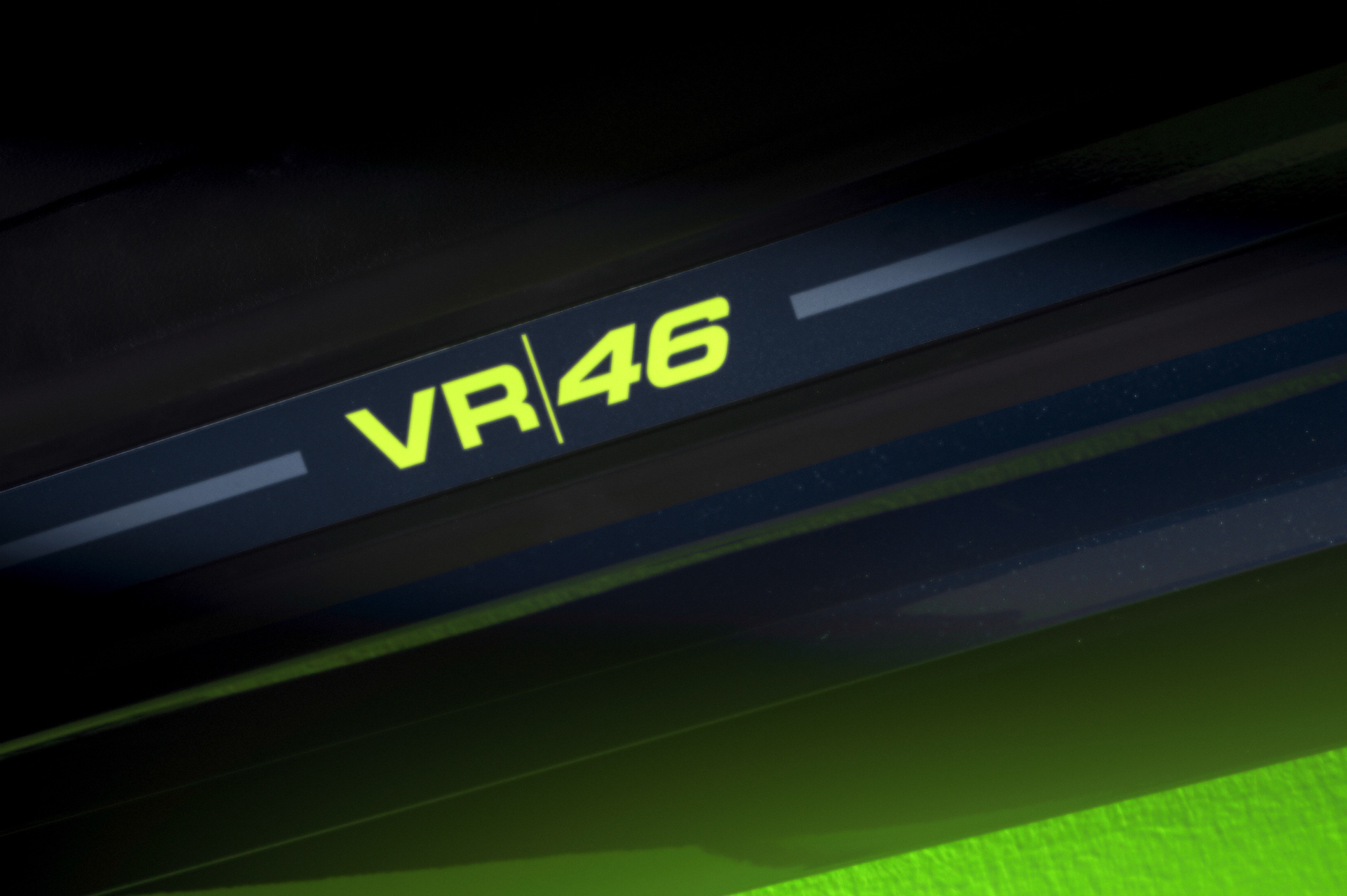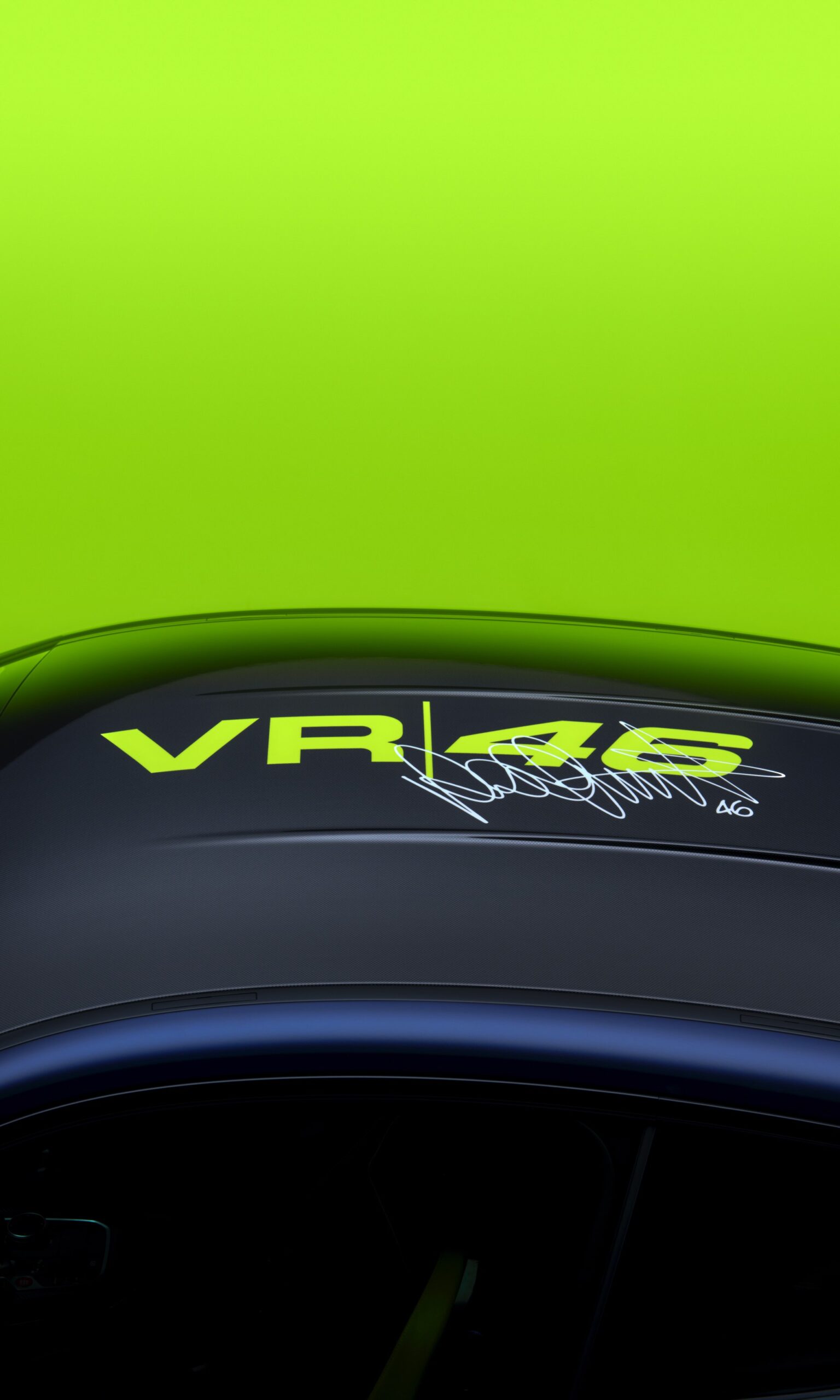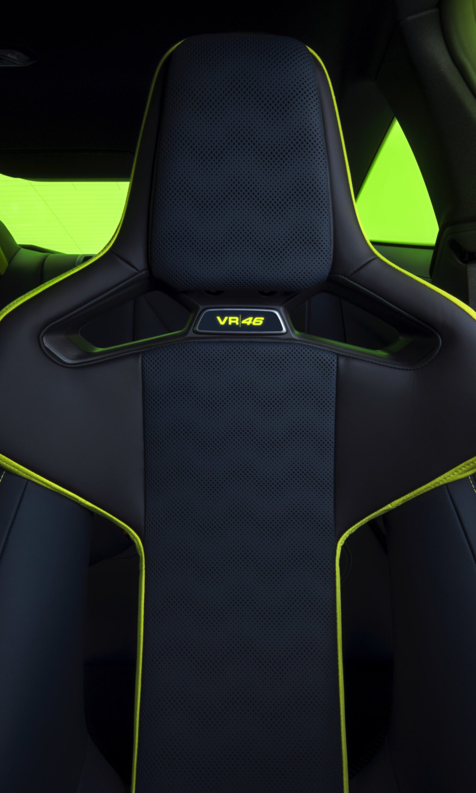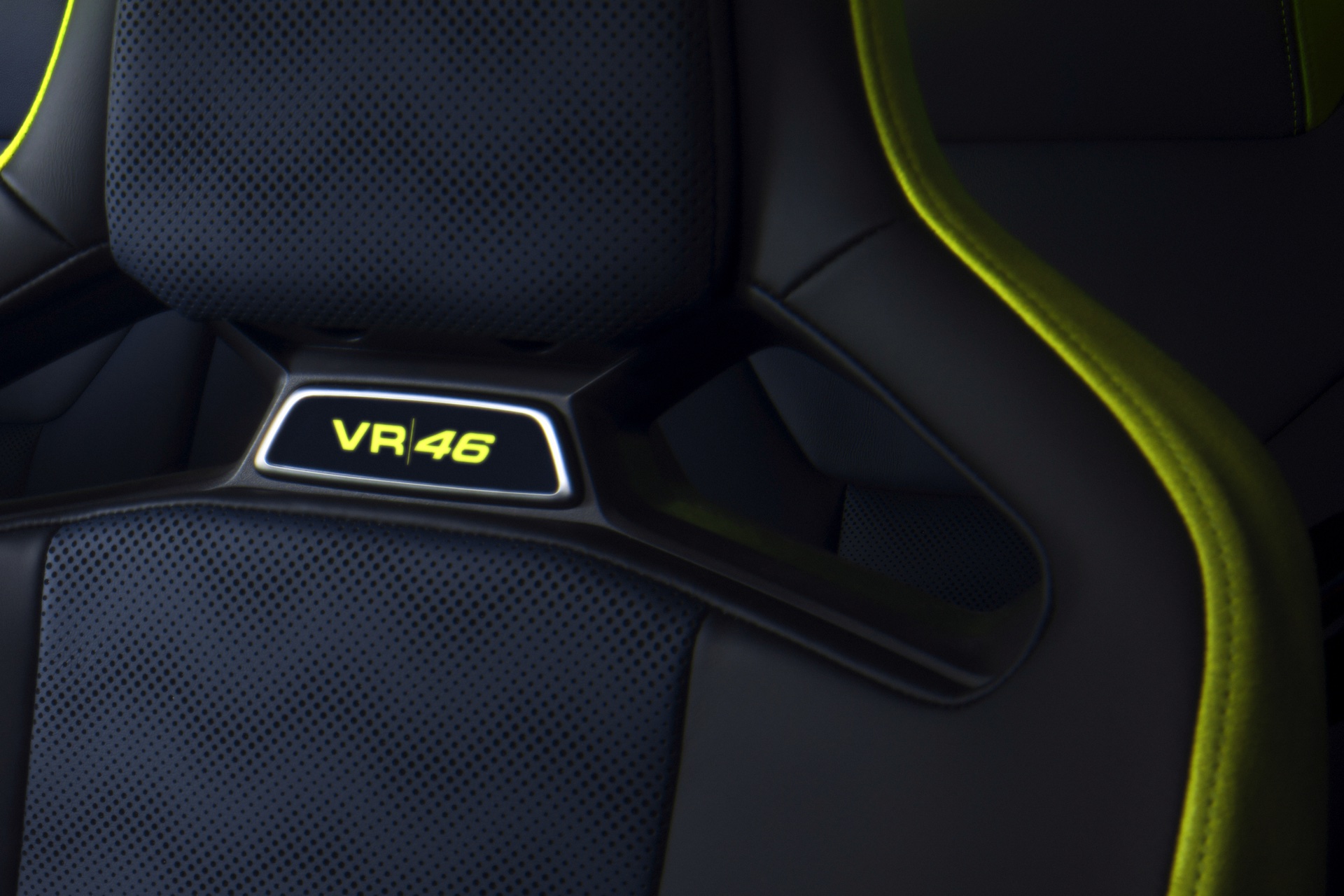 Im Innenraum darf Gelb ebenfalls nicht fehlen, dominierende Farbe ist aber das Nachtblau der Innenausstattung. Besondere Hingucker sind die gelbe 12-Uhr-Markierung, die leuchtende VR46 in den Rückenlehnen und die geprägte 01|46 auf dem Ablage-Pad der Carbon-Mittelkonsole.