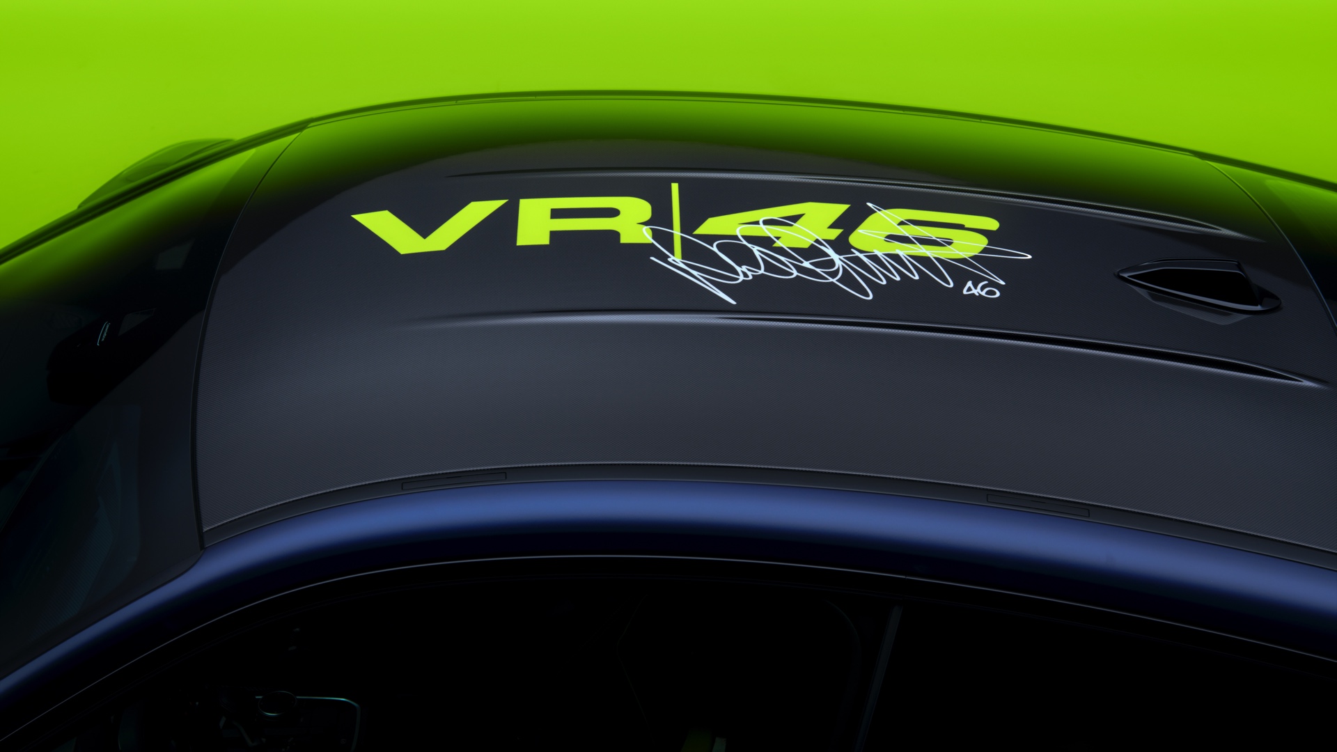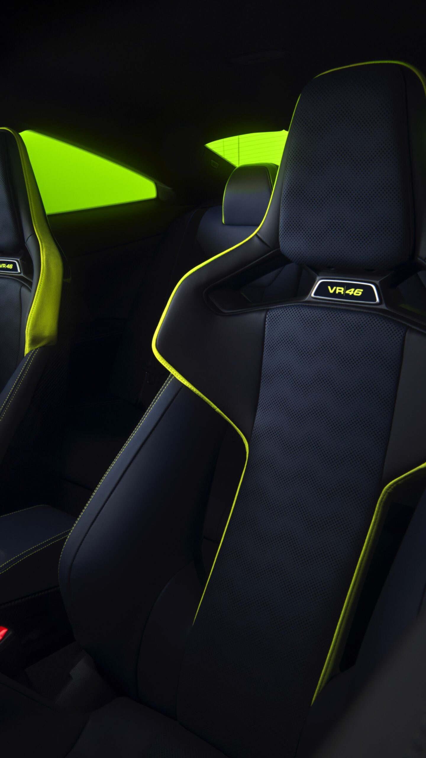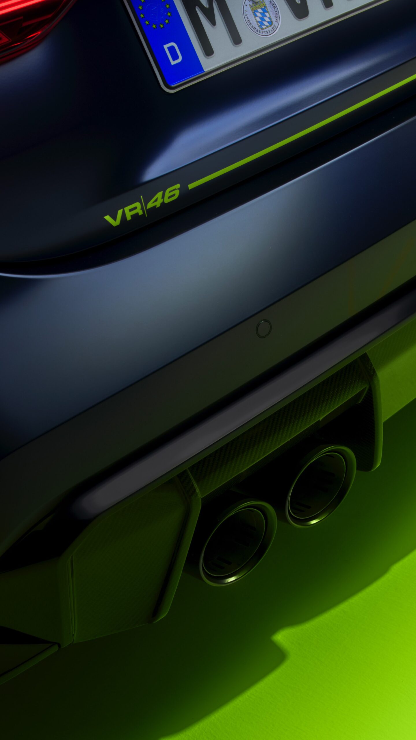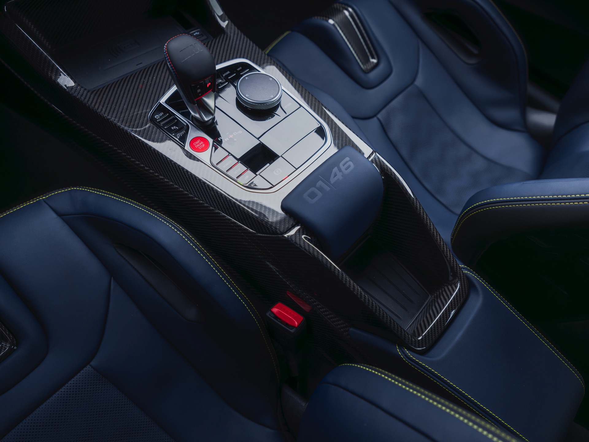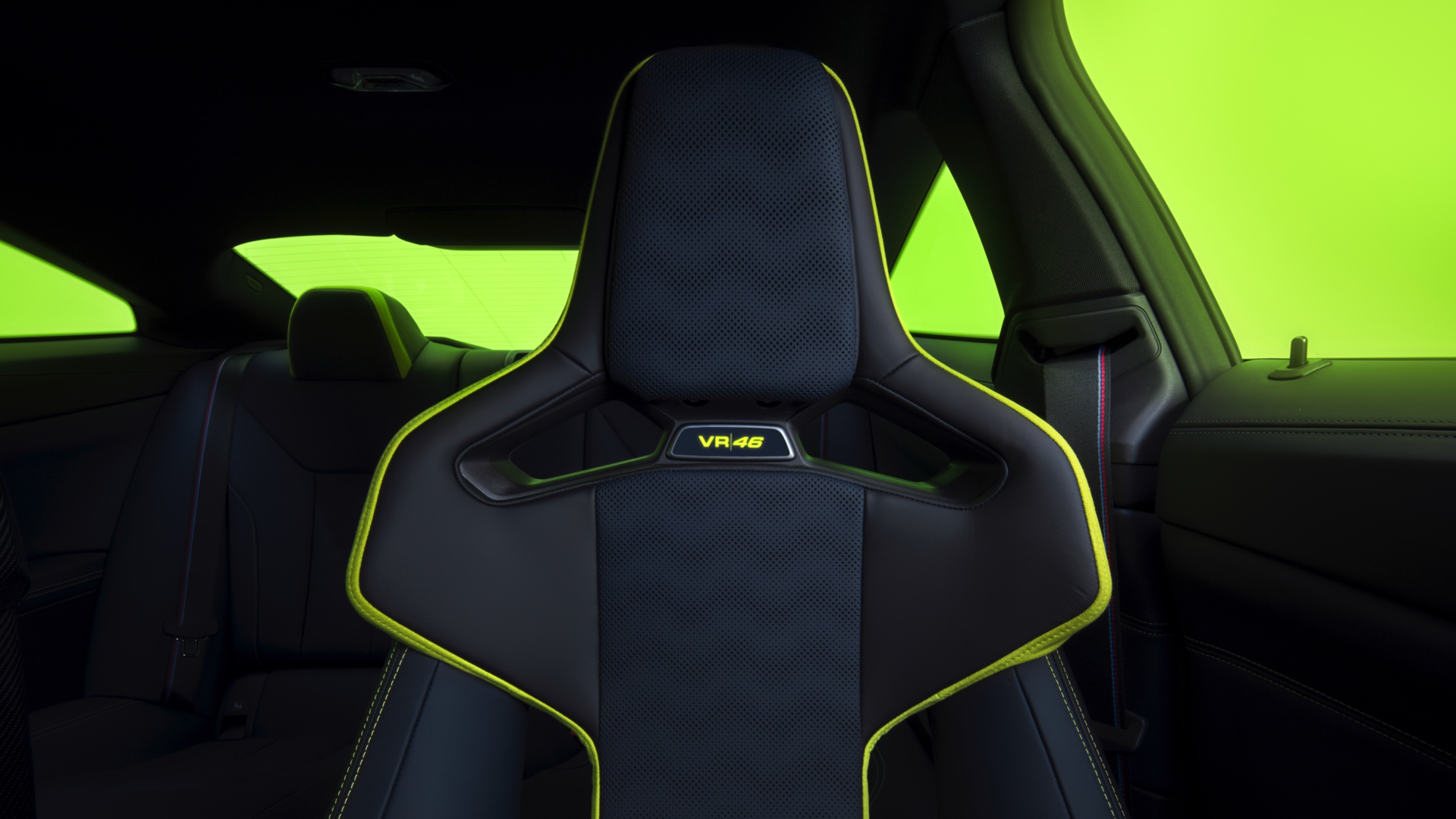 Im Innenraum darf Gelb ebenfalls nicht fehlen, dominierende Farbe ist aber das Nachtblau der Innenausstattung. Besondere Hingucker sind die gelbe 12-Uhr-Markierung, die leuchtende VR46 in den Rückenlehnen und die geprägte 01|46 auf dem Ablage-Pad der Carbon-Mittelkonsole.