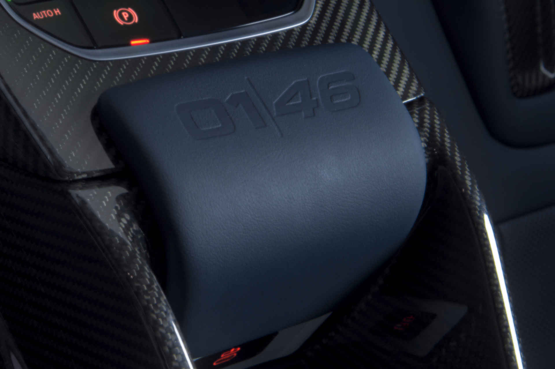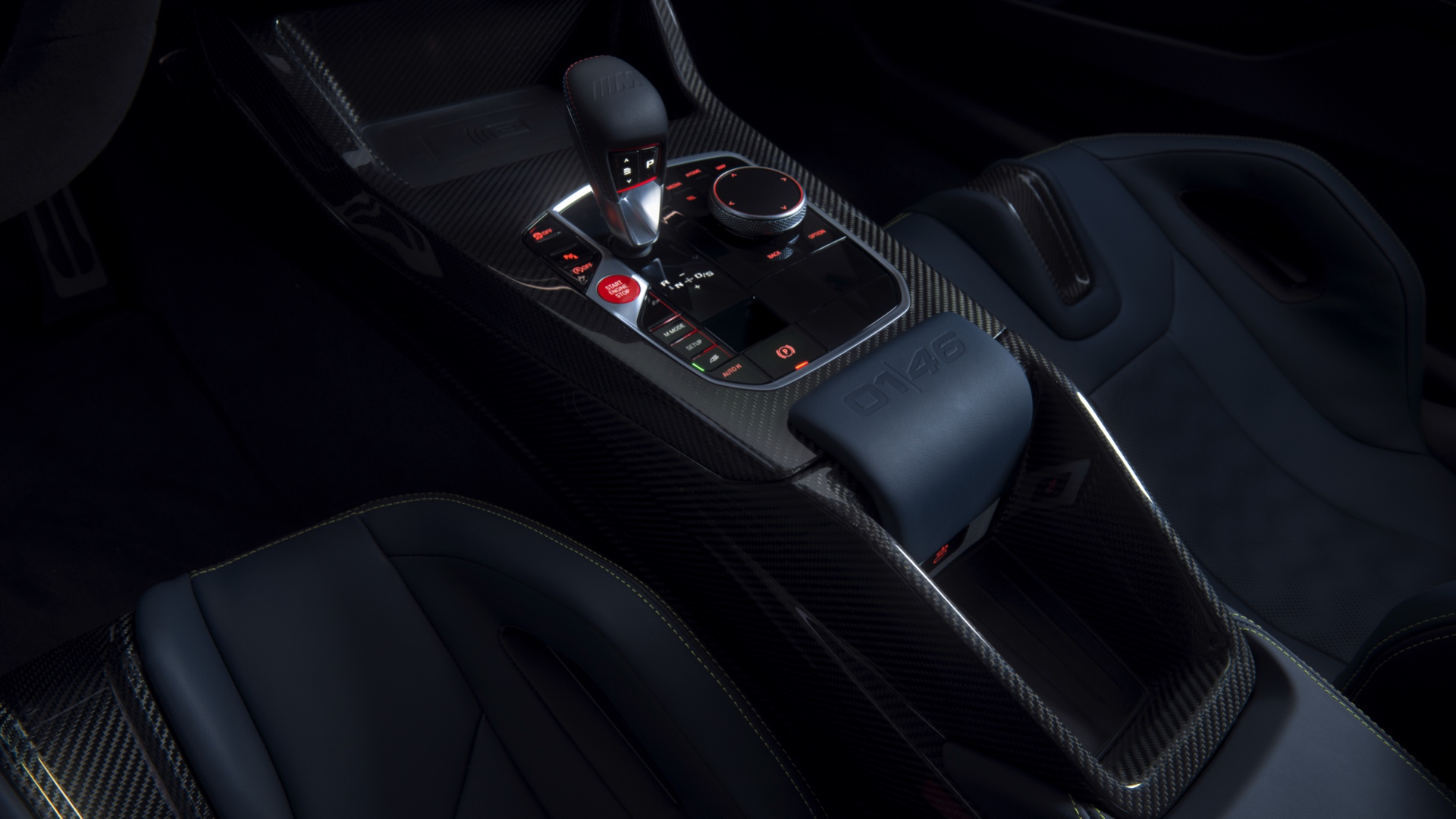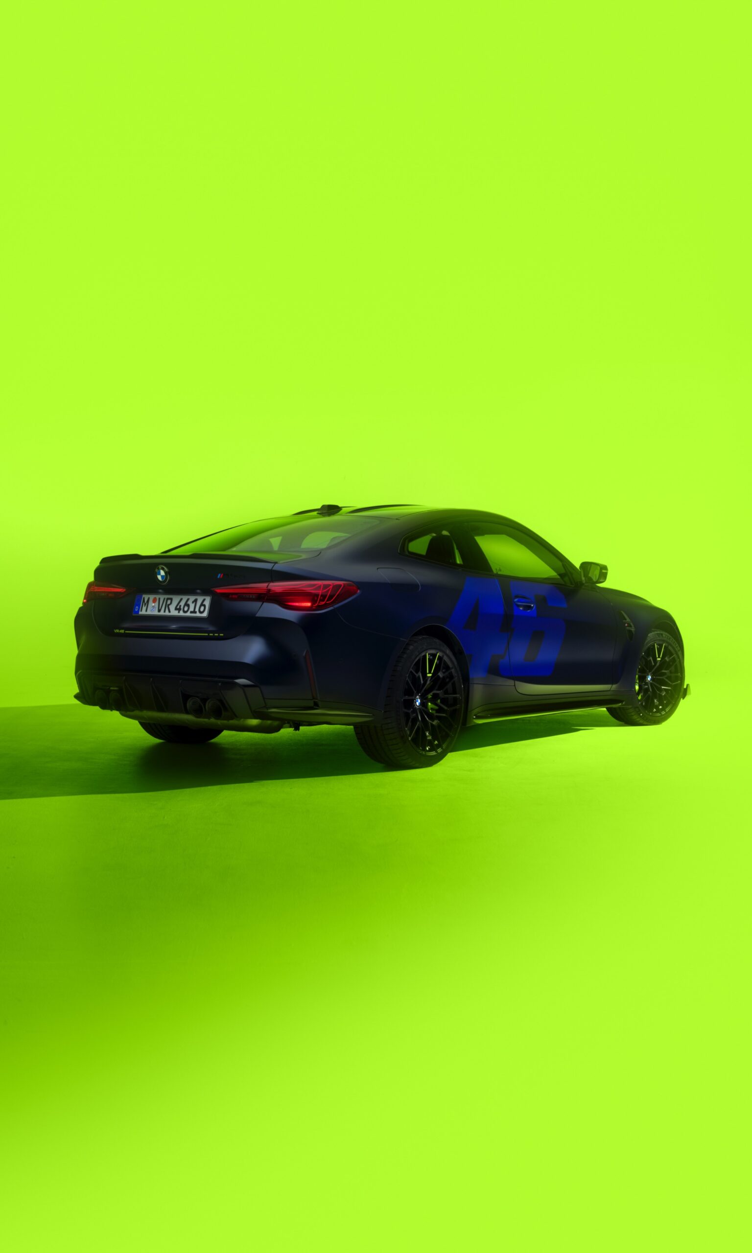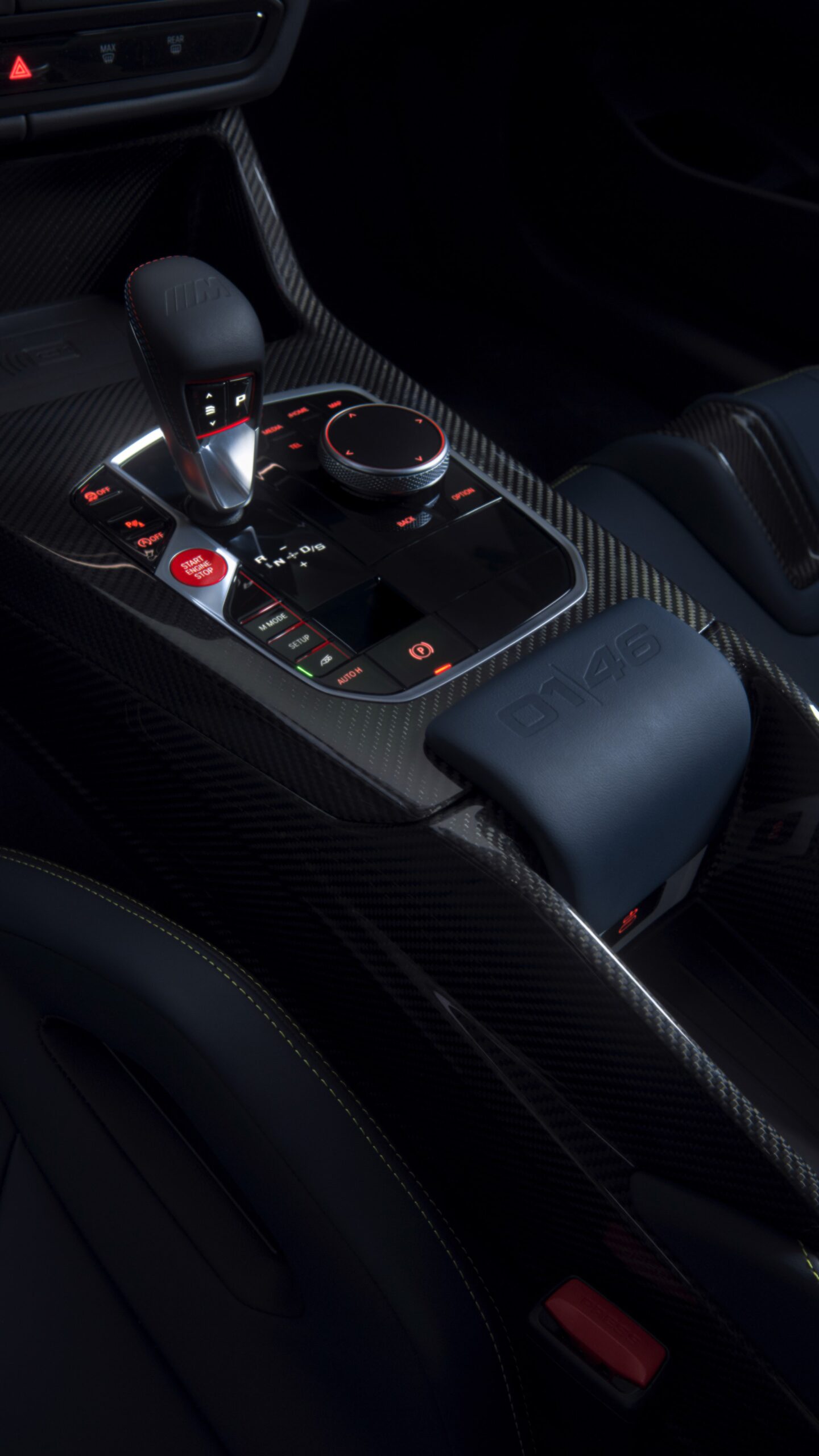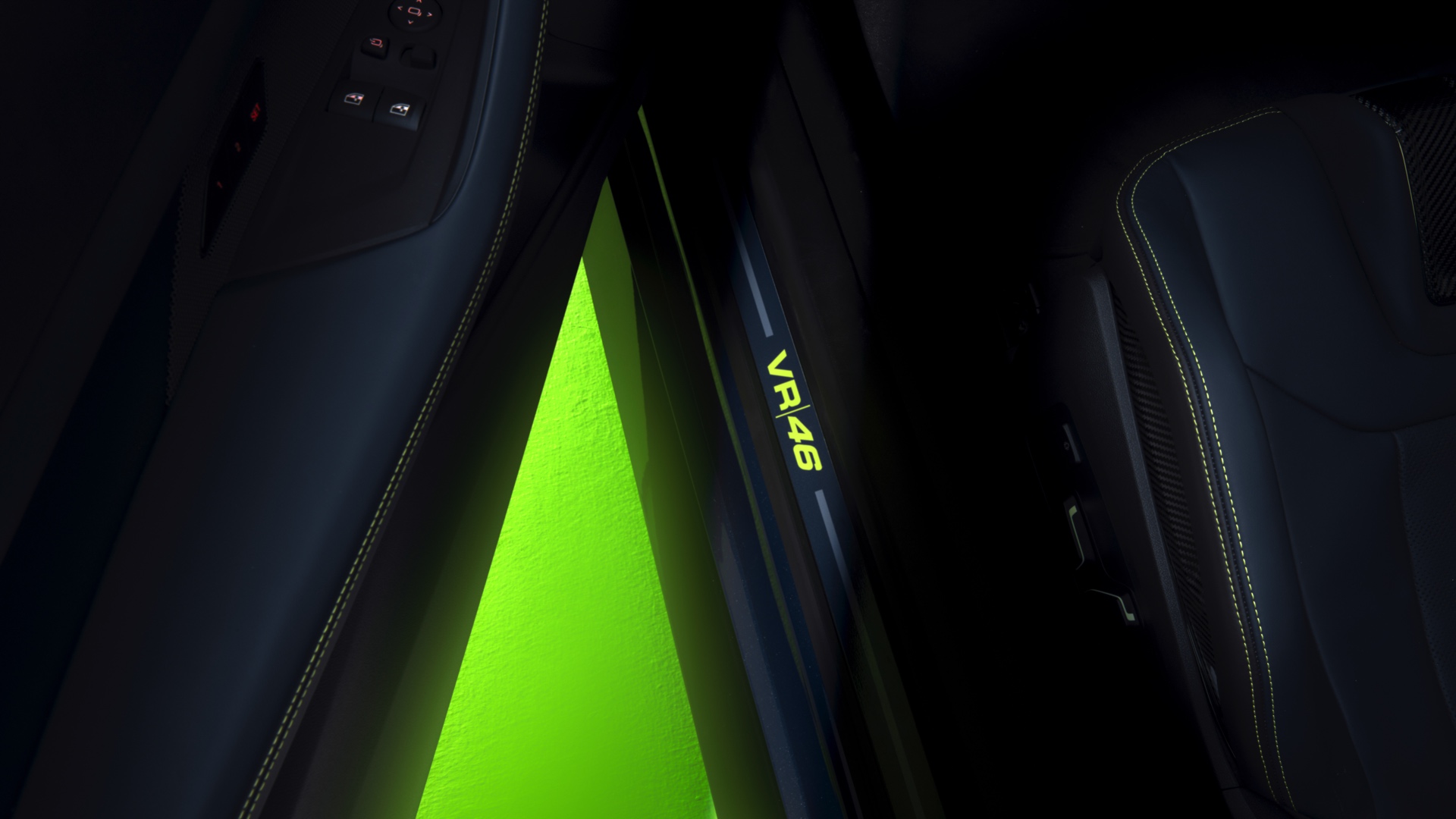 Im Innenraum darf Gelb ebenfalls nicht fehlen, dominierende Farbe ist aber das Nachtblau der Innenausstattung. Besondere Hingucker sind die gelbe 12-Uhr-Markierung, die leuchtende VR46 in den Rückenlehnen und die geprägte 01|46 auf dem Ablage-Pad der Carbon-Mittelkonsole.