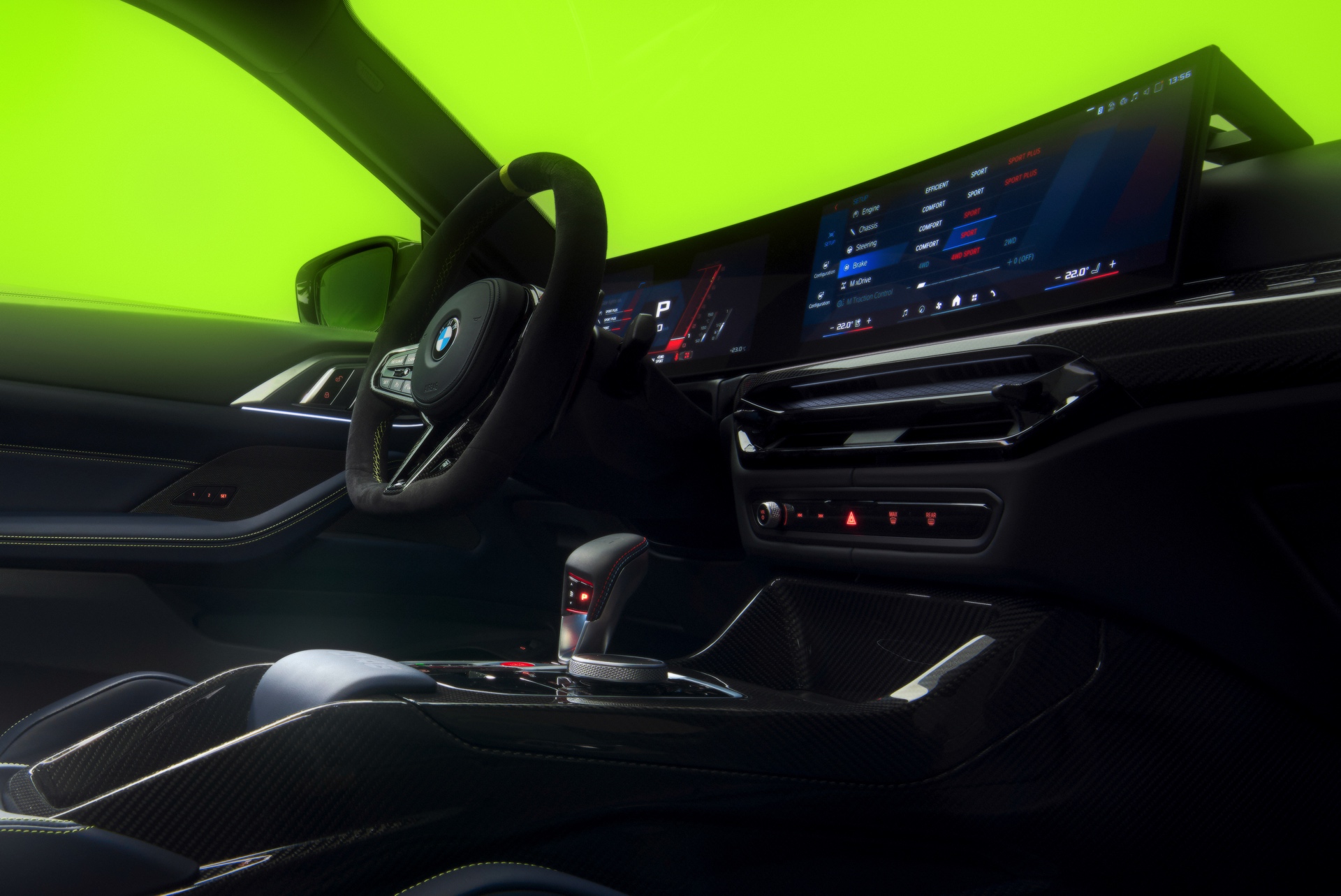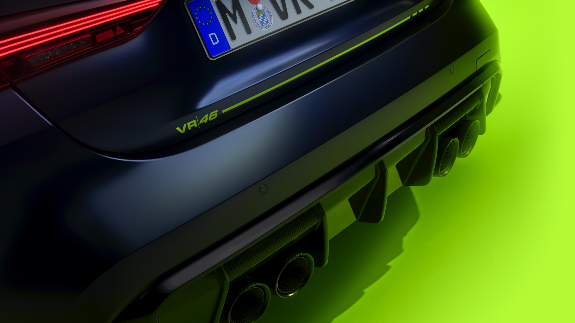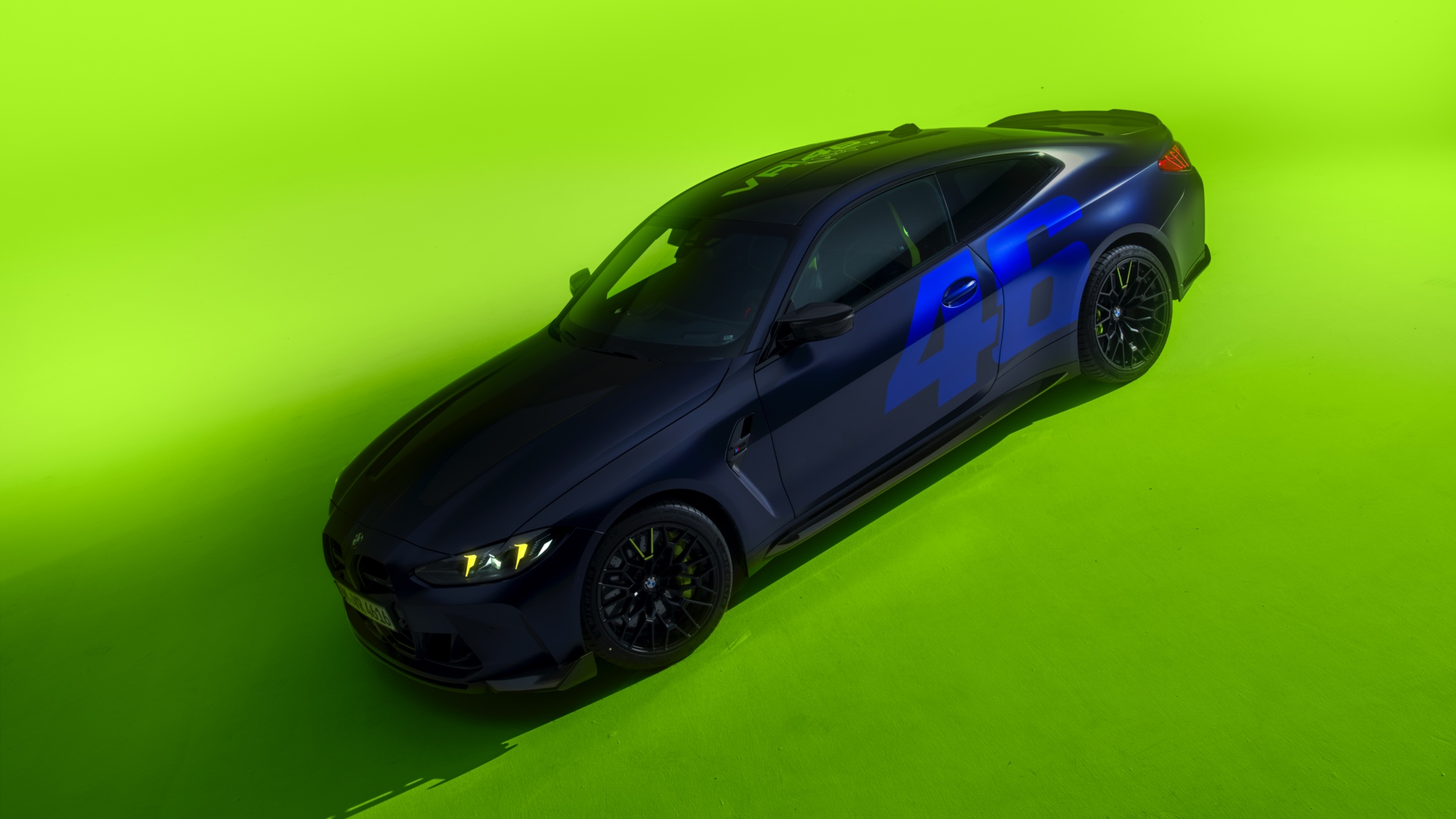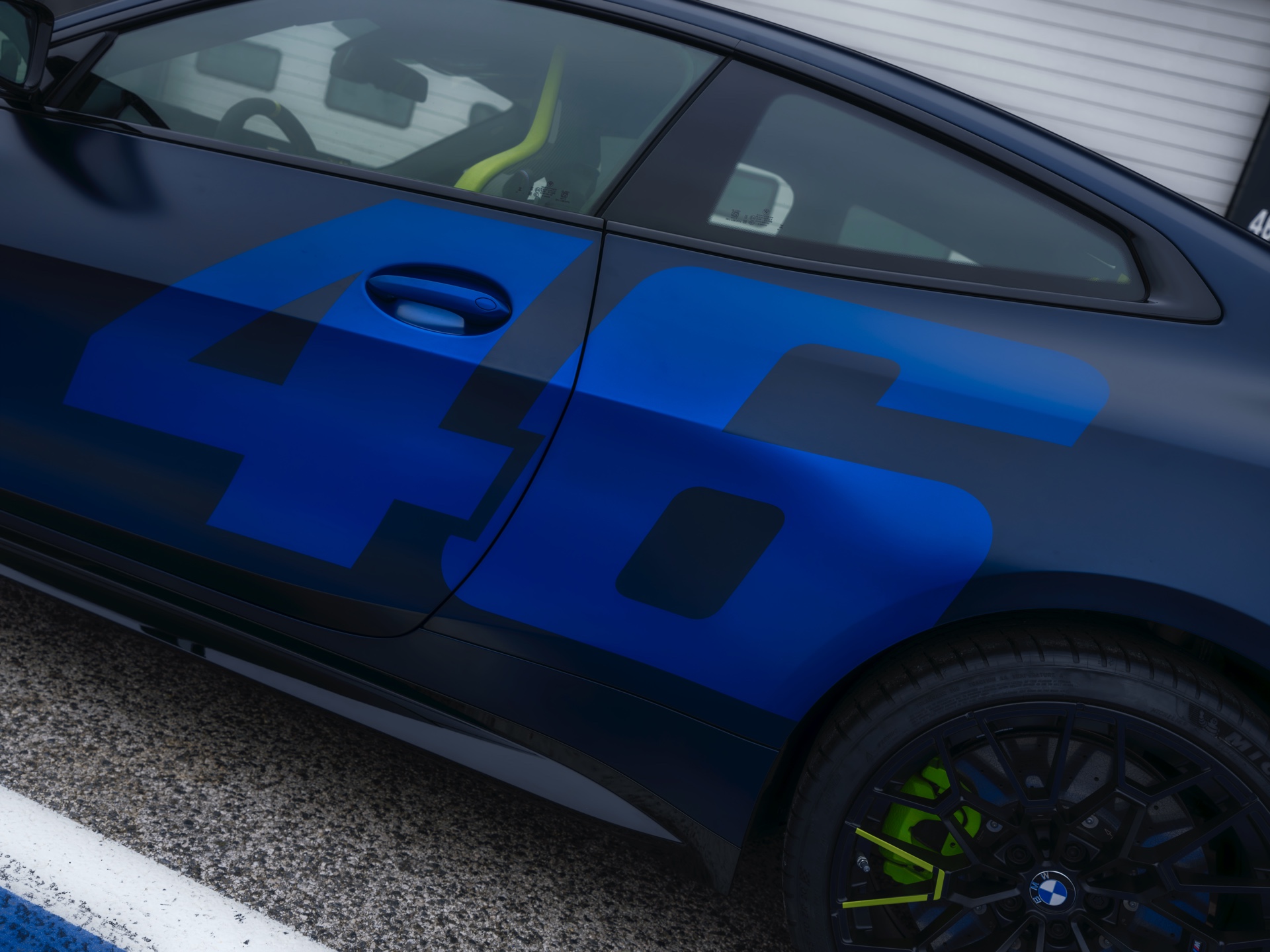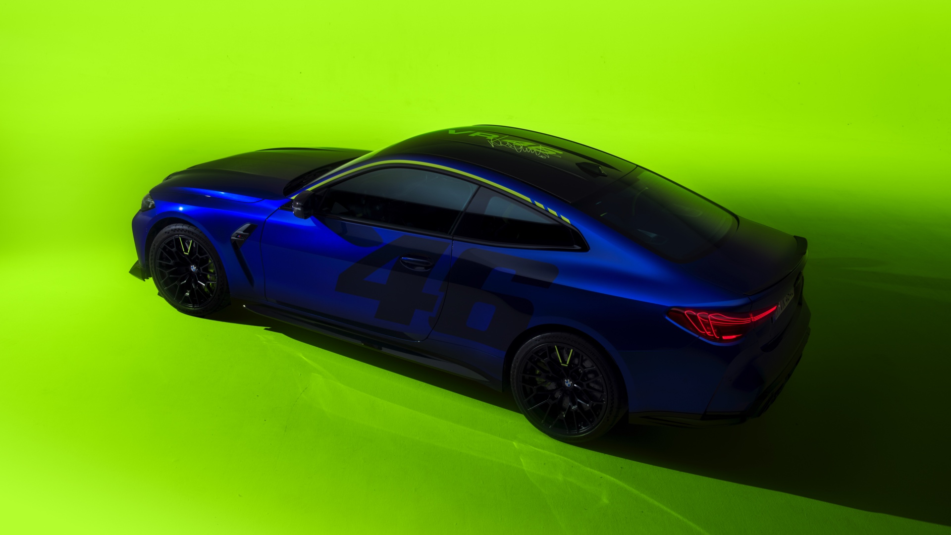 Im Innenraum darf Gelb ebenfalls nicht fehlen, dominierende Farbe ist aber das Nachtblau der Innenausstattung. Besondere Hingucker sind die gelbe 12-Uhr-Markierung, die leuchtende VR46 in den Rückenlehnen und die geprägte 01|46 auf dem Ablage-Pad der Carbon-Mittelkonsole.