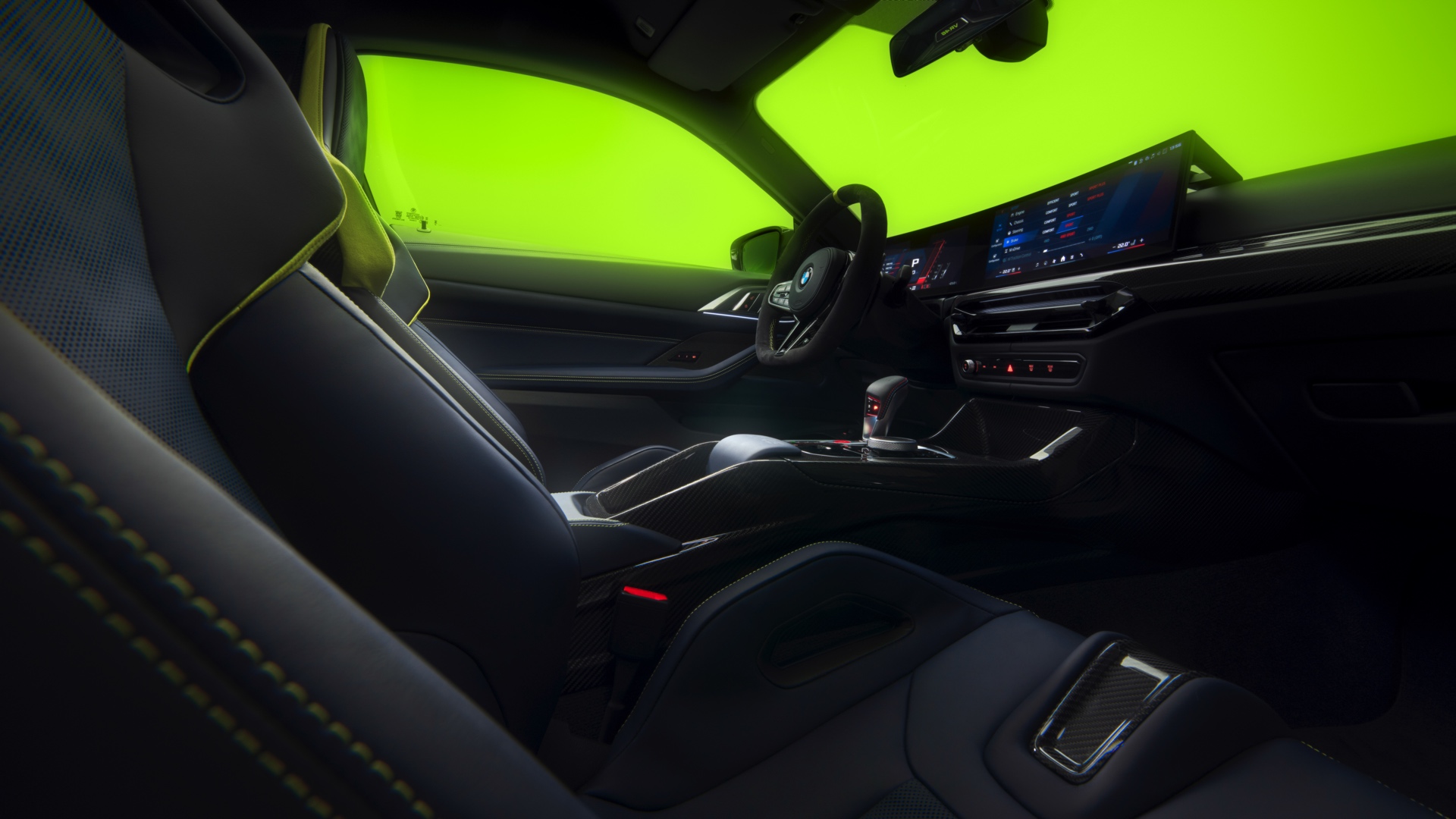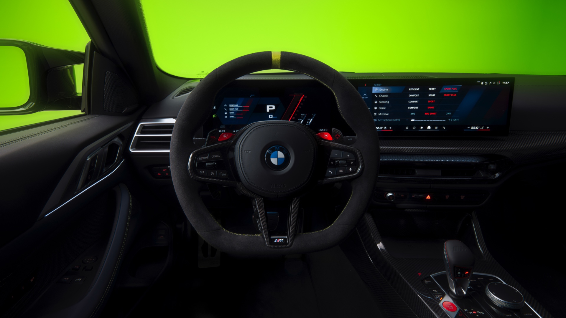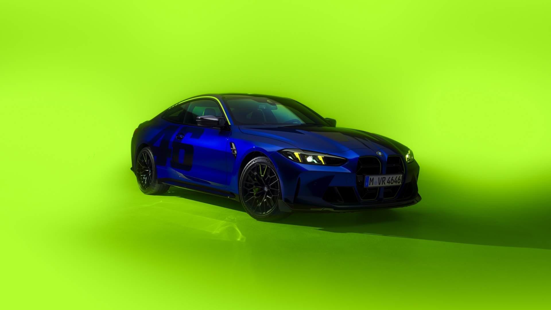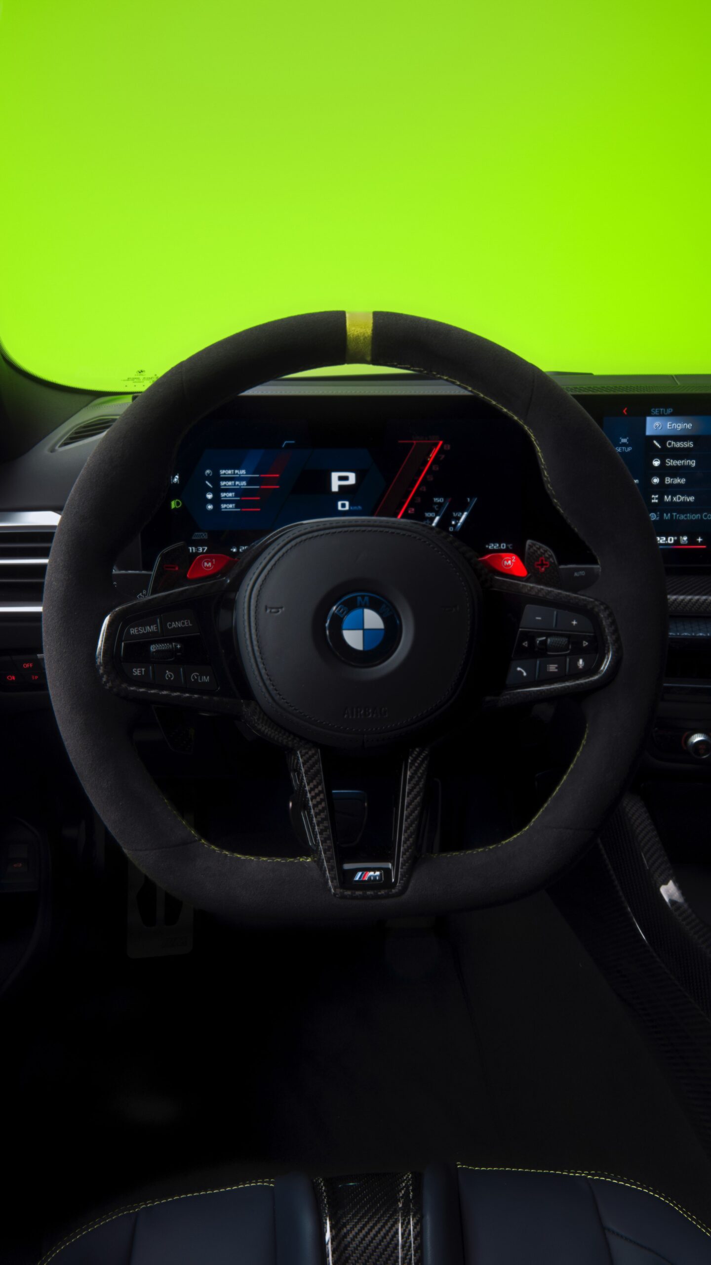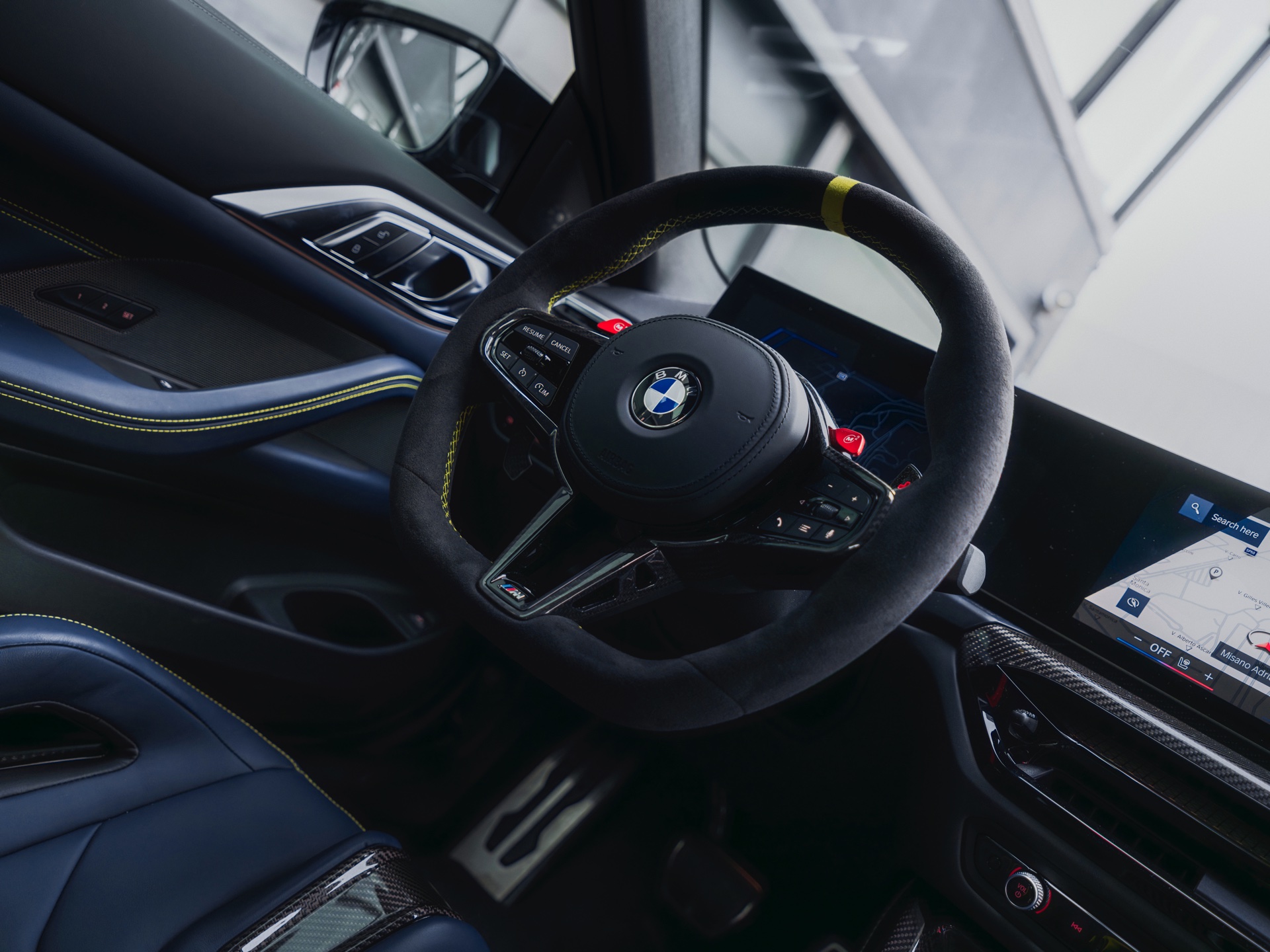 Im Innenraum darf Gelb ebenfalls nicht fehlen, dominierende Farbe ist aber das Nachtblau der Innenausstattung. Besondere Hingucker sind die gelbe 12-Uhr-Markierung, die leuchtende VR46 in den Rückenlehnen und die geprägte 01|46 auf dem Ablage-Pad der Carbon-Mittelkonsole.