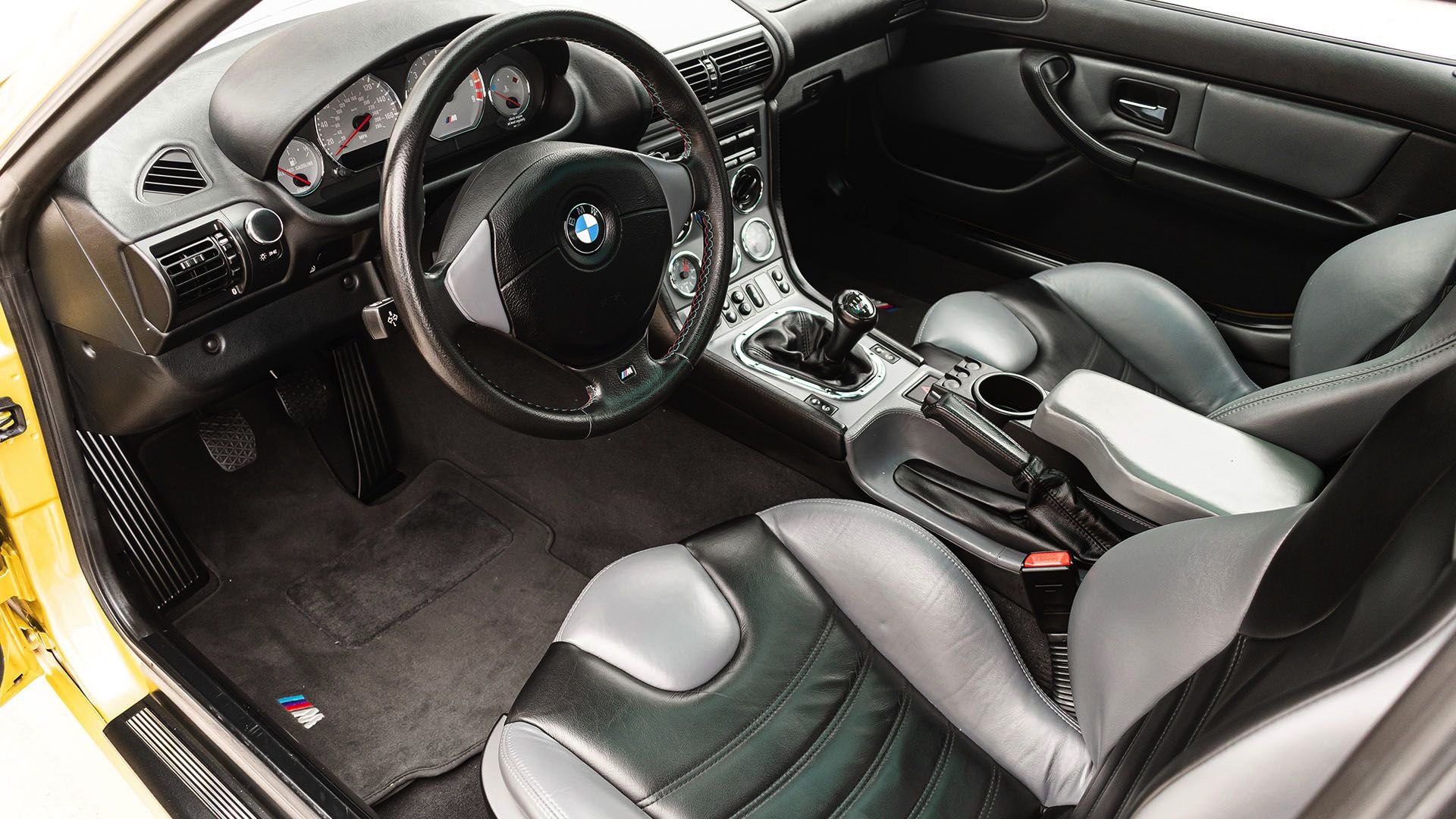 Dabei erinnert nicht nur die goldgelbe Farbe an den M3 E46, auch der Hochdrehzahl-Reihensechszylinder S54 unter der Haube stammt aus dem M3. Ein extrem authentisches Fahrerlebnis versprechen neben dem frei saugenden Triebwerk auch das manuelle Fünfgang-Getriebe und natürlich die grundlegende Charakteristik des BMW Z3 M Coupé, bei dem die Freude am Fahren stets ganz oben im Lastenheft stand. Das nun zur Auktion angebotene Exemplar steht noch auf originalen 17 Zoll-Felgen im Road Star-Design, darauf arbeiten Reifen mit aus heutiger Sicht überschaubaren Breiten von 225 Millimetern vorn und 245 Millimetern hinten.