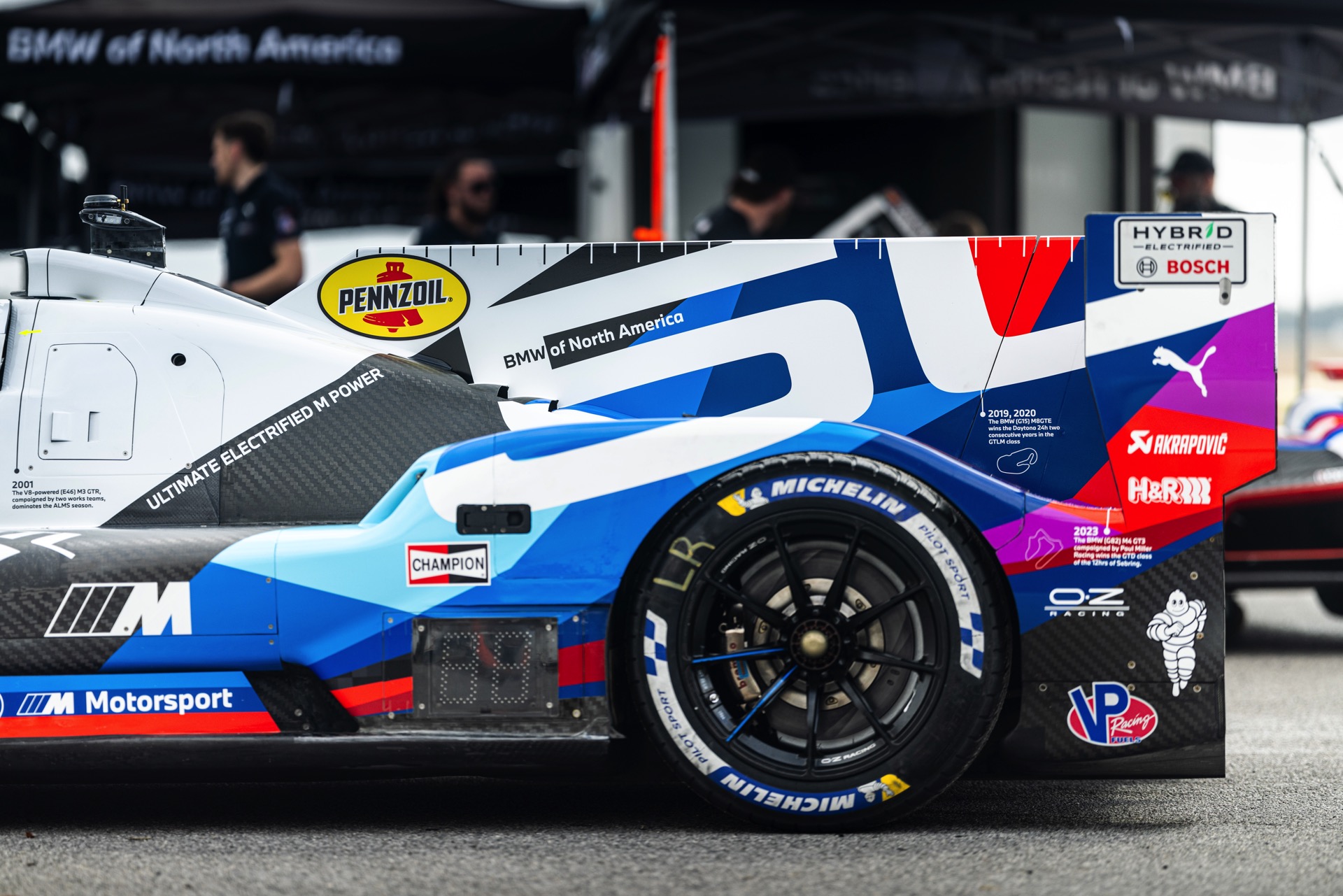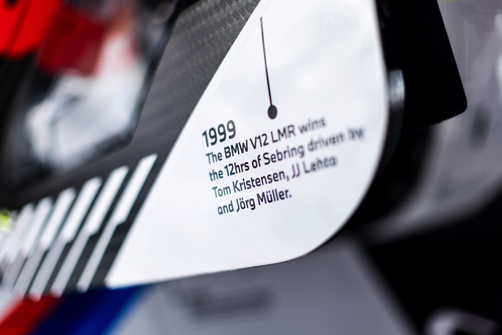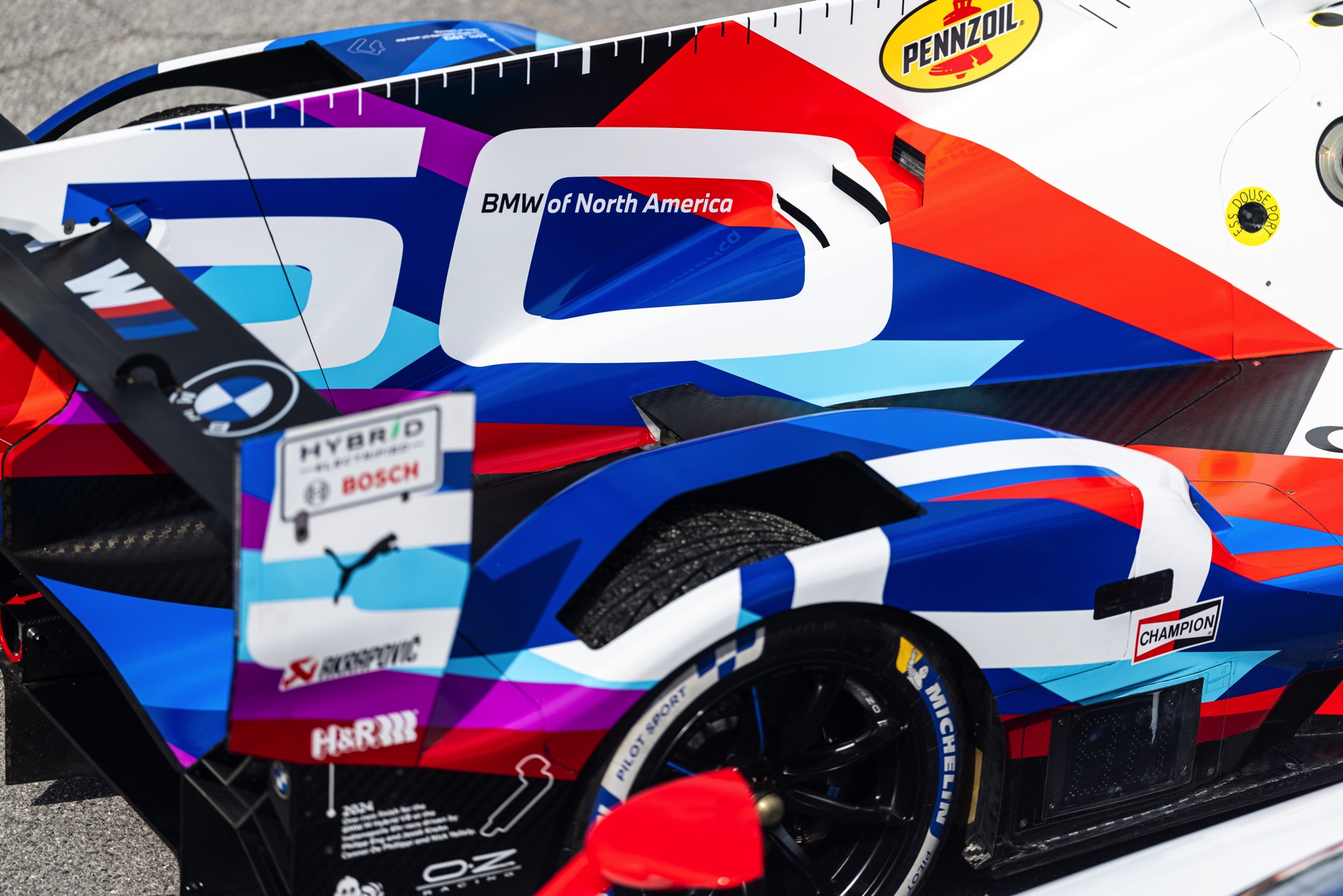 50 Jahre nach dem unerwarteten Triumph erinnert das Design des BMW M Hybrid V8 mit einer riesigen 50 an das Jubiläum, außerdem wird der ganze Vorderwagen vom Umriss der Strecke in den Farben von BMW Motorsport geziert. Diverse kleinere Schriftzüge erinnern an einzelne Erfolge auf den Rennstrecken Nordamerikas, darunter der Sieg des BMW V12 LMR bei den 12 Stunden von Sebring 1999 oder die Siege des BMW M8 GTE bei den 24 Stunden von Daytona 20 Jahre später.