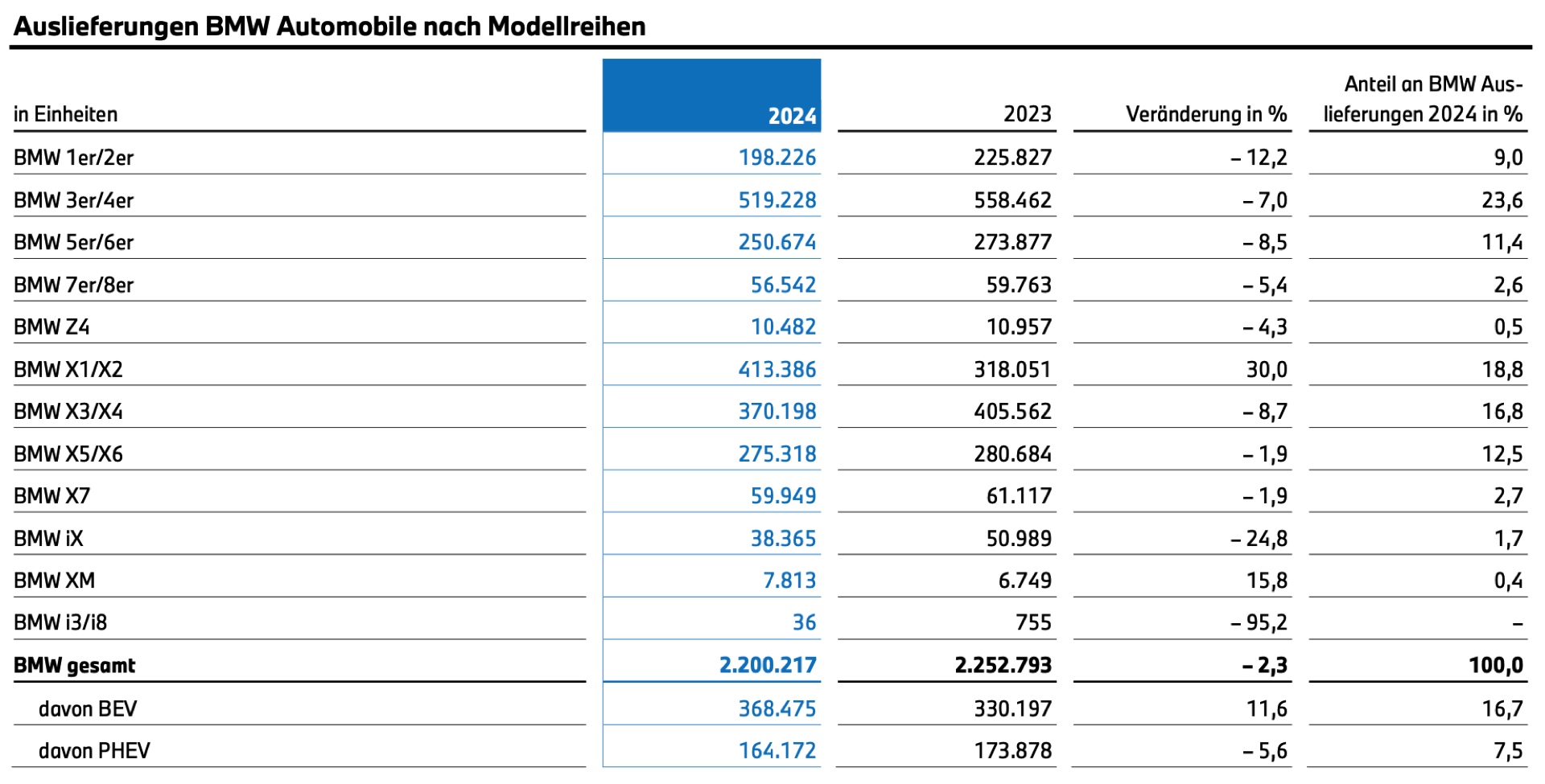 Größten Anteil am Absatz hat weiterhin die Mittelklasse: 3er und 4er kamen 2024 zusammen auf knapp 520.000 Einheiten, hinzu kommen rund 370.000 X3 und X4. Eine Klasse darüber zählen X5 & X6 mit 275.000 Einheiten sowie die 5er-Reihe mit 250.000 Einheiten zu den tragenden Säulen des Erfolgs. Eine starke Performance zeigen auch die Kompakt-SUV X1 und X2, die auf über 413.000 Einheiten kommen.