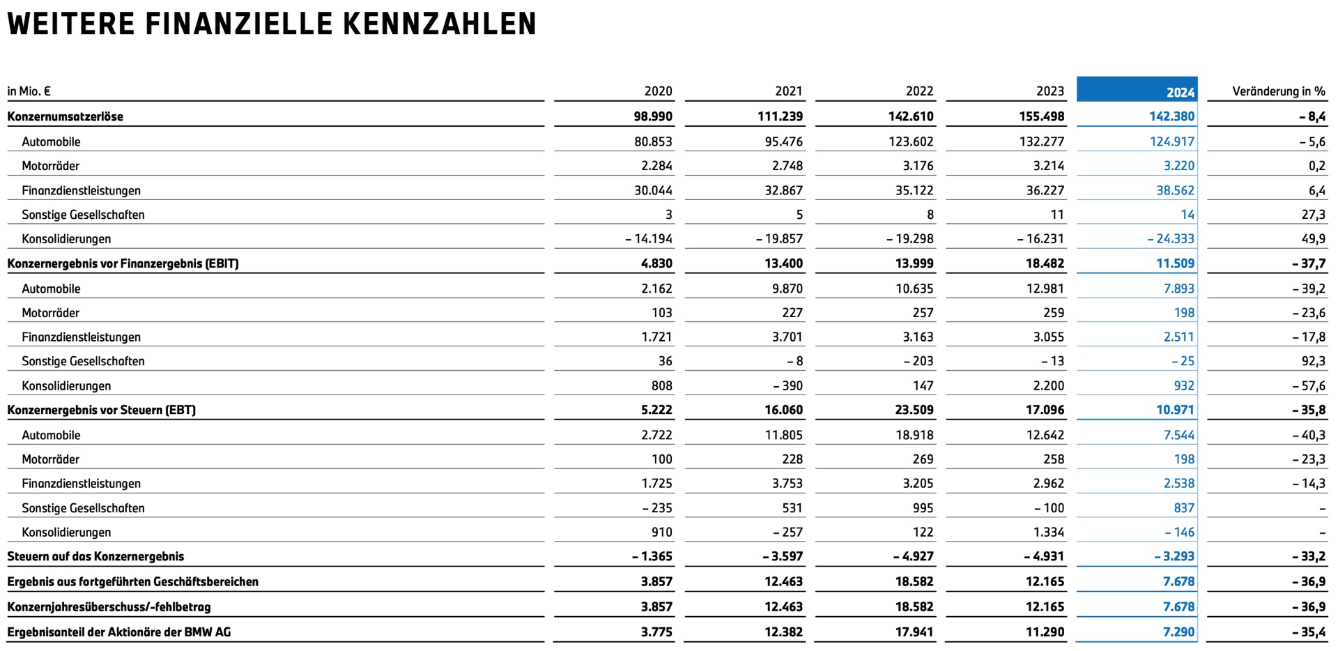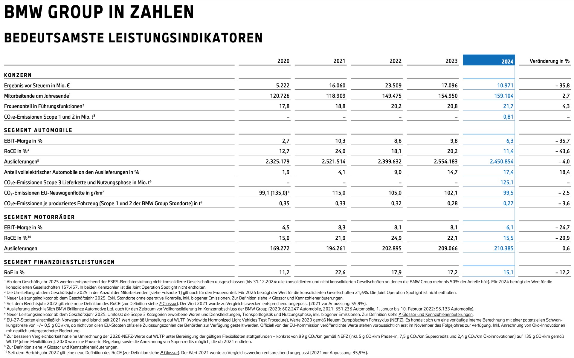 Schon nach der Anpassung der Prognose im vergangenen Herbst war klar, dass die BMW Group im Jahr 2024 keine Bestwerte bei den finanziellen Kennzahlen erreichen wird. Die heute im Jahresbericht veröffentlichten Zahlen bestätigen die angepasste Prognose im Großen und Ganzen: Der leichte Rückgang beim weltweiten Absatz 2024 führte zusammen mit Auslieferungssperren und Rückrufen sowie der allgemeinen Schwäche des chinesischen Markts zu einem Rückgang der Umsatzerlöse um 8,4 Prozent, das Ergebnis vor Steuern schrumpfte wie angekündigt deutlich und lag mit 10,971 Milliarden Euro fast 36 Prozent unter dem hohen Niveau des Vorjahres. Die im Herbst reduzierte Prognose für die EBIT-Marge hat sich ebenfalls bewahrheitet: Mit 6,3 Prozent liegt der Wert deutliche 3,5 Punkte unter dem Vorjahr, aber im angekündigten Korridor von 6 bis 7 Prozent.
