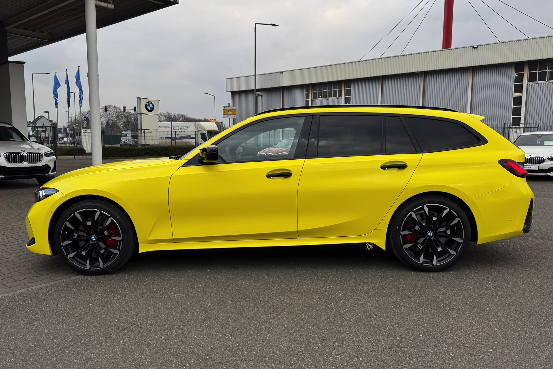 Als Basis des Borussen-Kombis dient ein aktueller BMW M340d Touring, der dank M Sport Pro-Paket samt Shadow Line mit erweiterten Umfängen sowie der Sonnenschutzverglasung bereits ab Werk viele schwarze Details trägt. Nach der Komplett-Folierung entfalten die schwarzen Details eine noch größere Wirkung, denn sie sind Teil eines konsequent durchgezogenen Bicolor-Auftritts in Gelb-Schwarz. Neben der schwarzen Niere, schwarzen Außenspiegel-Kappen und schwarzer Dachreling bietet der 3er Touring nun auch Türgriffe in schwarzer Kontrastfarbe, auf der Beifahrerseite ziert außerdem ein riesiger schwarzer “Farbklecks” Motorhaube, Kotflügel und Frontschürze.