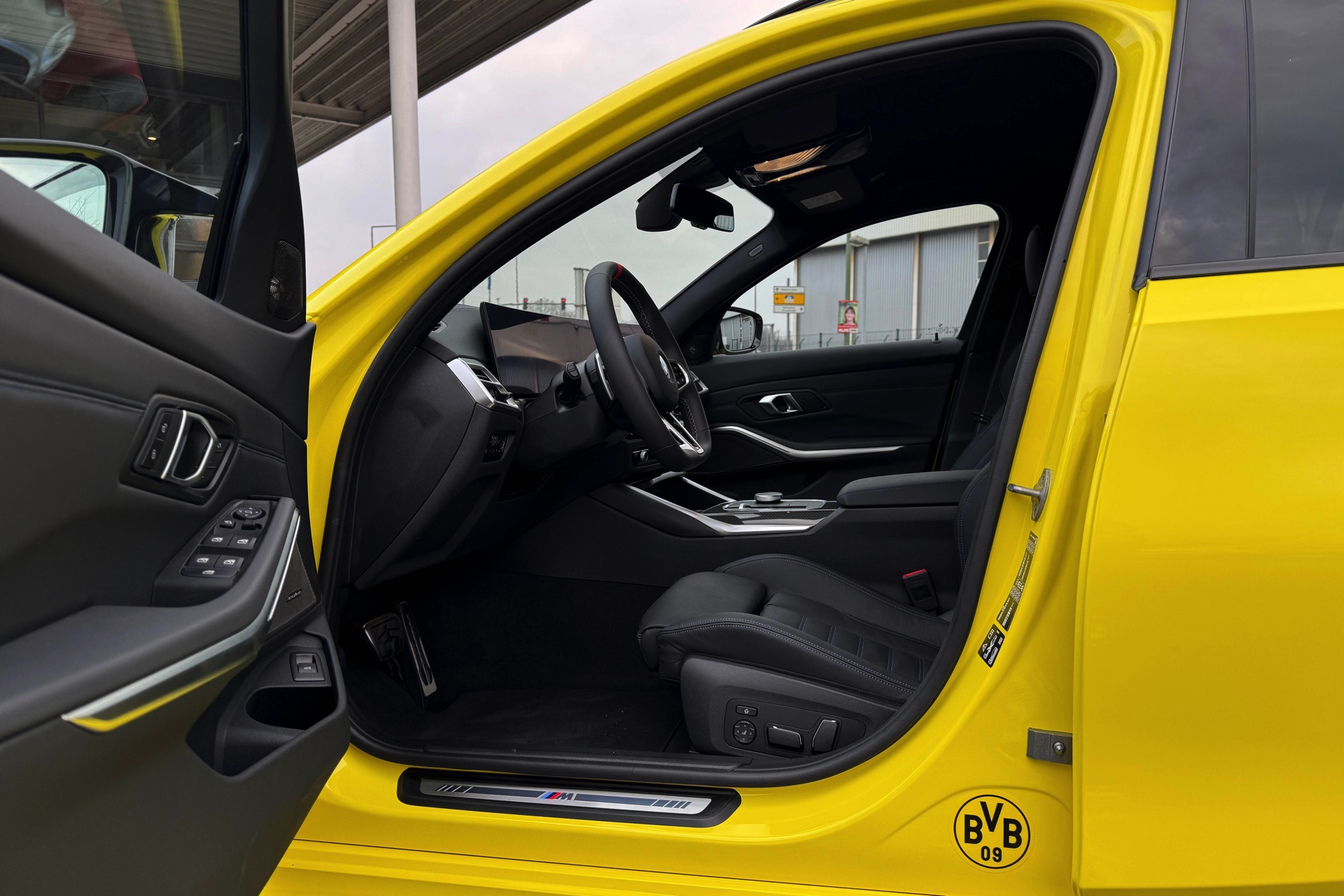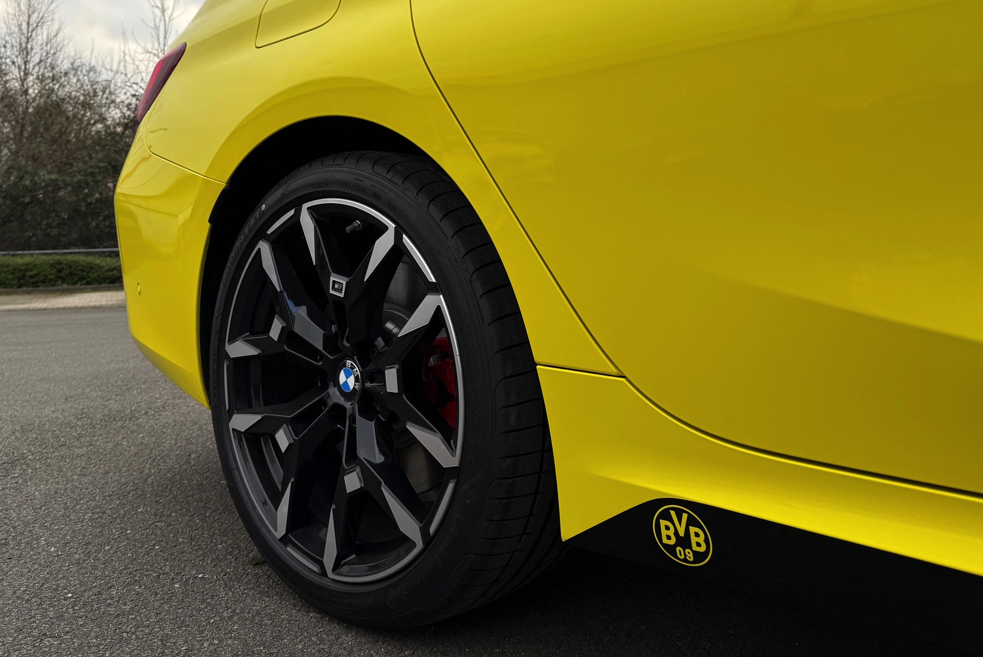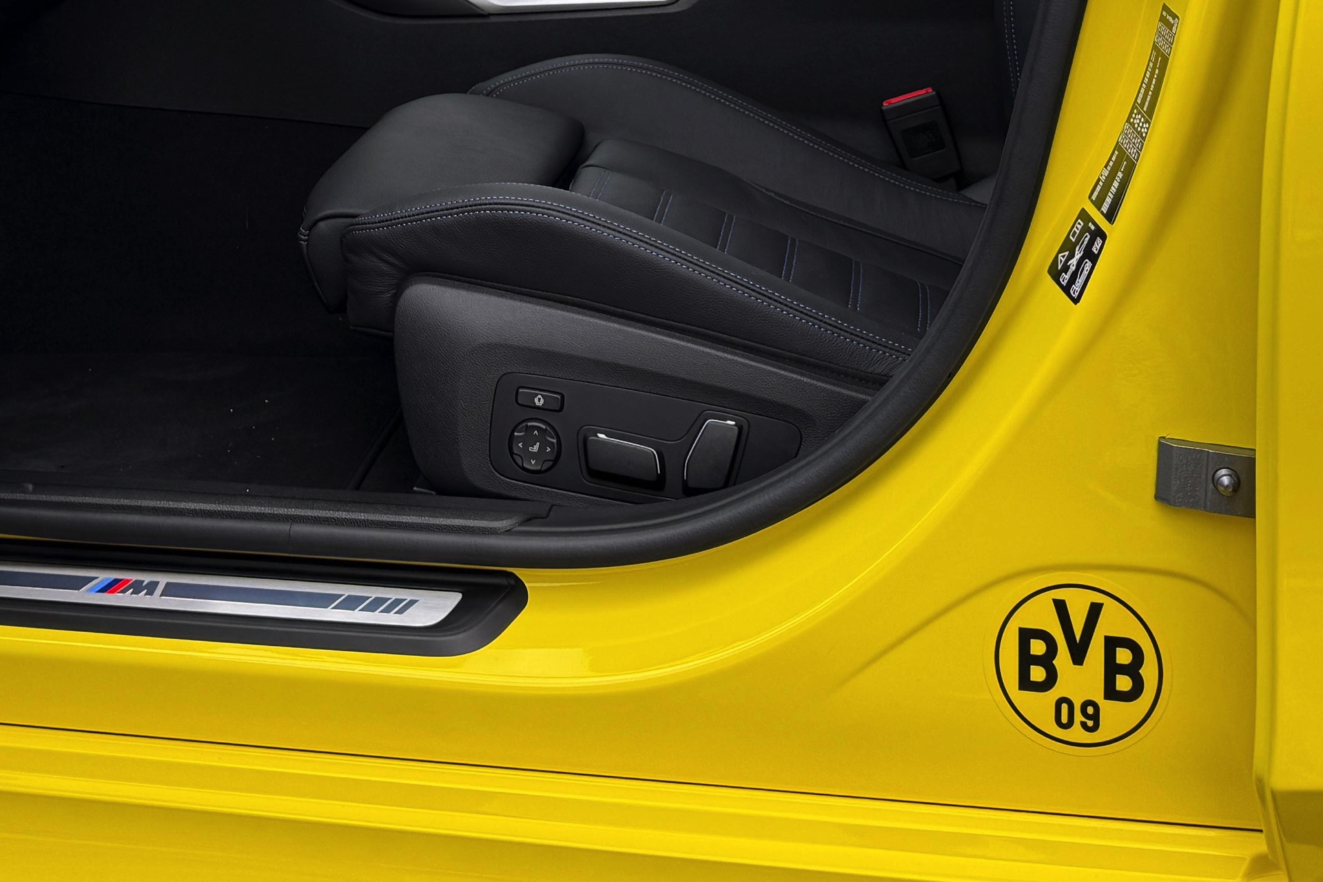 Der konsequente Bicolor-Look in Gelb und Schwarz geht aber noch weiter, denn er umfasst auch ein ganz besonderes Detail: Sogar die BMW-Logos an Front und Heck wurden durch das ebenfalls kreisrunde Logo von Borussia Dortmund ersetzt. Das typische blau-weiße Logo von BMW findet sich daher nur noch auf den Felgen. Weitere Hingucker sind die BVB-Logos auf den Seitenschwellern und sogar am Fuß der B-Säulen, sodass sie bei jedem Öffnen der vorderen Türen ins Auge fallen.