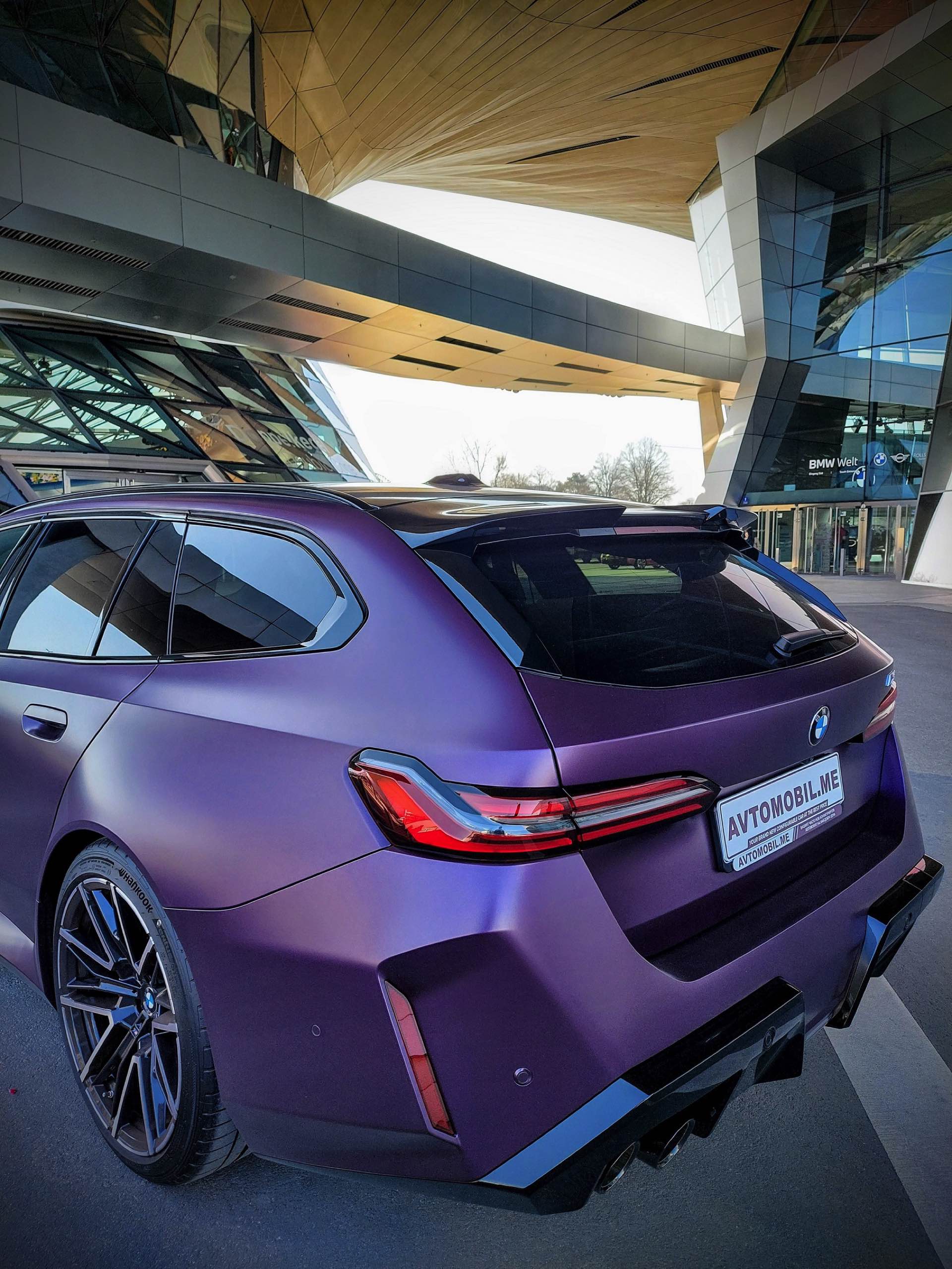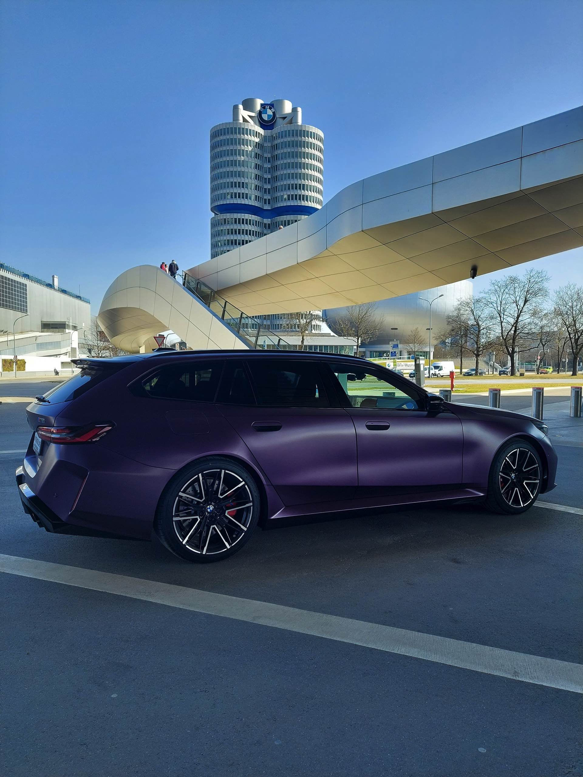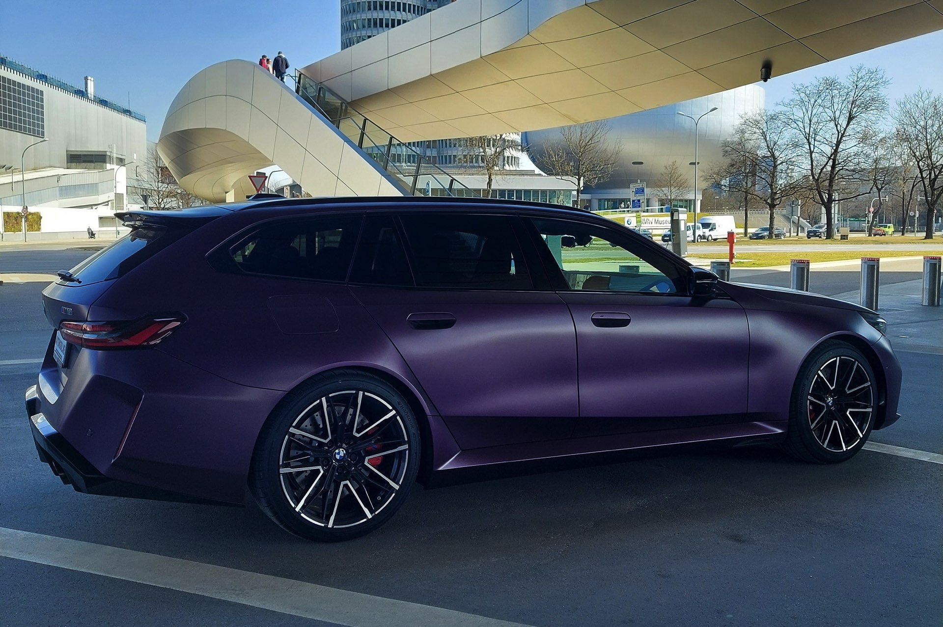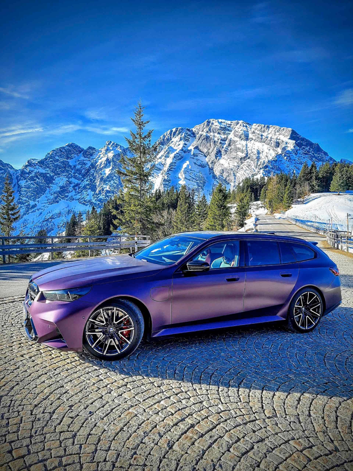 Der neue BMW M5 Touring (G99) bietet nicht nur jede Menge Platz im Kofferraum, er ist auch eine riesige Leinwand für spannende Individual-Farben. Bereits im vergangenen September bestellte einer unserer Leser den nach eigener Aussage ersten neuen M5 Touring mit Sonderwunsch-Lackierung – und das gleich im ausgesprochen seltenen Frozen Purple Metallic (Farbcode P9A). Der 727 PS starke Power-Kombi im ebenso matten wie intensiven Violett ist in absolut jedem Umfeld der Hingucker Nummer 1, woran neben der Farbe natürlich auch die muskulösen Formen des G99 ihren Anteil haben: Die Kotflügel sind vorne wie hinten deutlich verbreitert und schaffen so Platz für eine im Vergleich zum regulären G61 erheblich breitere Spur.
