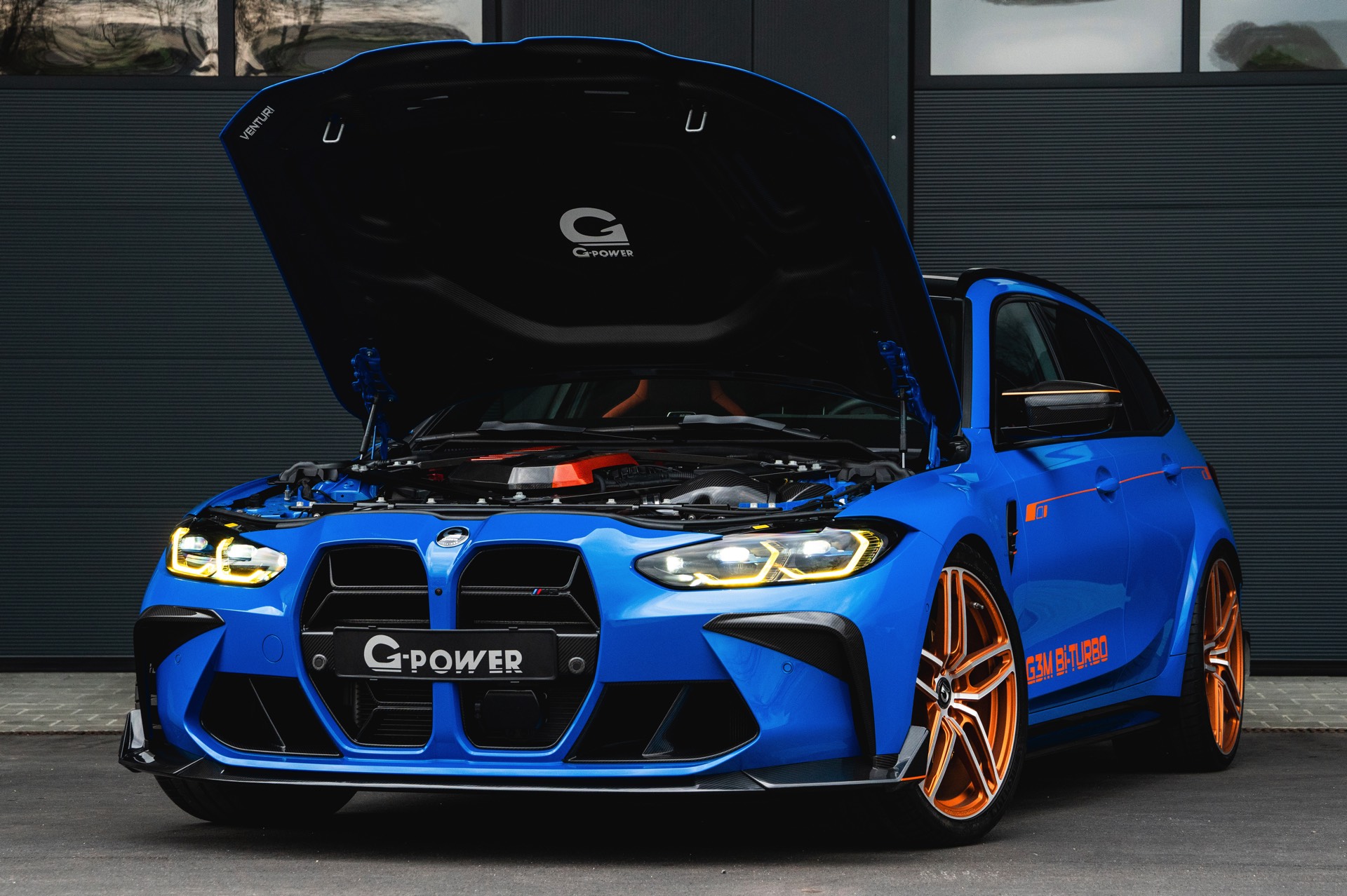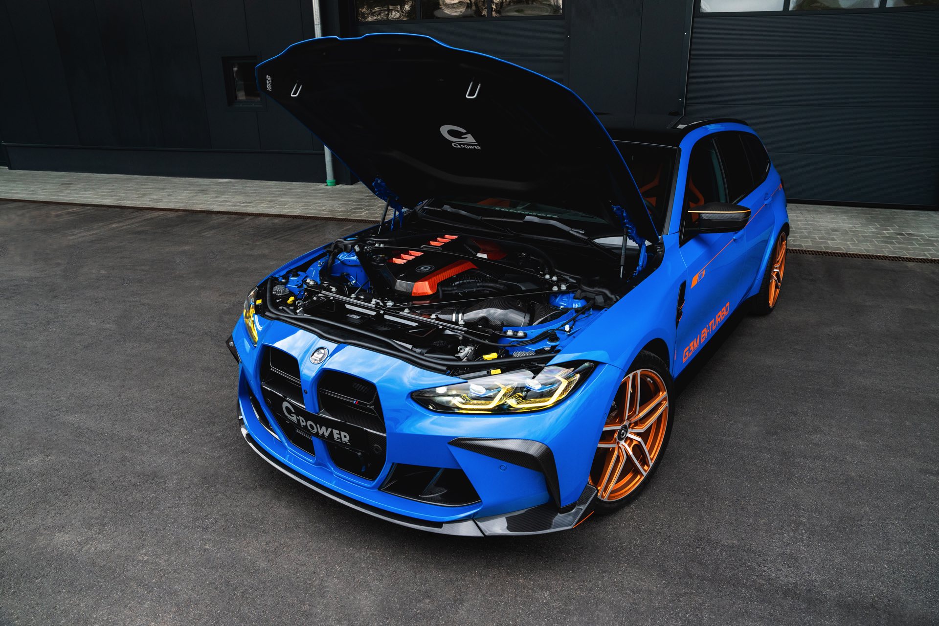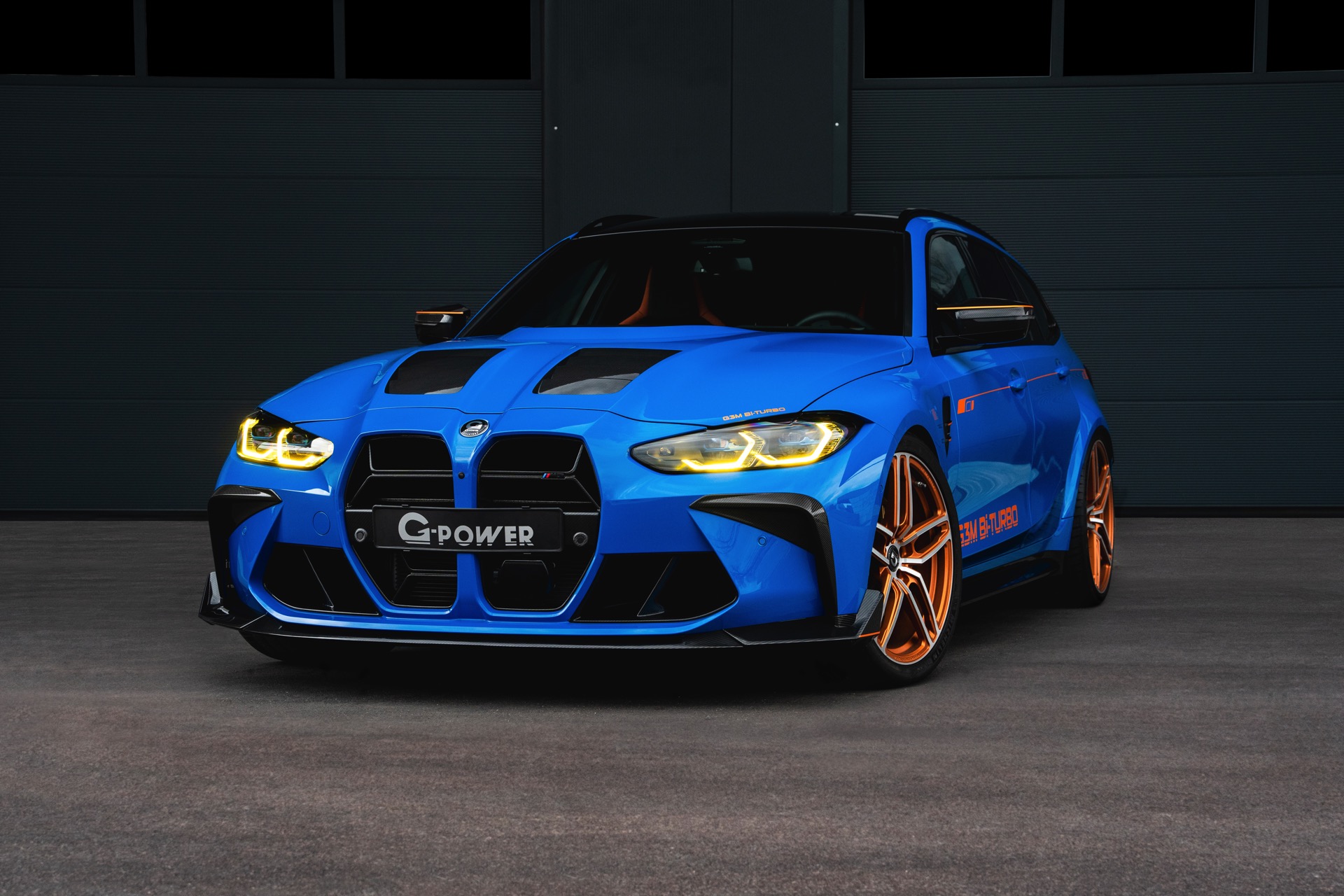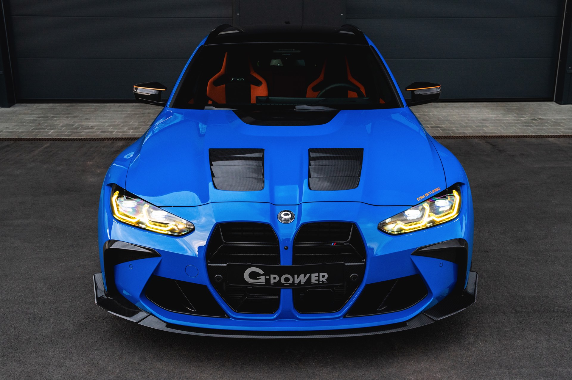 Passend zur massiven Leistungssteigerung schärft G-Power auch den Auftritt des BMW M3 Touring deutlich nach: Der in leuchtendem Voodoo Blau lackierte G81 erhält nicht nur eine orange Akzent-Beklebung, sondern auch zahlreiche Carbon-Anbauteile. Größter Hingucker ist dabei die Venturi-Motorhaube aus Carbon, die auch gleiche für eine bessere Entlüftung des Motorraums sorgt. Frontspoiler, Front-Corner und eine Carbon-Niere mit nur drei Querstreben lassen die Front noch aggressiver wirken.