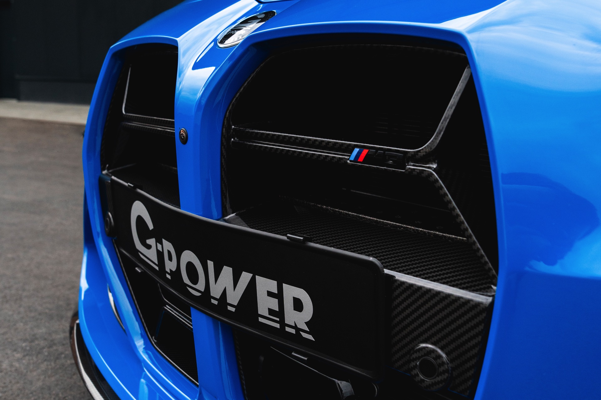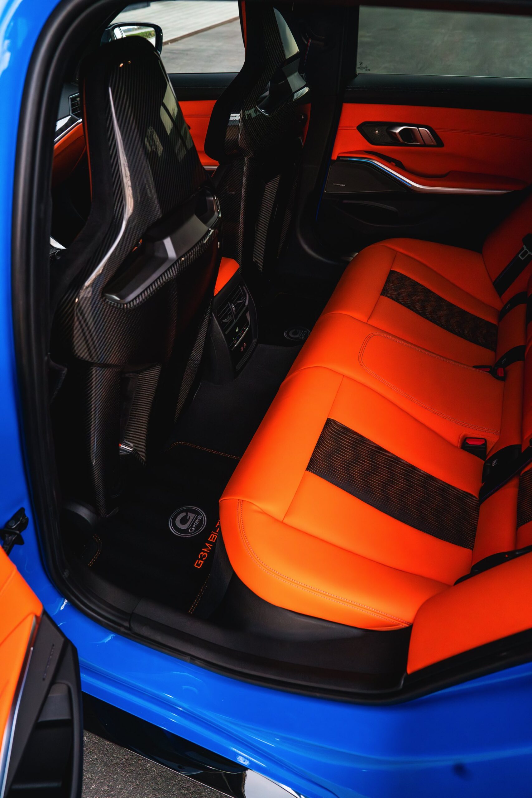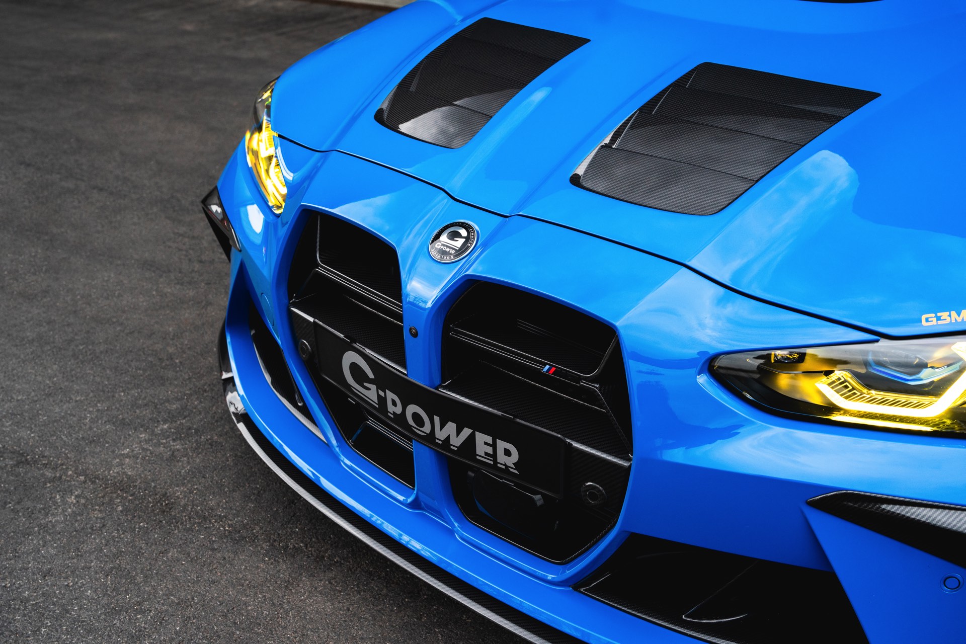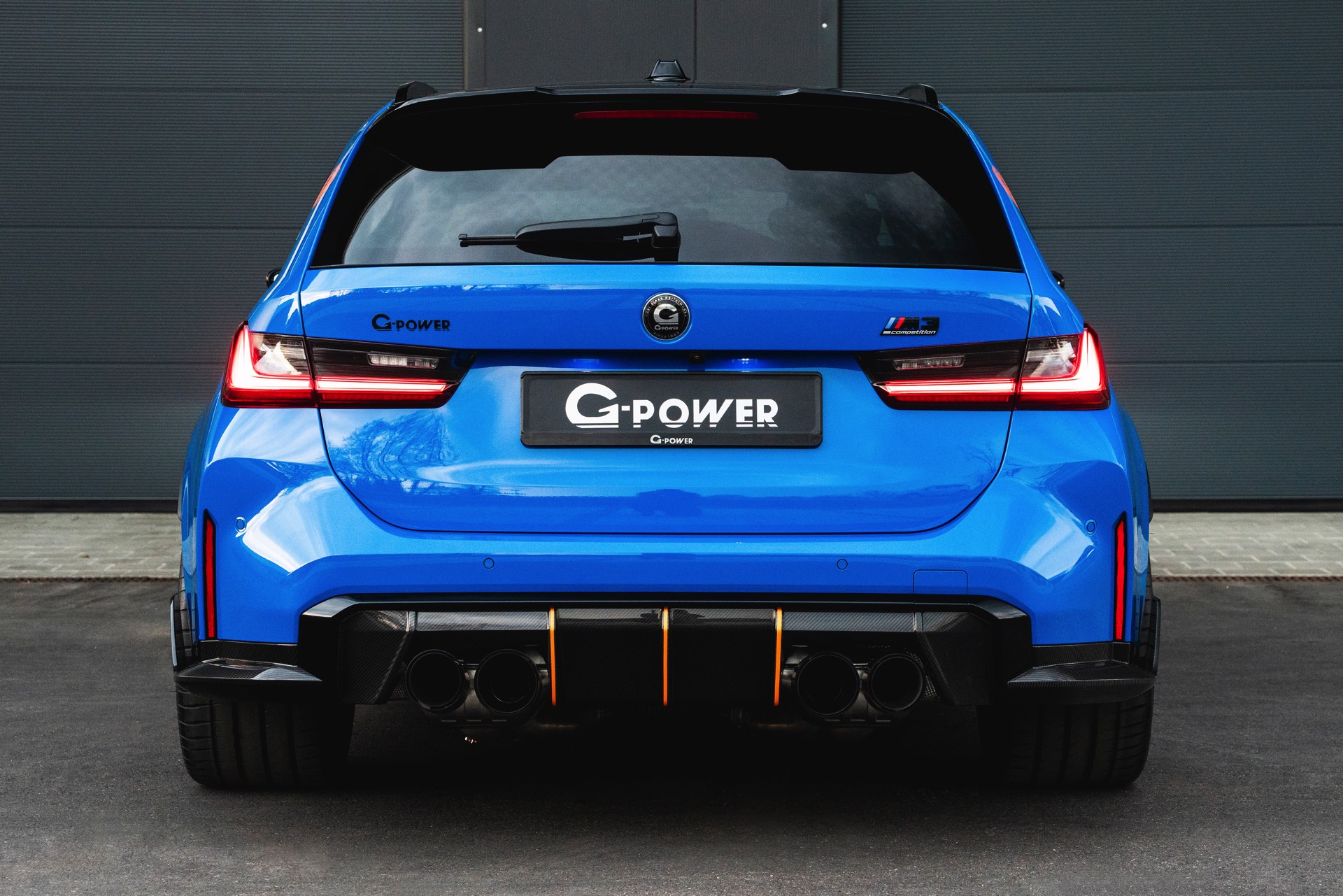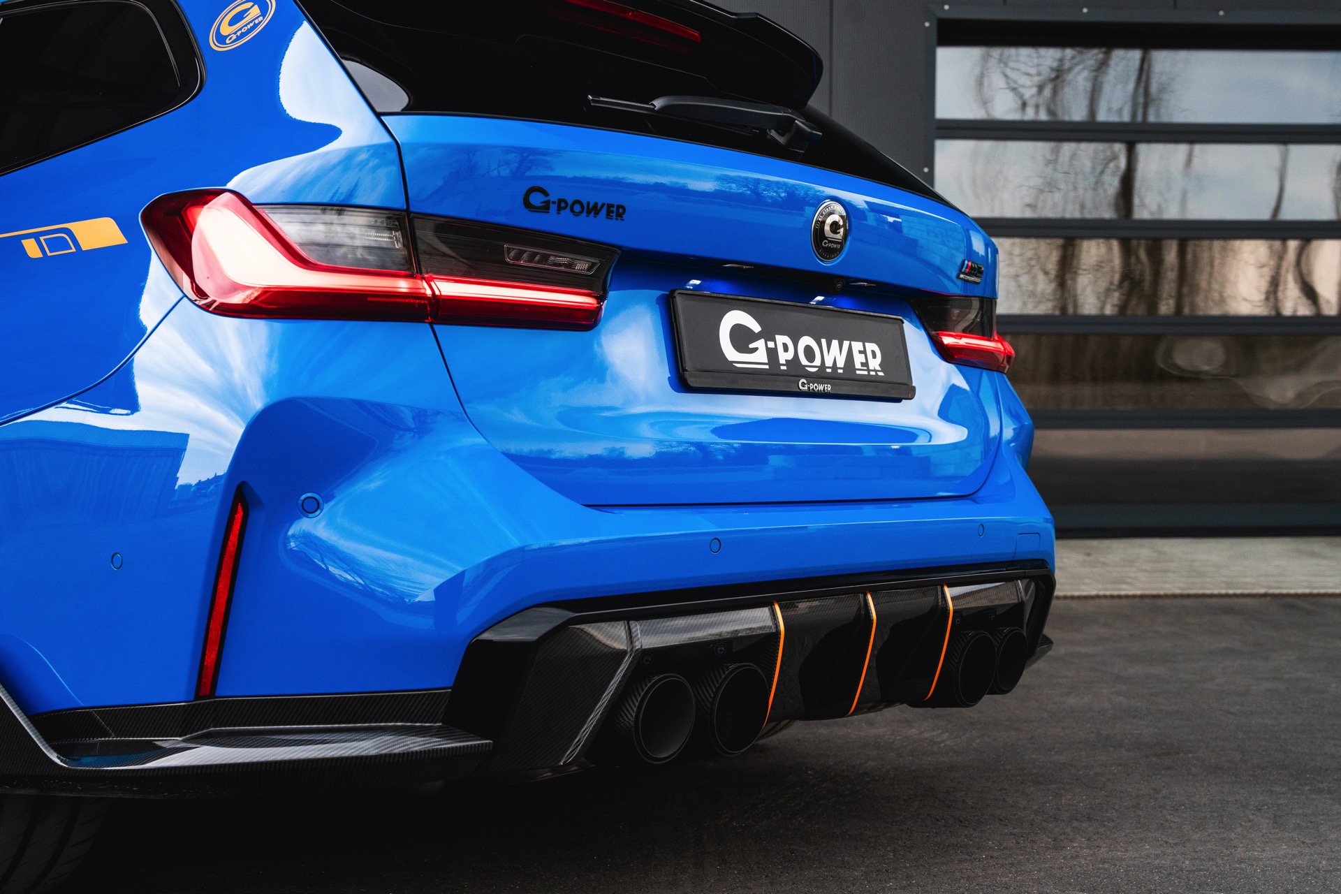 Passend zur massiven Leistungssteigerung schärft G-Power auch den Auftritt des BMW M3 Touring deutlich nach: Der in leuchtendem Voodoo Blau lackierte G81 erhält nicht nur eine orange Akzent-Beklebung, sondern auch zahlreiche Carbon-Anbauteile. Größter Hingucker ist dabei die Venturi-Motorhaube aus Carbon, die auch gleiche für eine bessere Entlüftung des Motorraums sorgt. Frontspoiler, Front-Corner und eine Carbon-Niere mit nur drei Querstreben lassen die Front noch aggressiver wirken.