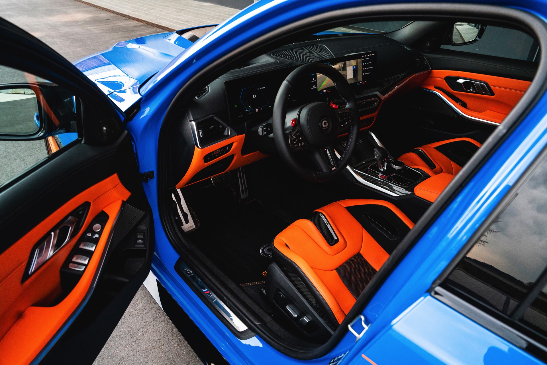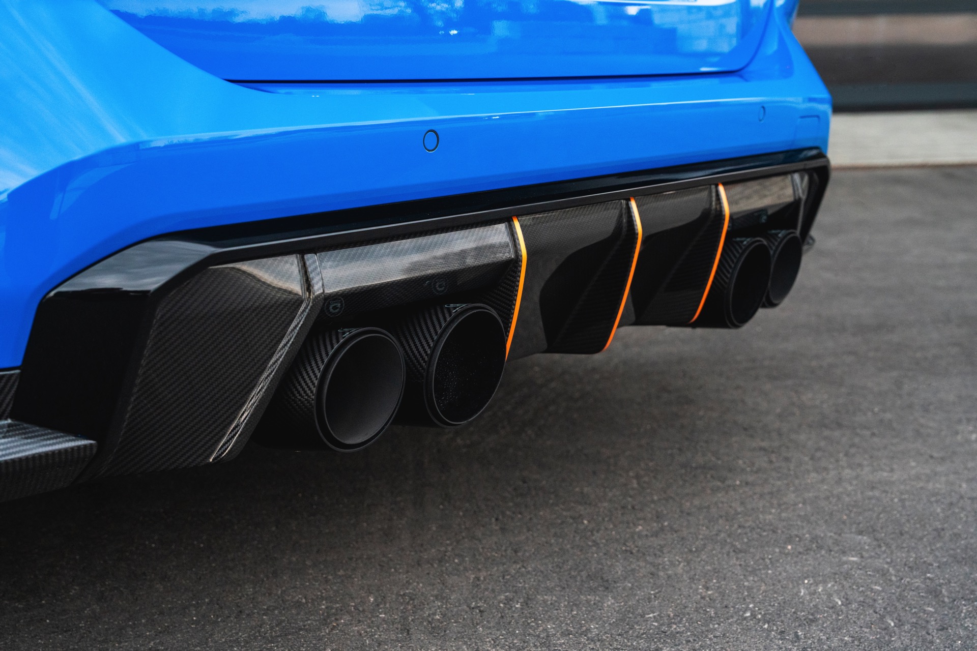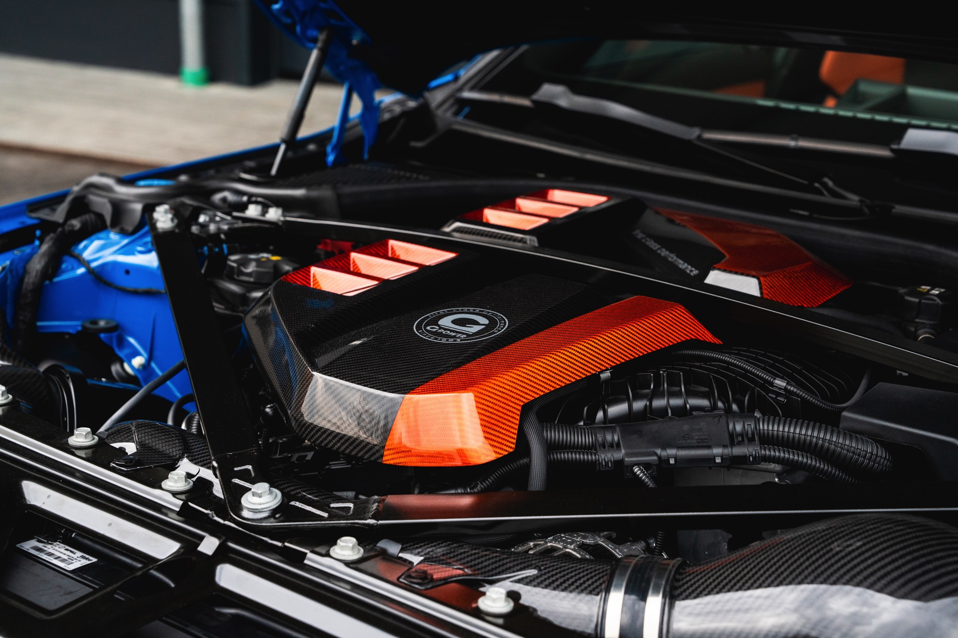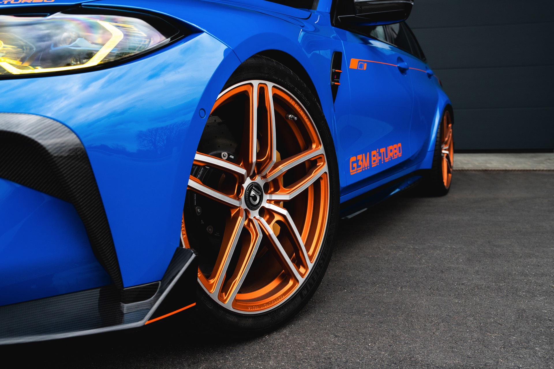 Passend zur massiven Leistungssteigerung schärft G-Power auch den Auftritt des BMW M3 Touring deutlich nach: Der in leuchtendem Voodoo Blau lackierte G81 erhält nicht nur eine orange Akzent-Beklebung, sondern auch zahlreiche Carbon-Anbauteile. Größter Hingucker ist dabei die Venturi-Motorhaube aus Carbon, die auch gleiche für eine bessere Entlüftung des Motorraums sorgt. Frontspoiler, Front-Corner und eine Carbon-Niere mit nur drei Querstreben lassen die Front noch aggressiver wirken.