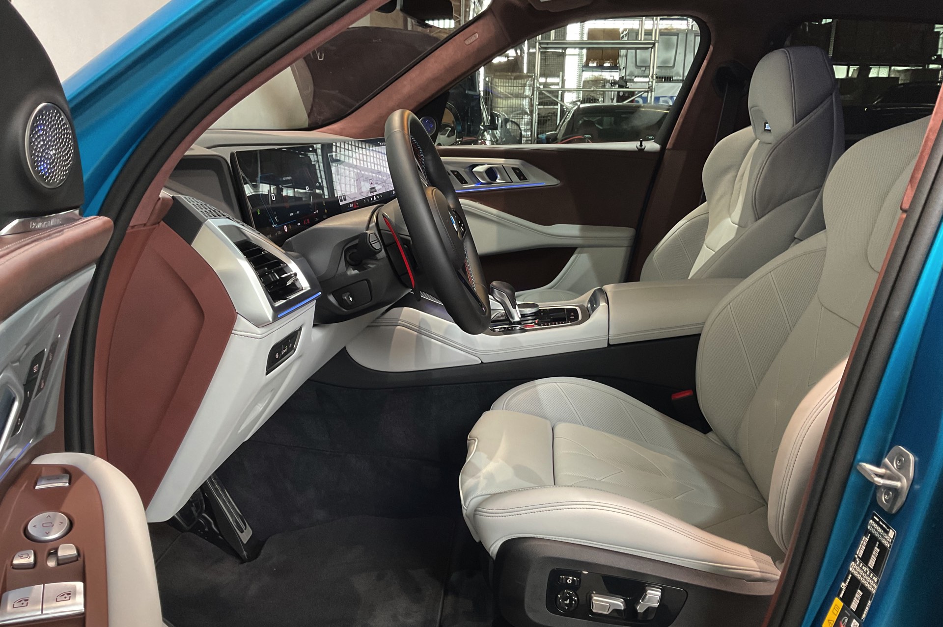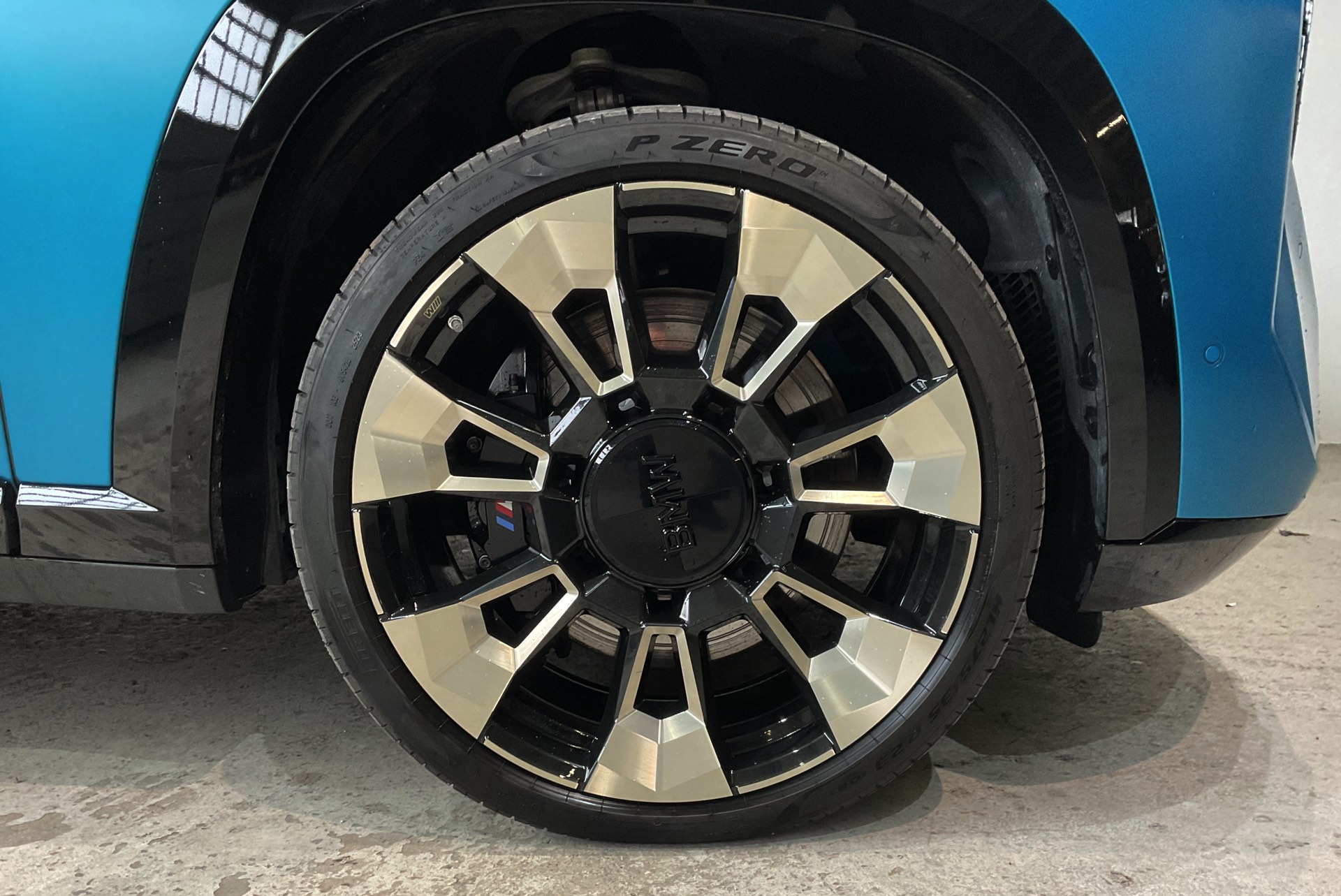 Passend zur exklusiven Konfiguration trägt der BMW XM in Frozen Tulum Blue auch die 23 Zoll großen Leichtmetallräder Sternspeiche 923 M Bicolor, die zu den größten ab Werk erhältlichen Felgen zählen. Für edles Flair im zweifarbigen Innenraum sorgt die BMW Individual Lederausstattung Merino mit Exklusivumfängen, die in hellem Silverstone und warmen Braun-Tönen gehalten ist.