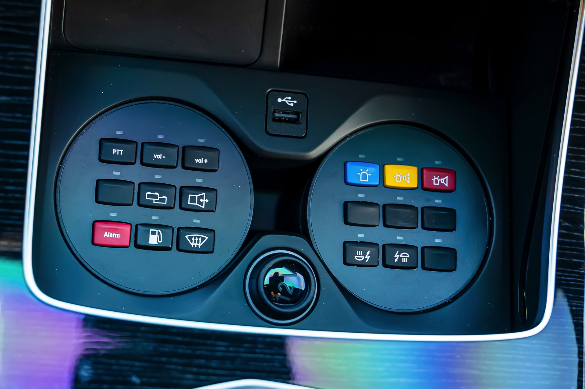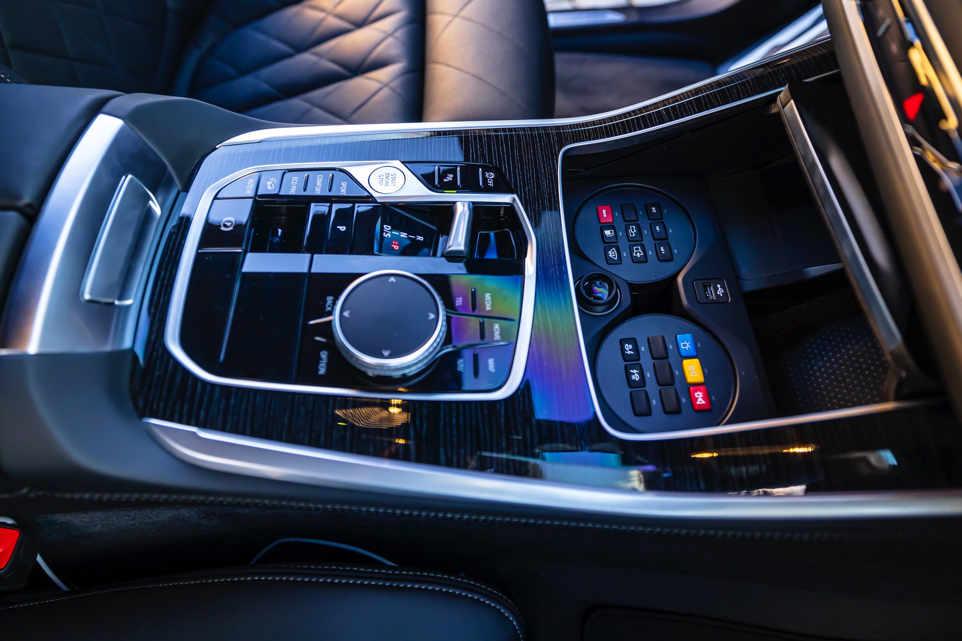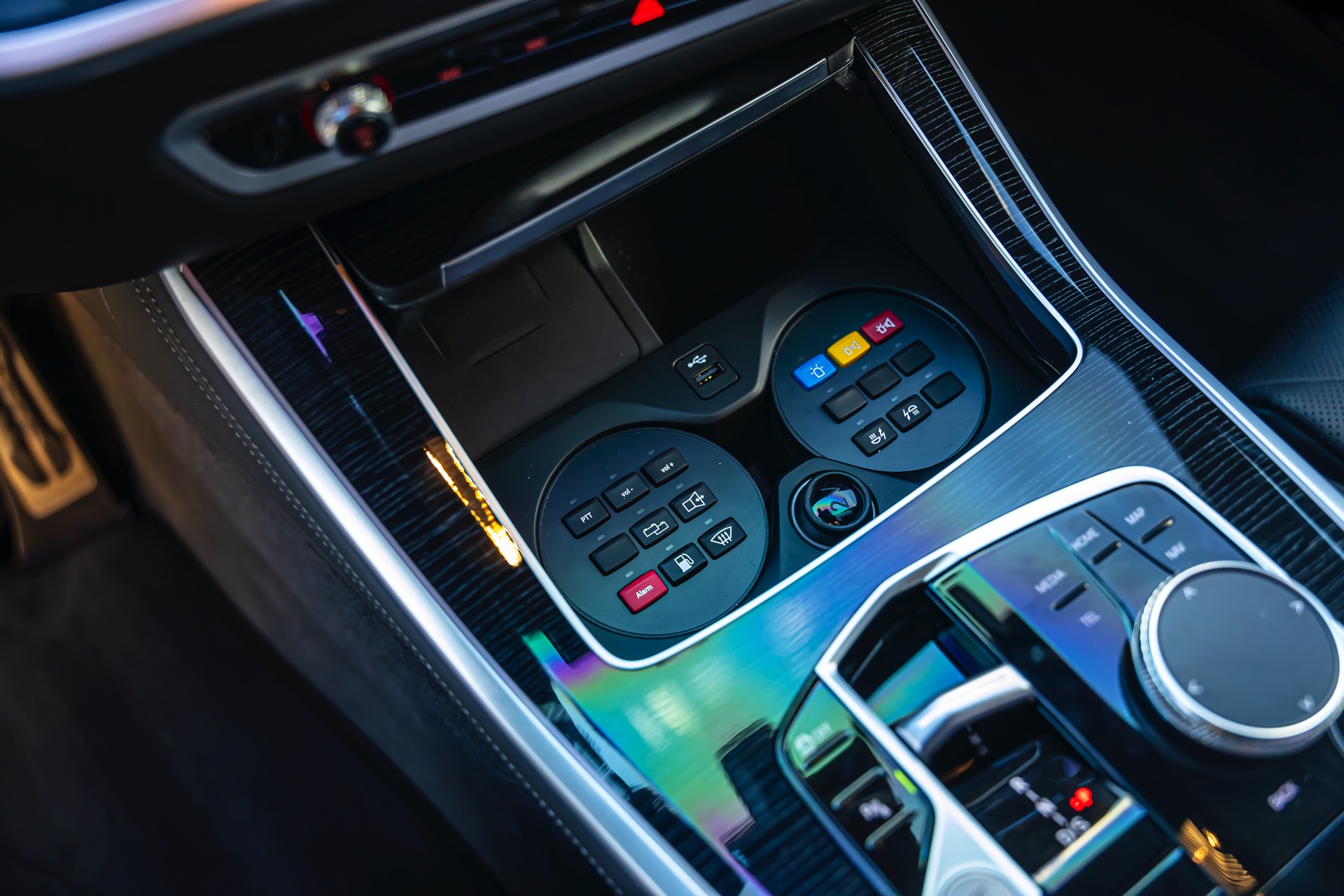 Beim Blick in den Innenraum fallen nicht nur die zentimeterdicken Scheiben ins Auge, wir sehen auch die speziellen “Cupholder” des gepanzerten X5: Wo normalerweise Coffee-to-go-Becher oder andere Gegenstände landen, finden sich im Fall des BMW X5 Protection eine Vielzahl von Knöpfen für Spezial-Funktionen. Hierzu zählen beispielsweise eine Sprechanlage für die Kommunikation mit Außenstehenden, aber auch die Steuerung der Lichtsignale – und mehrere Blindtasten deuten an, dass es durchaus noch weitere Funktionen geben könnte.