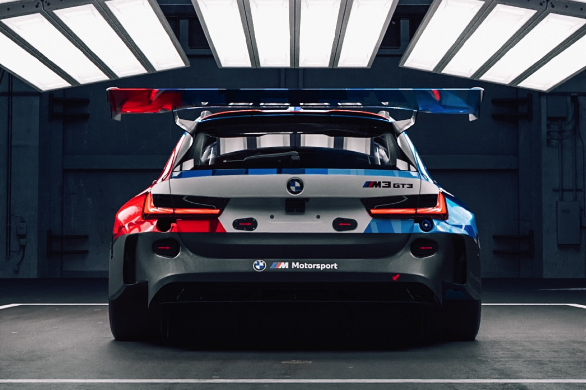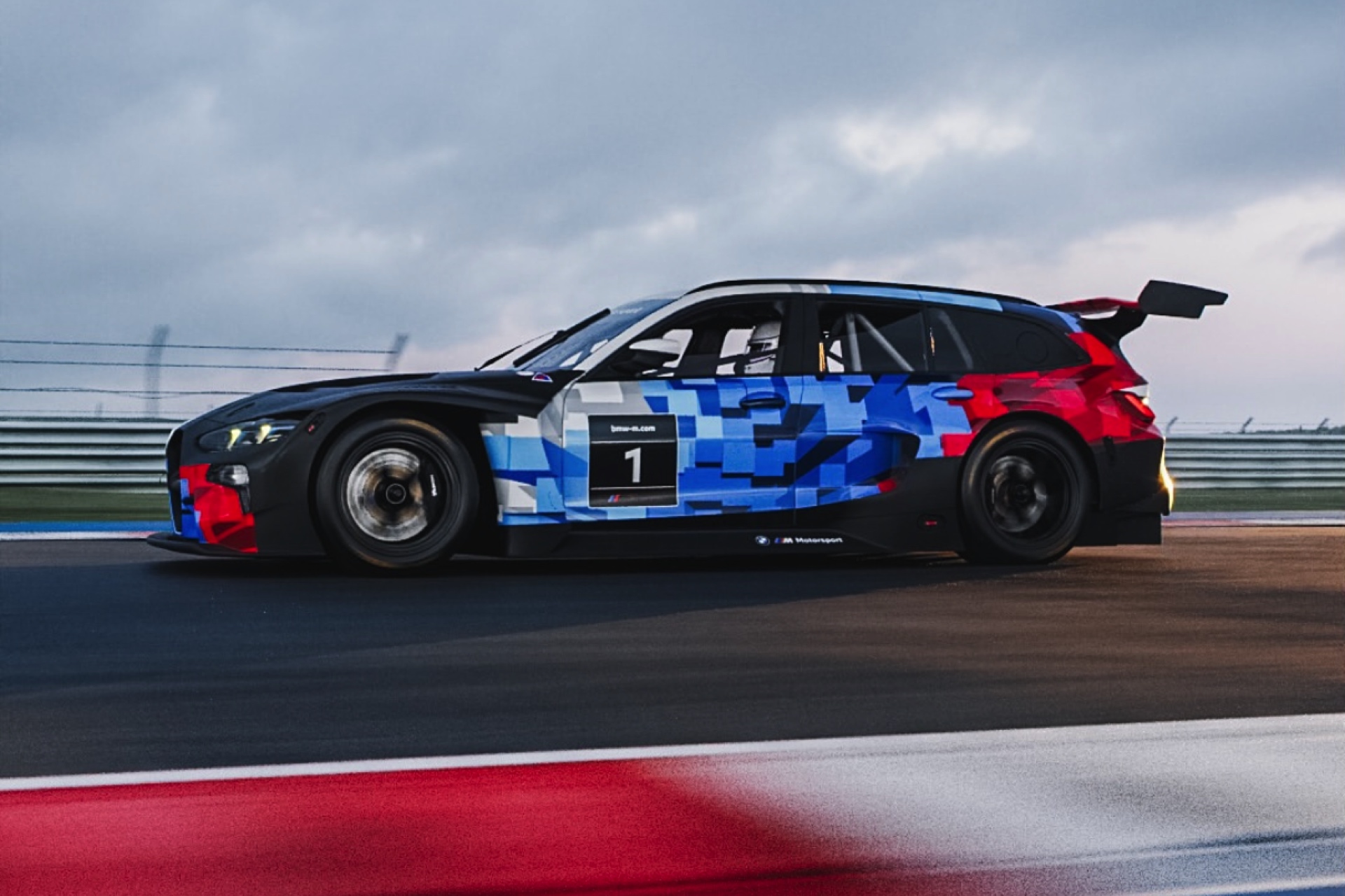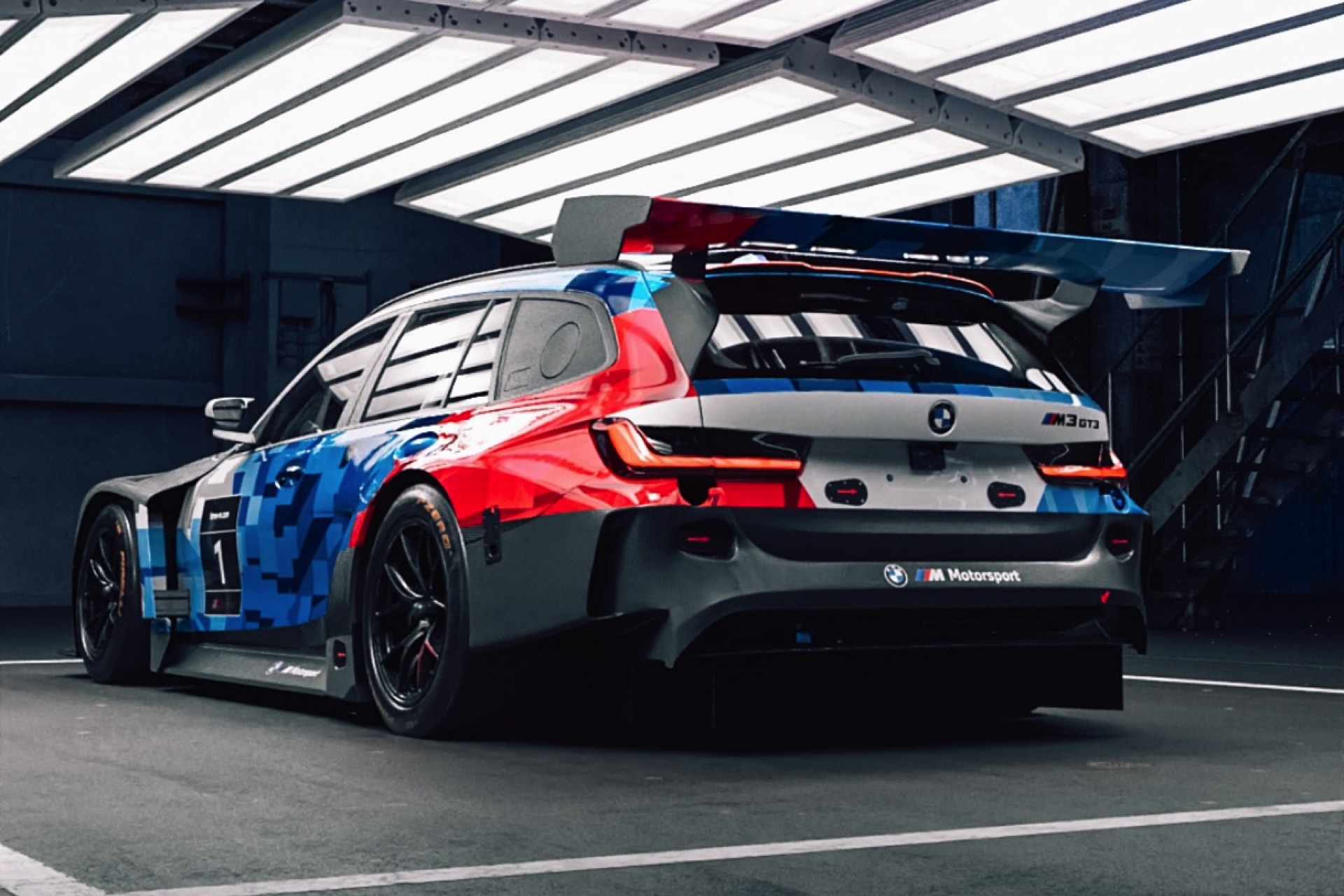 Der BMW M3 GT3 Touring kommt nicht nur mit den dramatisch verbreiterten Kotflügeln des Renn-M4, sondern auch mit einem riesigen Heckflügel: Der XXL-Flügel ist direkt an der Heckklappe befestigt und verspricht gemeinsam mit dem schwarz abgesetzten Diffusor erheblich mehr Anpressdruck an der Hinterachse. Die Front wird unterdessen von einem großen Splitter auf den Asphalt gedrückt. Der Kombi-Karosserie zum Trotz kommt der GT3-Rennwagen natürlich mit nur einem Sitz für den Fahrer, der zudem weit nach hinten versetzt ist. Statt Rückbank und Gepäckraum sehen wir einen Überroll-Käfig, der im Fall der Fälle für zusätzliche Stabilität und Sicherheit sorgen würde. "