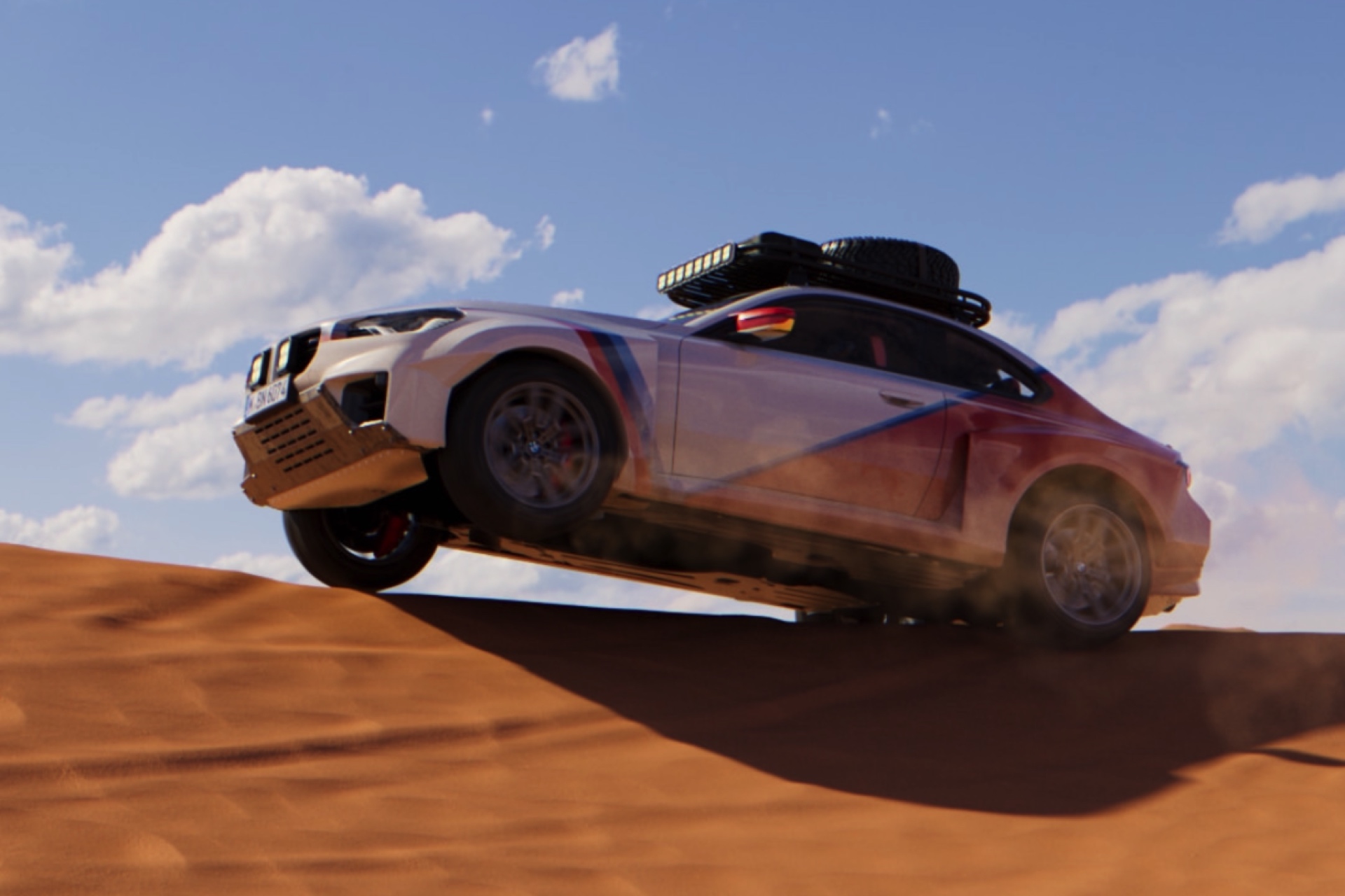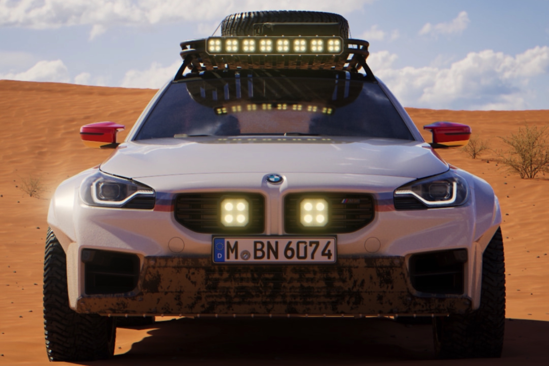 Setzt sich der BMW M2 Dakar ins Fahrwasser von Porsche 911 Dakar und Lamborghini Huracán Sterrato? In der gestern gezeigten Form sicherlich nicht, denn die auf dem Account von BMW M präsentierten Renderings entsprechen eher einer waschechten Rallye-Version und könnte auch aus den Hallen des Teams X-Raid stammen: Heftig verbreiterte Kotflügel, Stollenreifen, Unterfahrschutz und mehrere Zentimeter mehr Bodenfreiheit, Zusatz-Beleuchtung in den Nieren und am Dach-Aufbau zum Transport eines Ersatzrads – all das lässt daran zweifeln, dass dieser Rallye-M2 tatsächlich ein Kennzeichen und eine reguläre Straßenzulassung benötigt.
